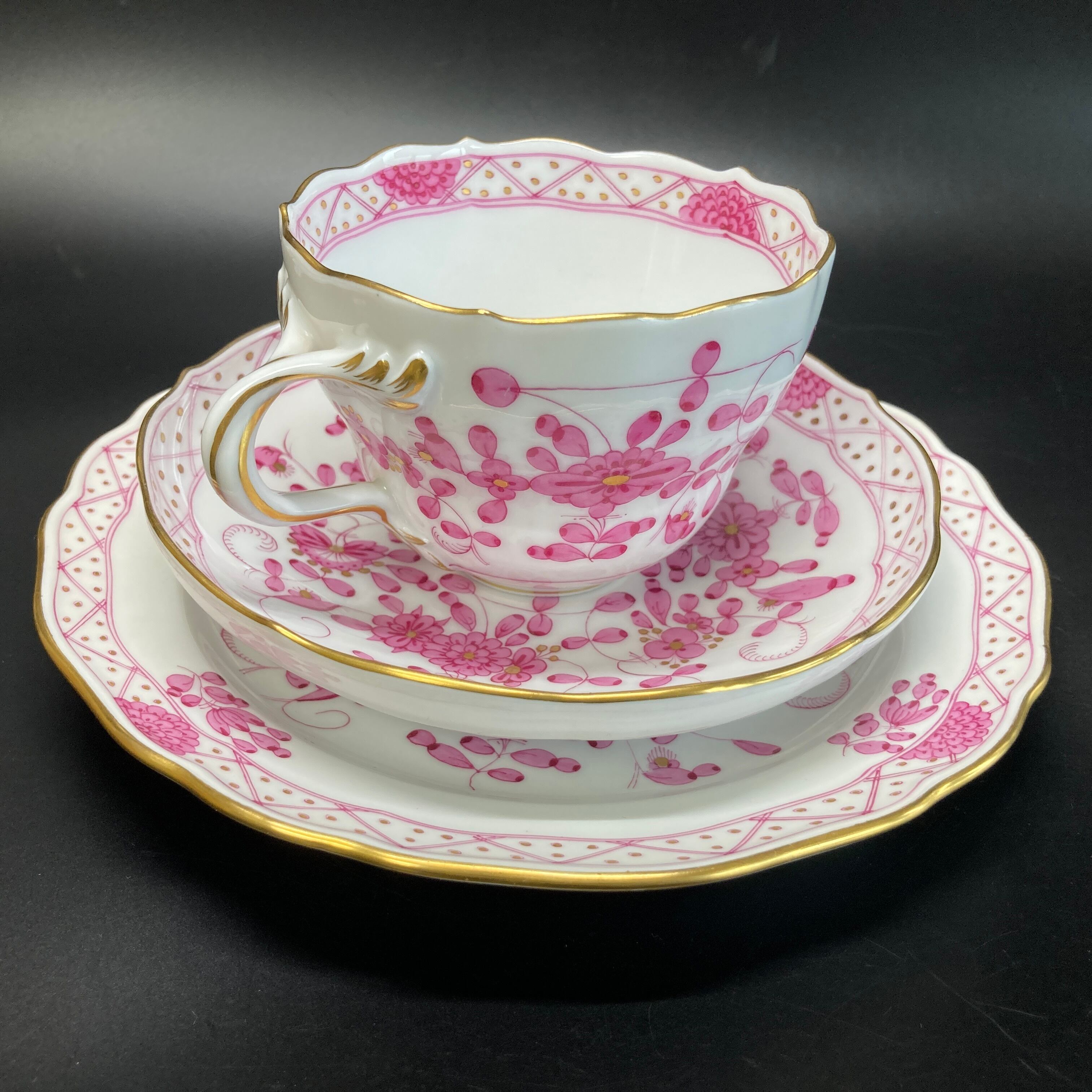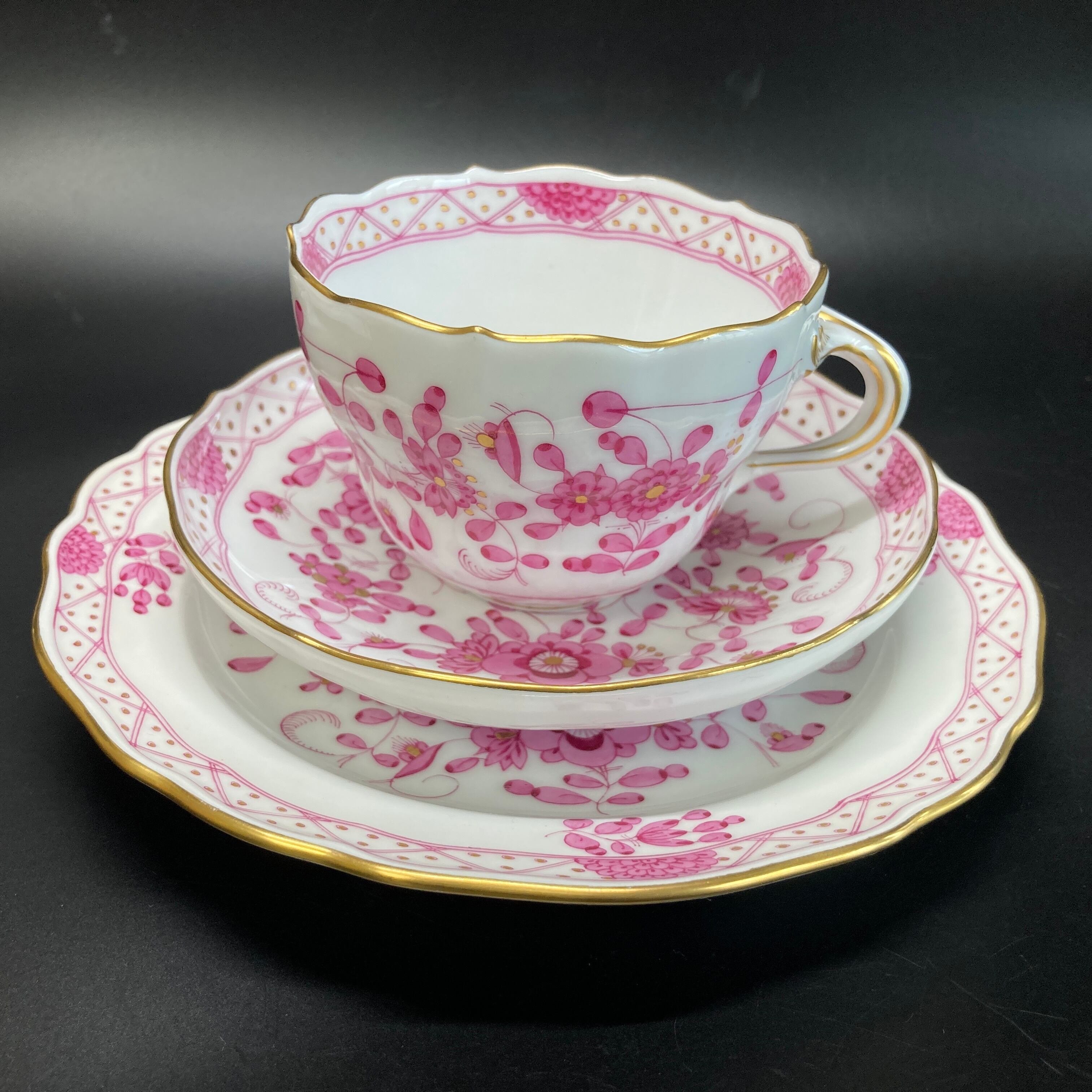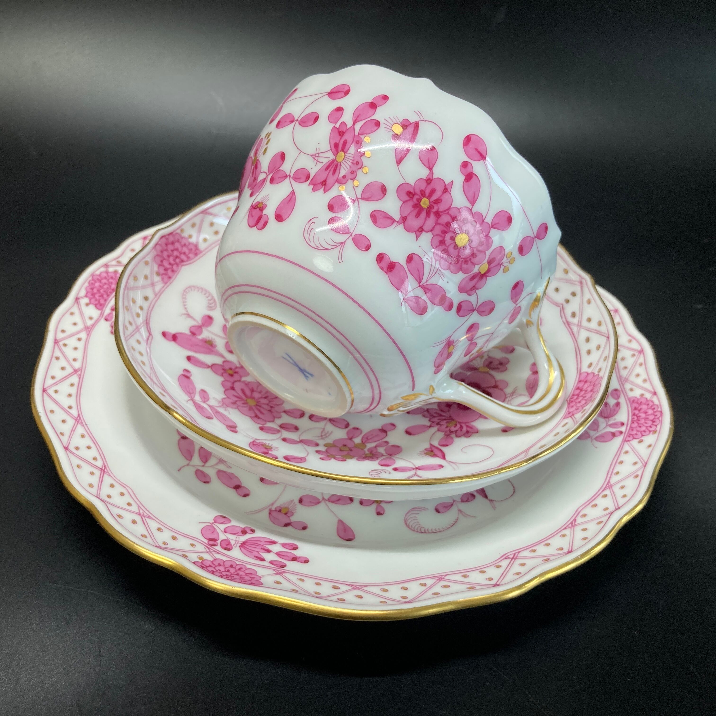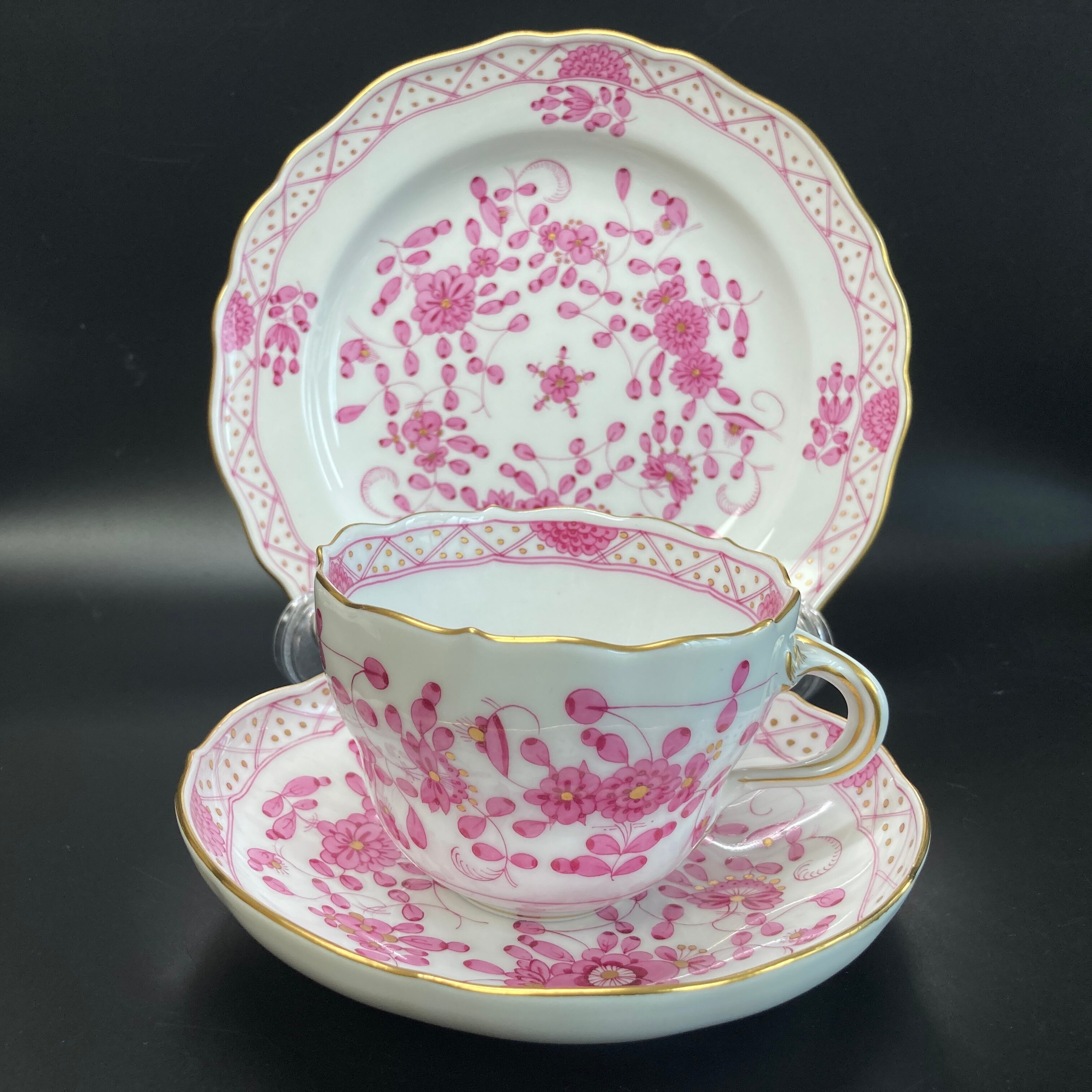 こちらはドイツを代表する名窯、マイセンの大人気シリーズ、インドの華のカップ&ソーサーとデザートプレートのフルサイズのトリオセット です。