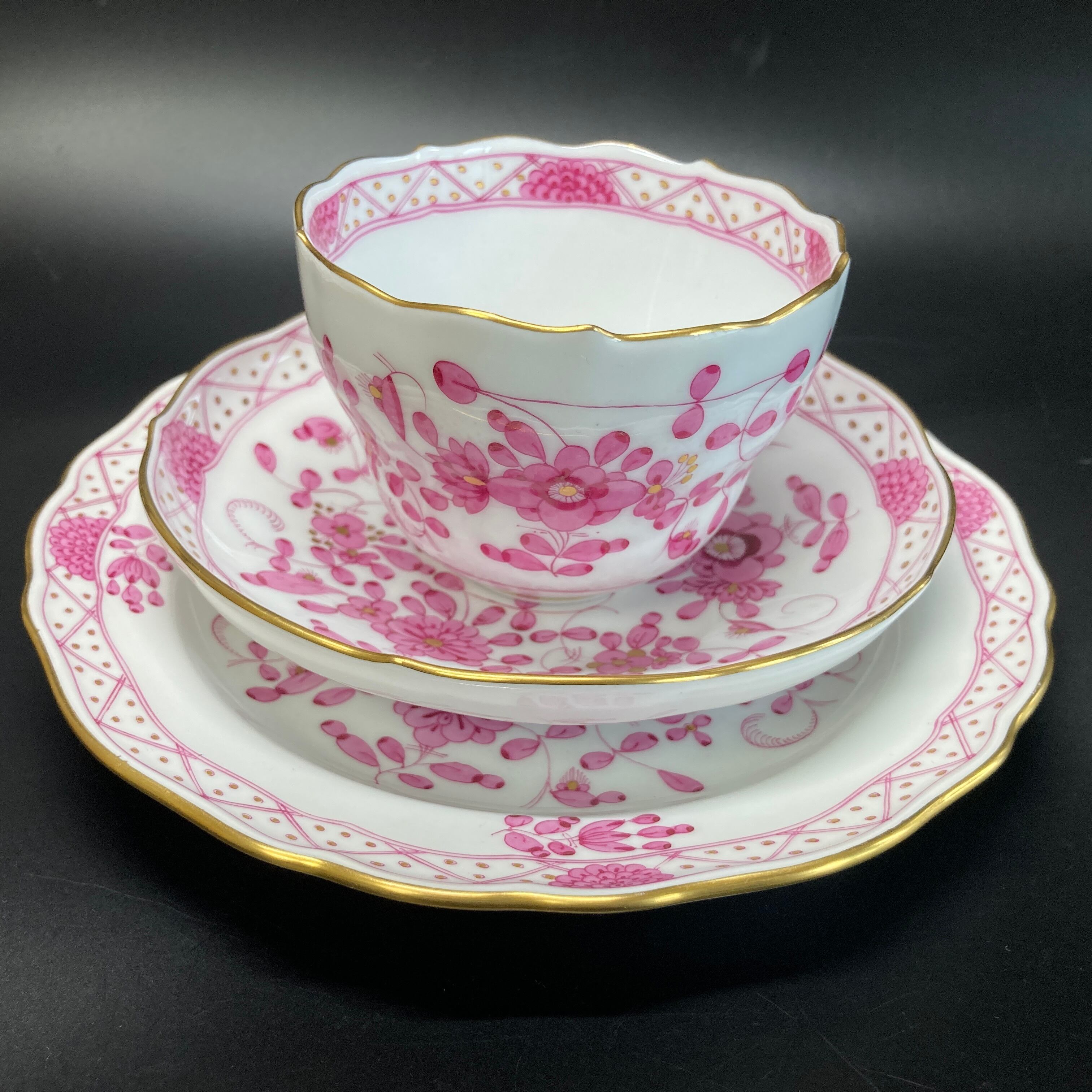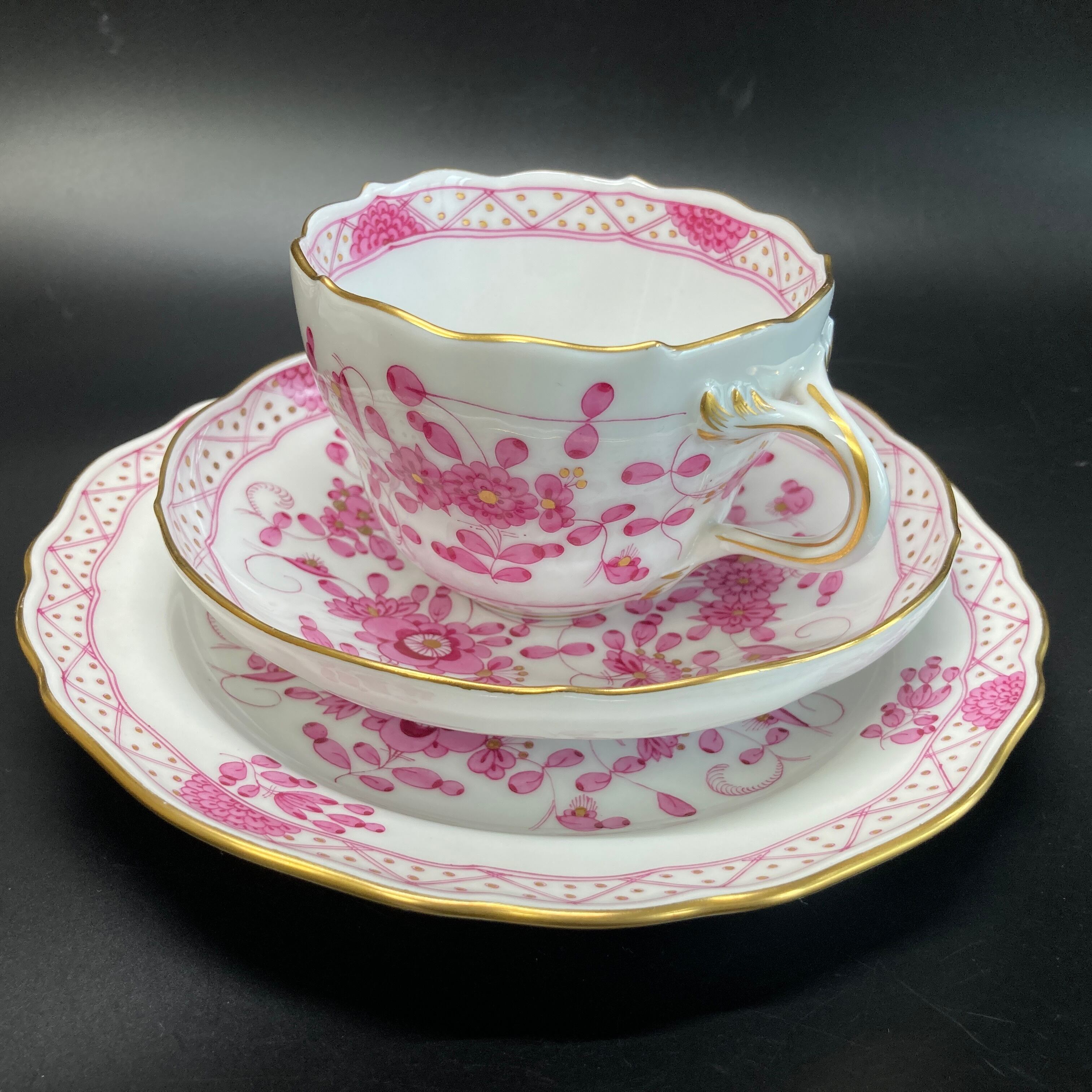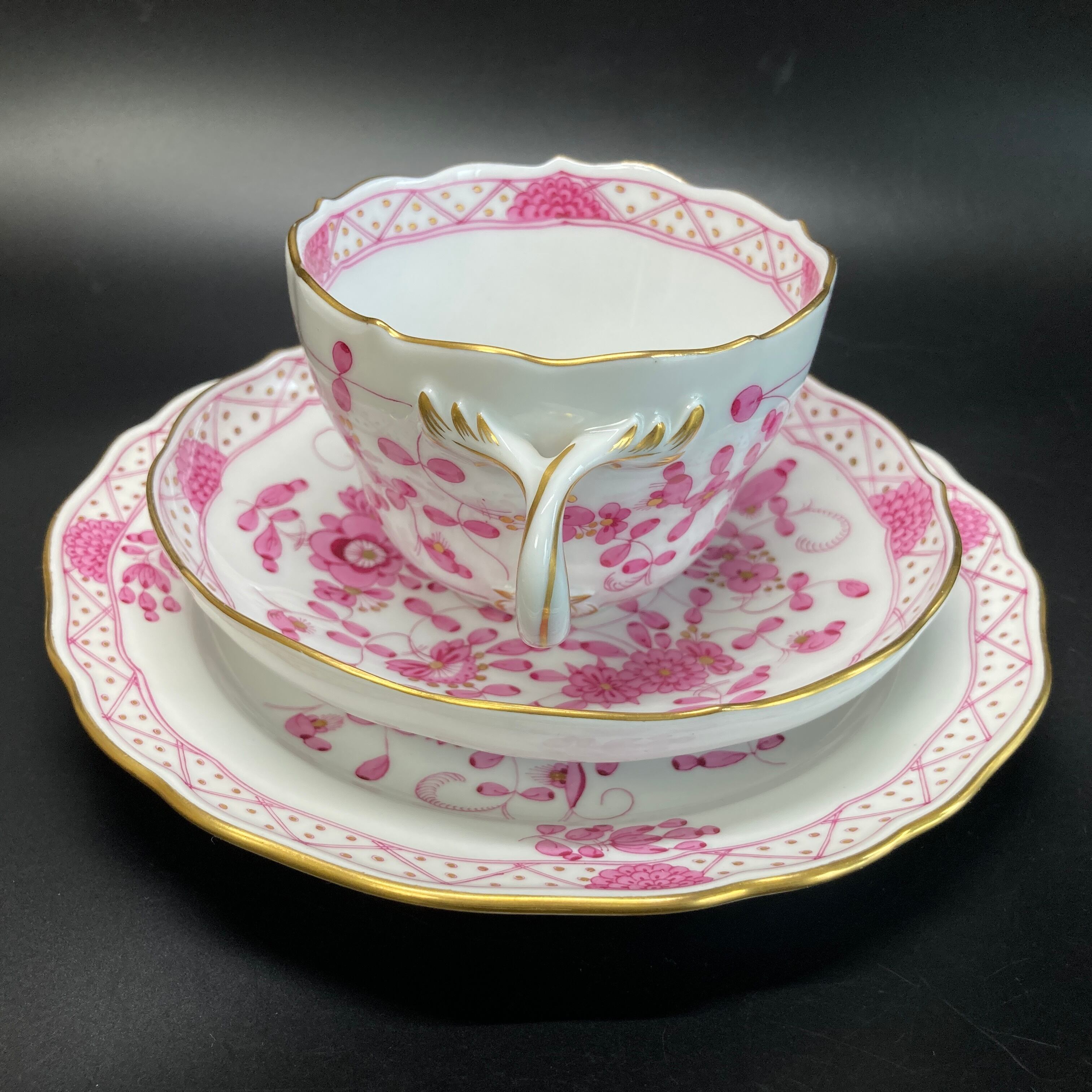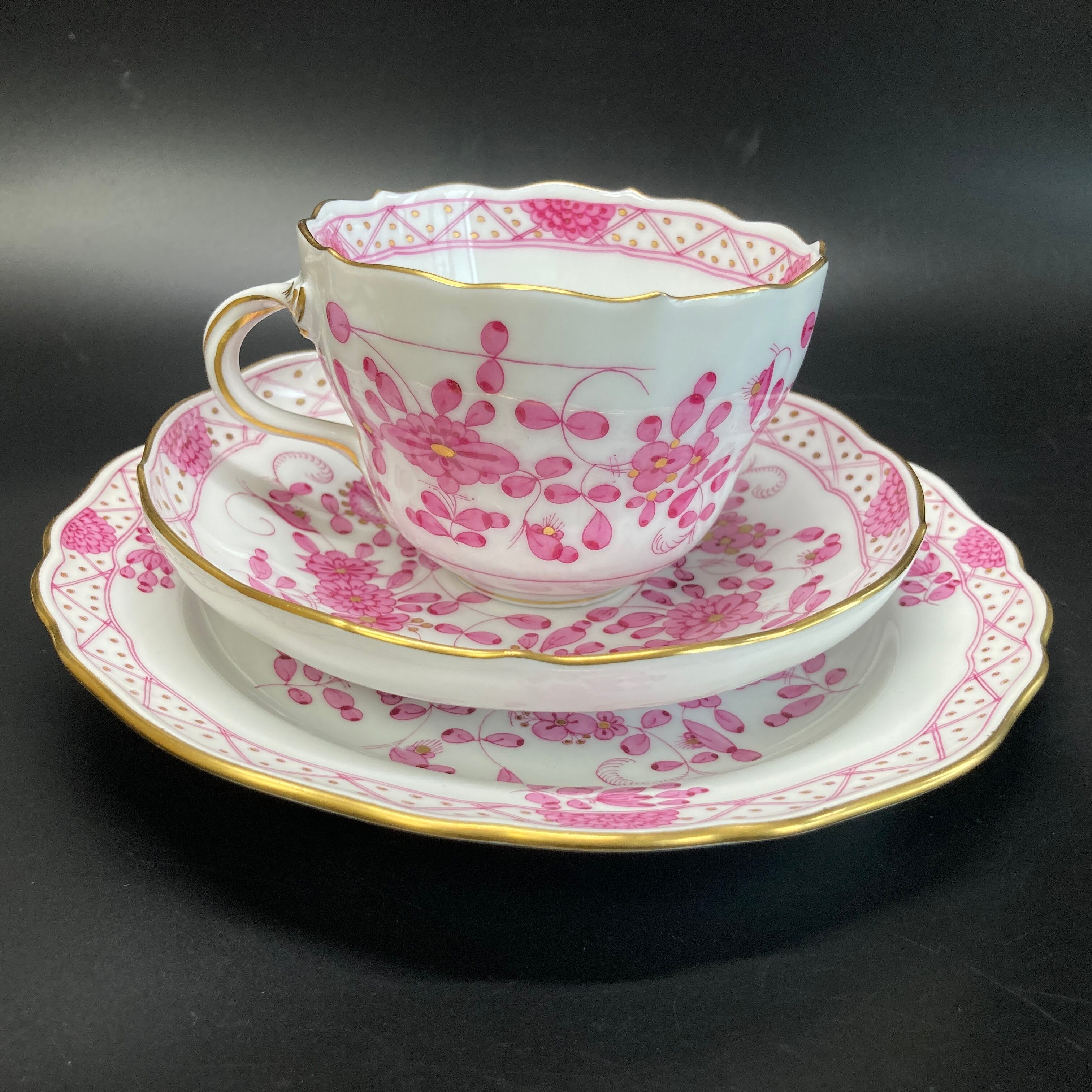 こちらはドイツを代表する名窯、マイセンの大人気シリーズ、インドの華のカップ&ソーサーとデザートプレートのフルサイズのトリオセット です。