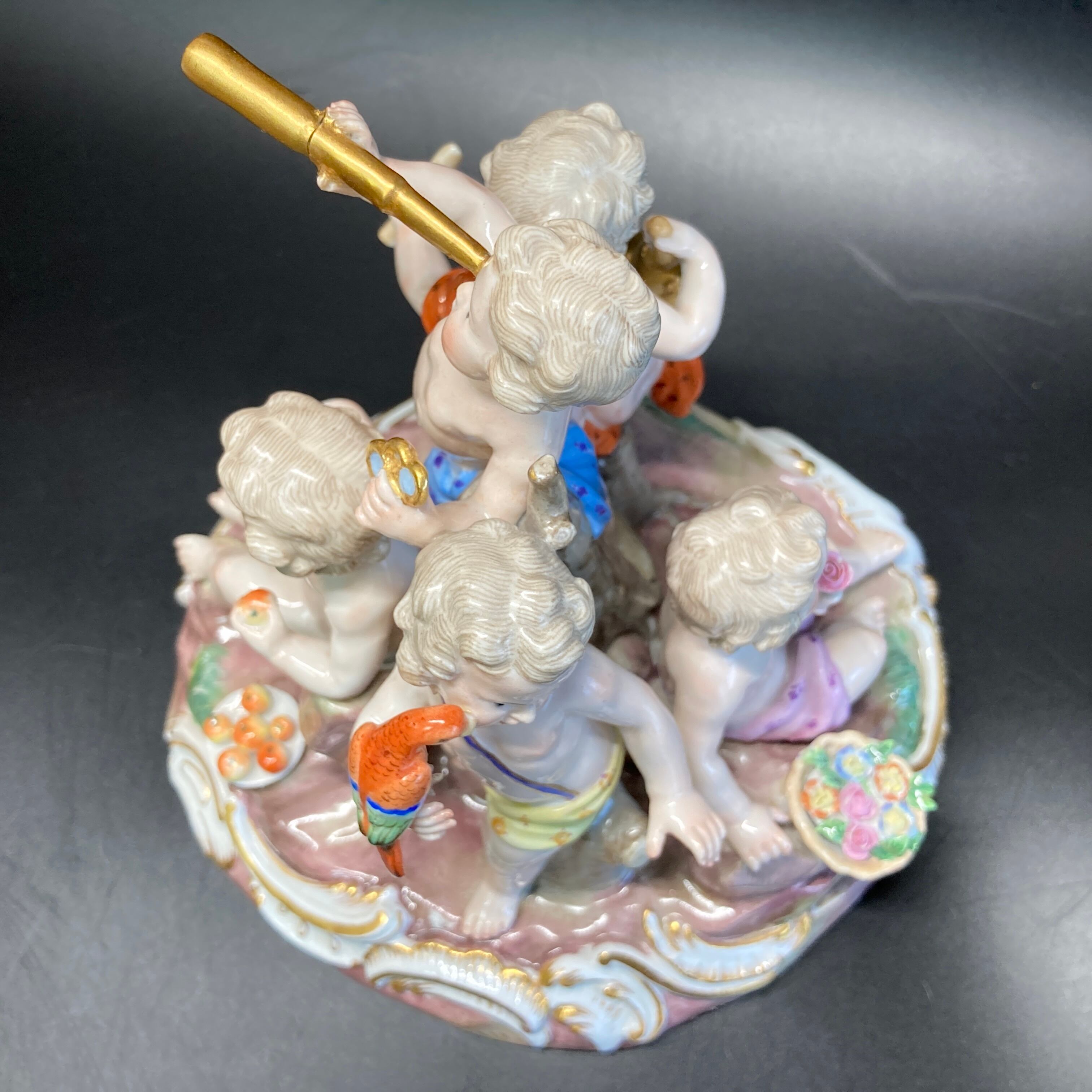 マイセン人形の特徴故、細かな部分が欠損していたり紛失している物がほとんどですが、こちらの個体では奇跡的に全ての部分が残っており、壊れやすい子供の指先等の部分も完璧に残っております。