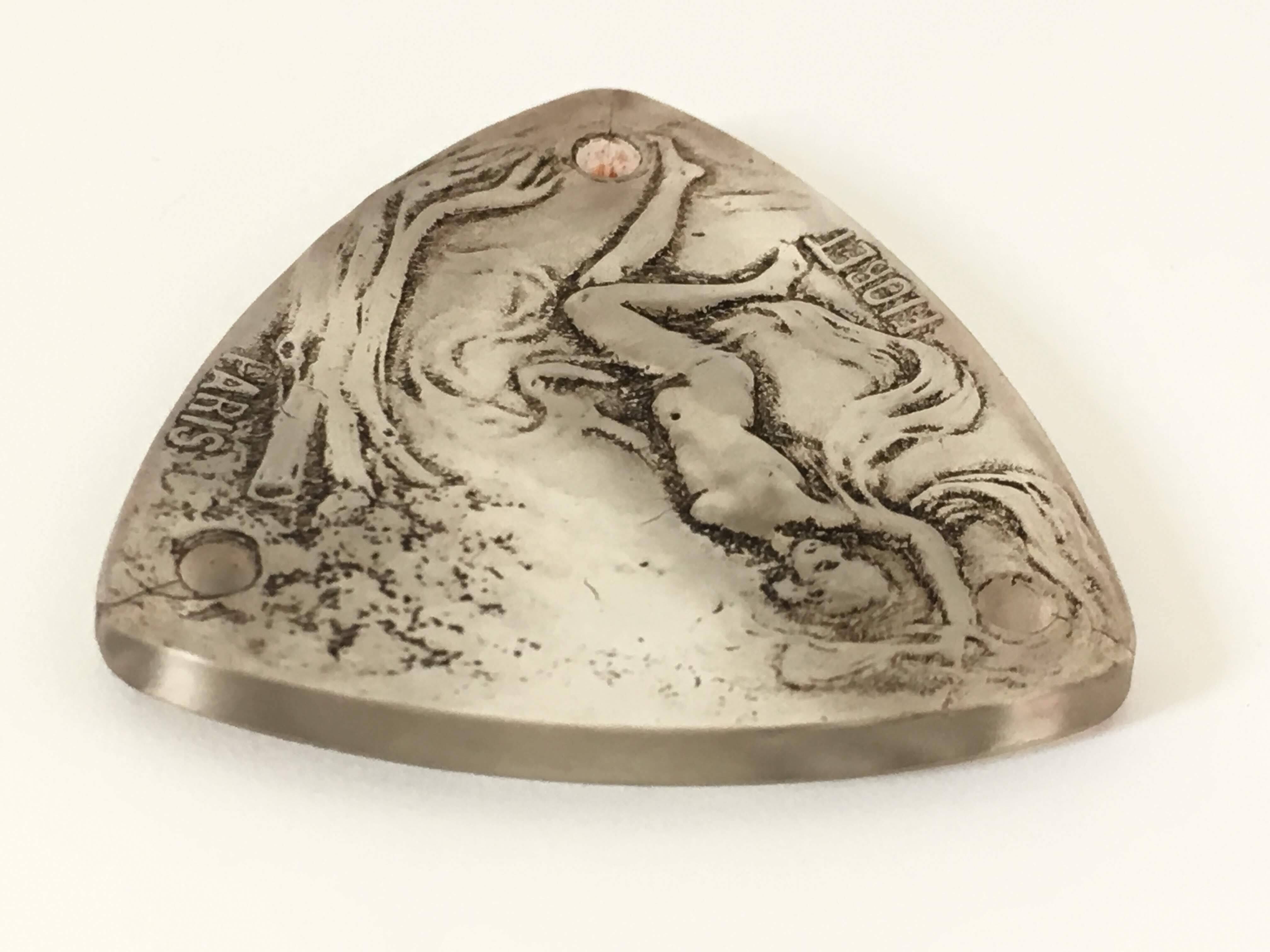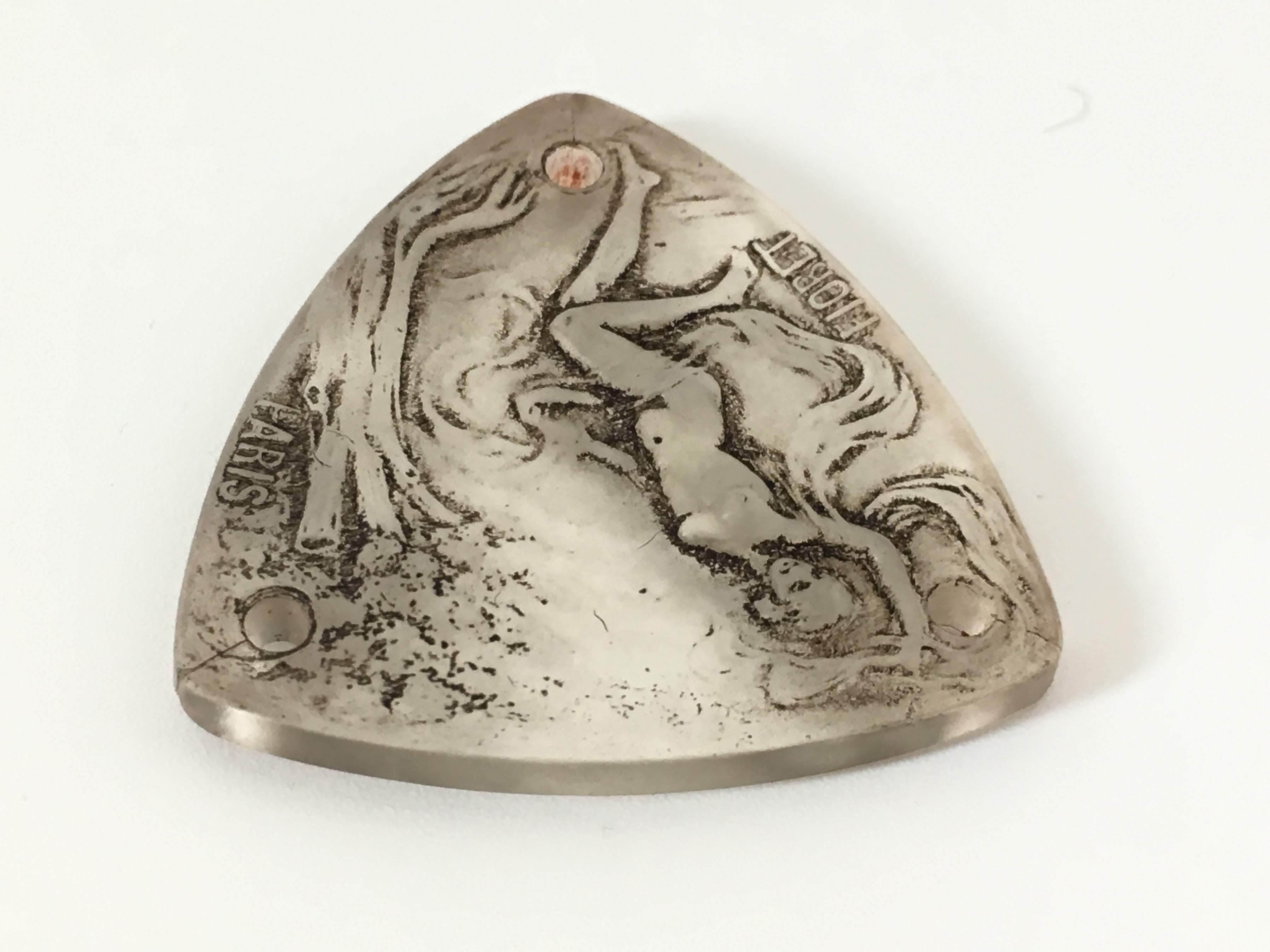 プレス成形で作られた三角形のメダルには、森の中を優雅に舞う女性の姿が生き生きとデザインされています。
