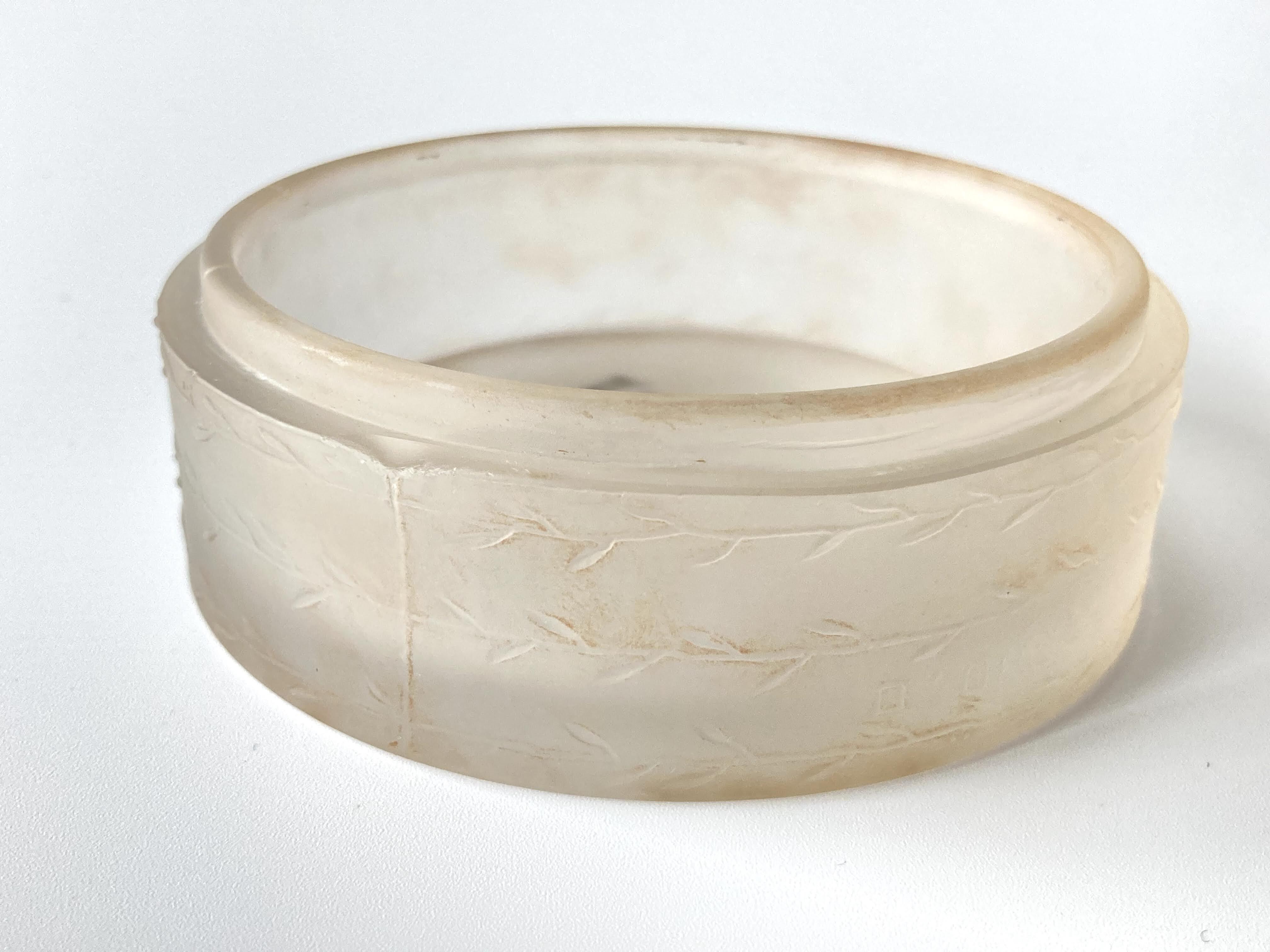 また、全体はフロスト加工により乳白色に仕上げられ、薄褐色のパチネが施されています。パチネ彩色により女性や植物の陰影が強調され、非常に雰囲気のある表情に仕上がっています。経年によりパチネは薄くなっております。