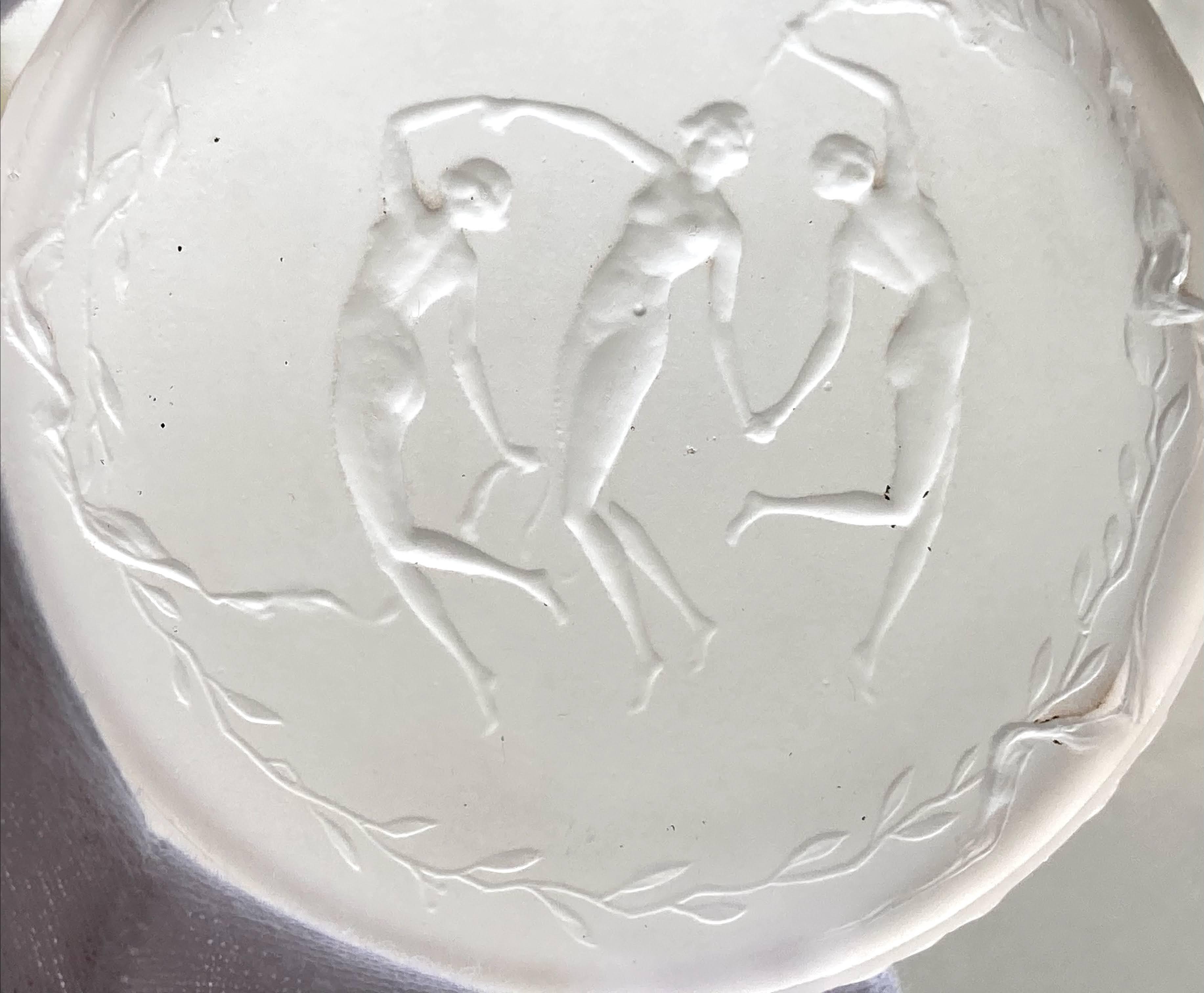 プレス成形で作られた円形の入れ物には、森の中を優雅に舞う3人の女神の姿が生き生きとデザインされています。