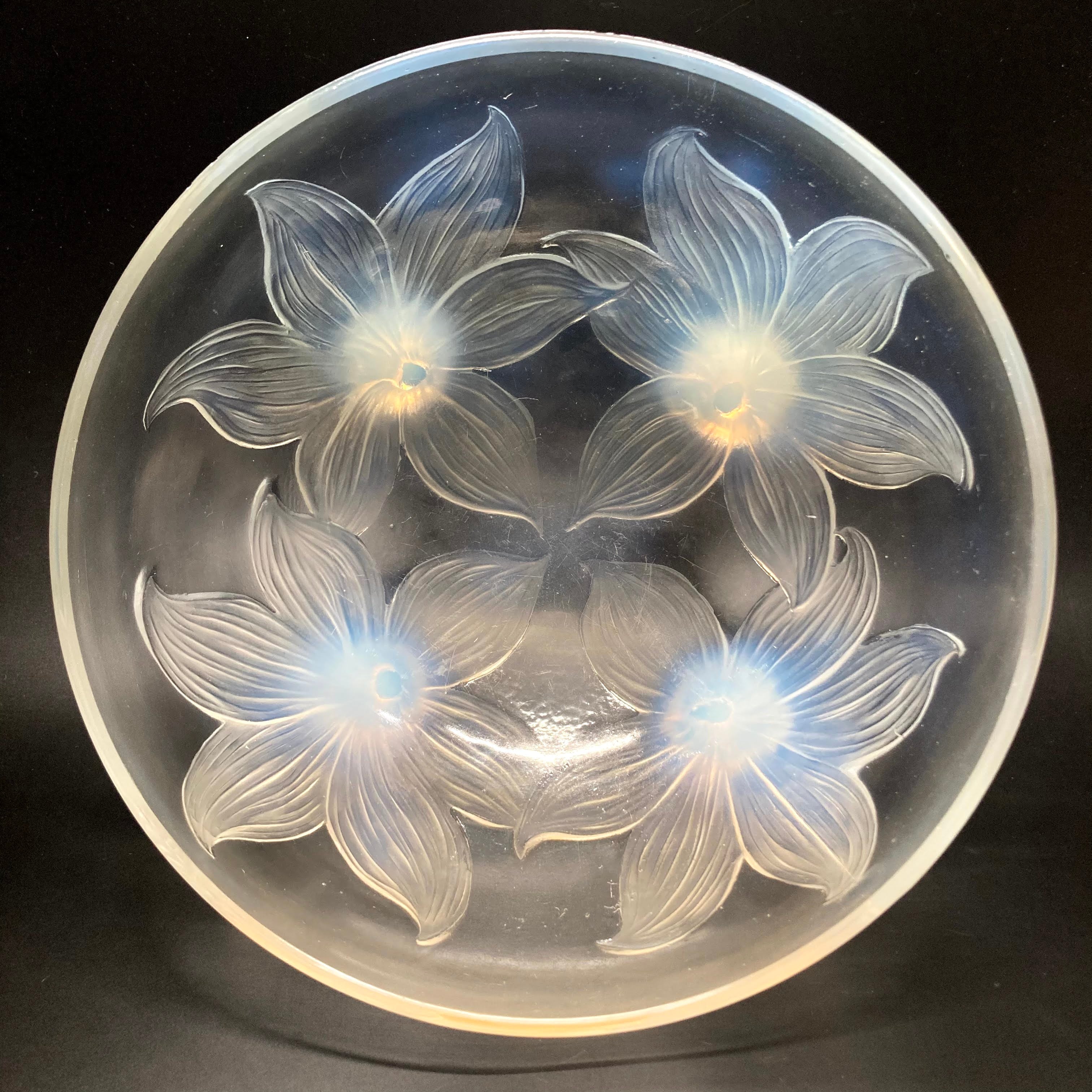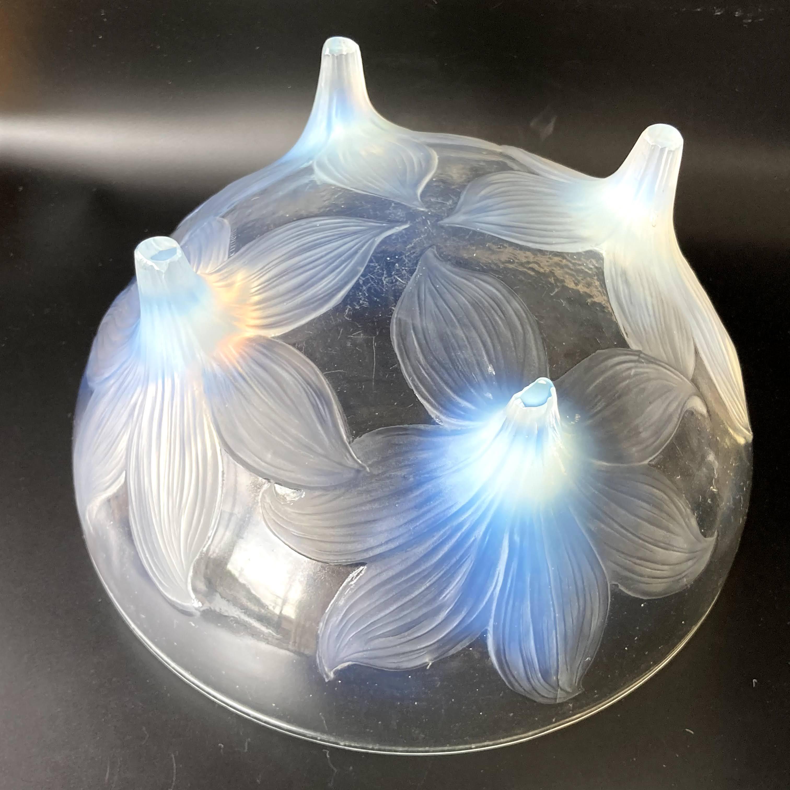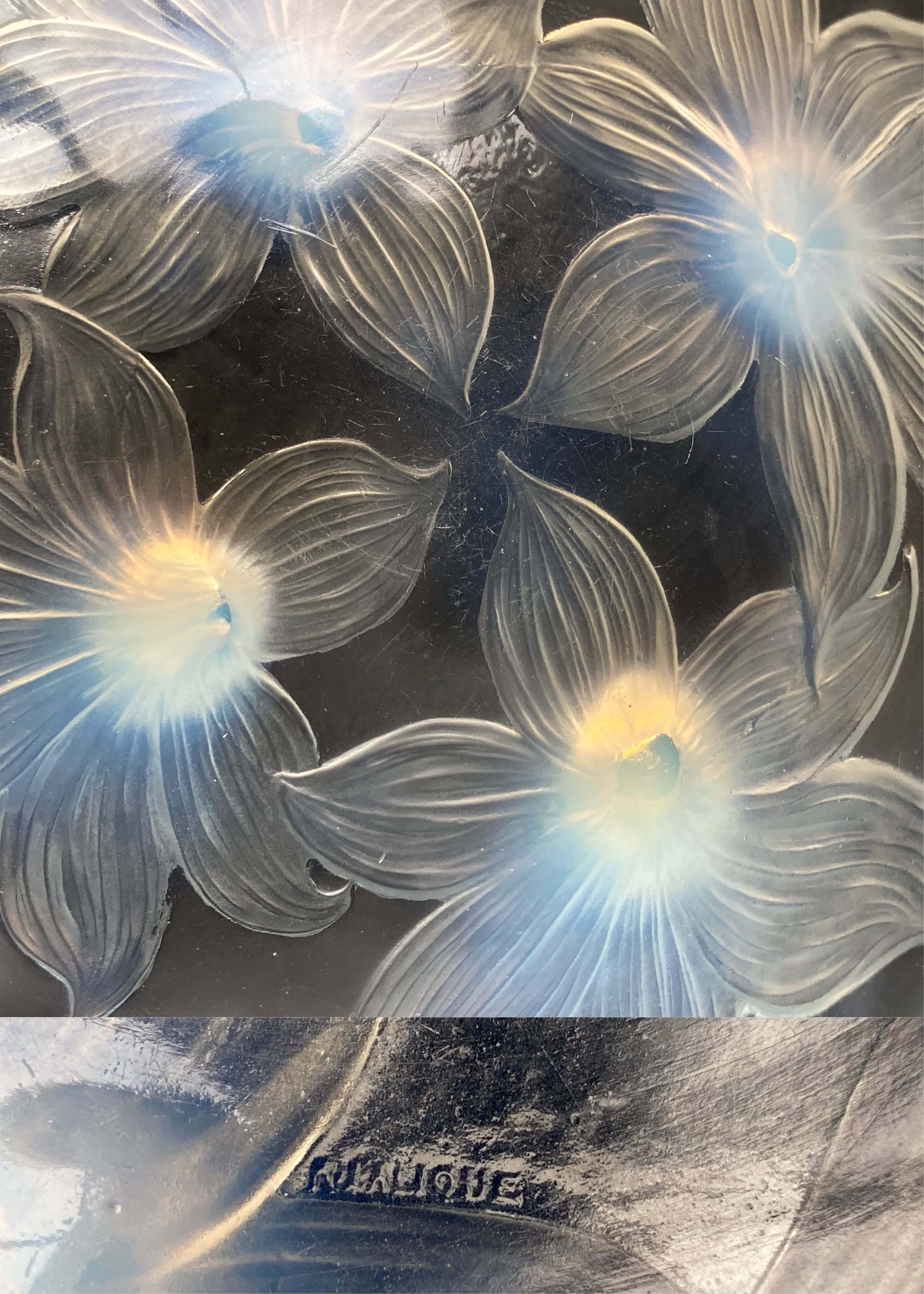 本品はルネ・ラリック作品で特徴的な、美しいブルーオパルセントガラスが用いられており、光を受けると百合の中心に光が集約され、その立体的なレリーフがより浮かび上がる 素晴らしい作品となります。