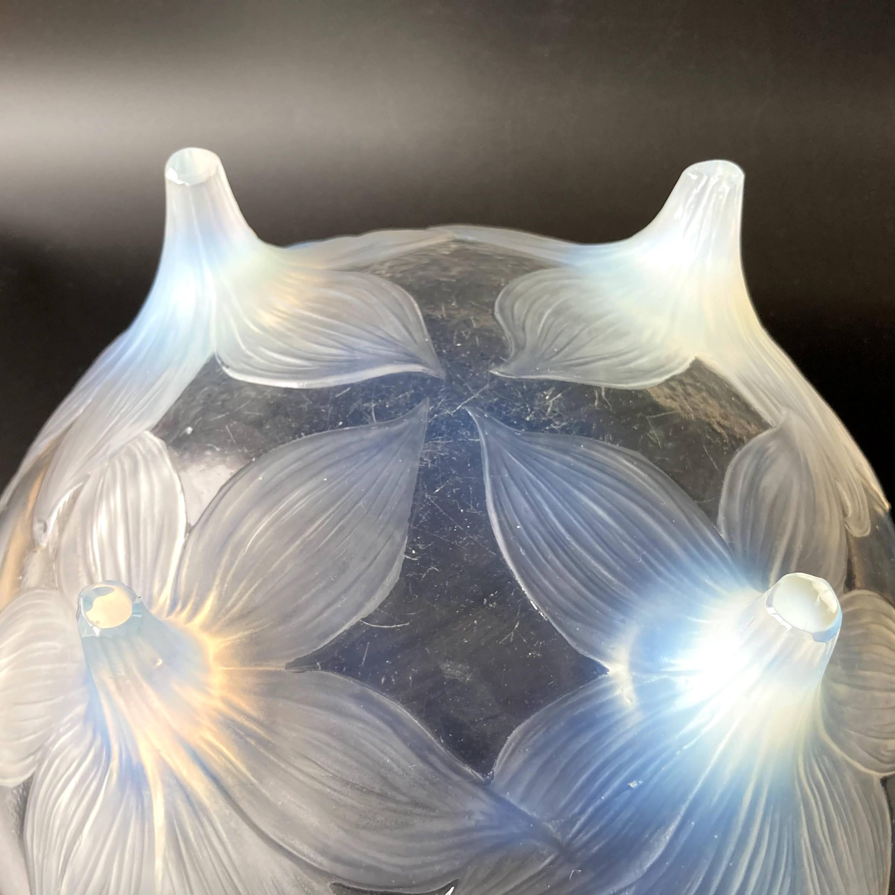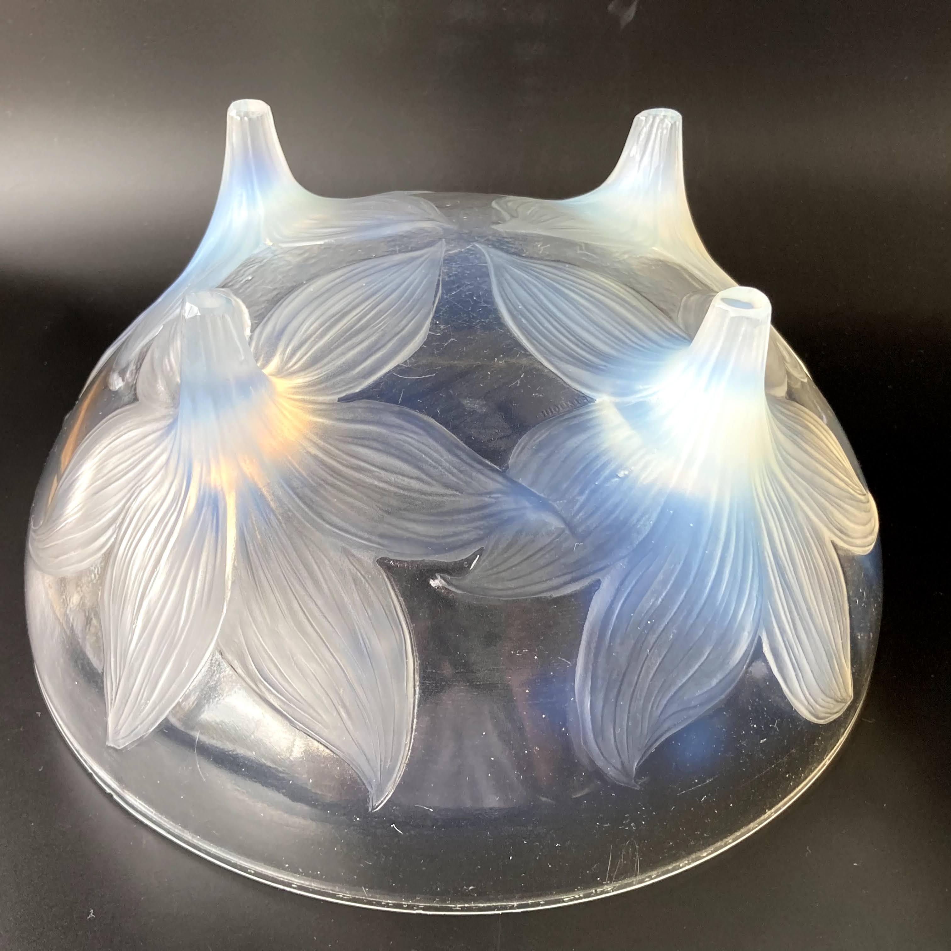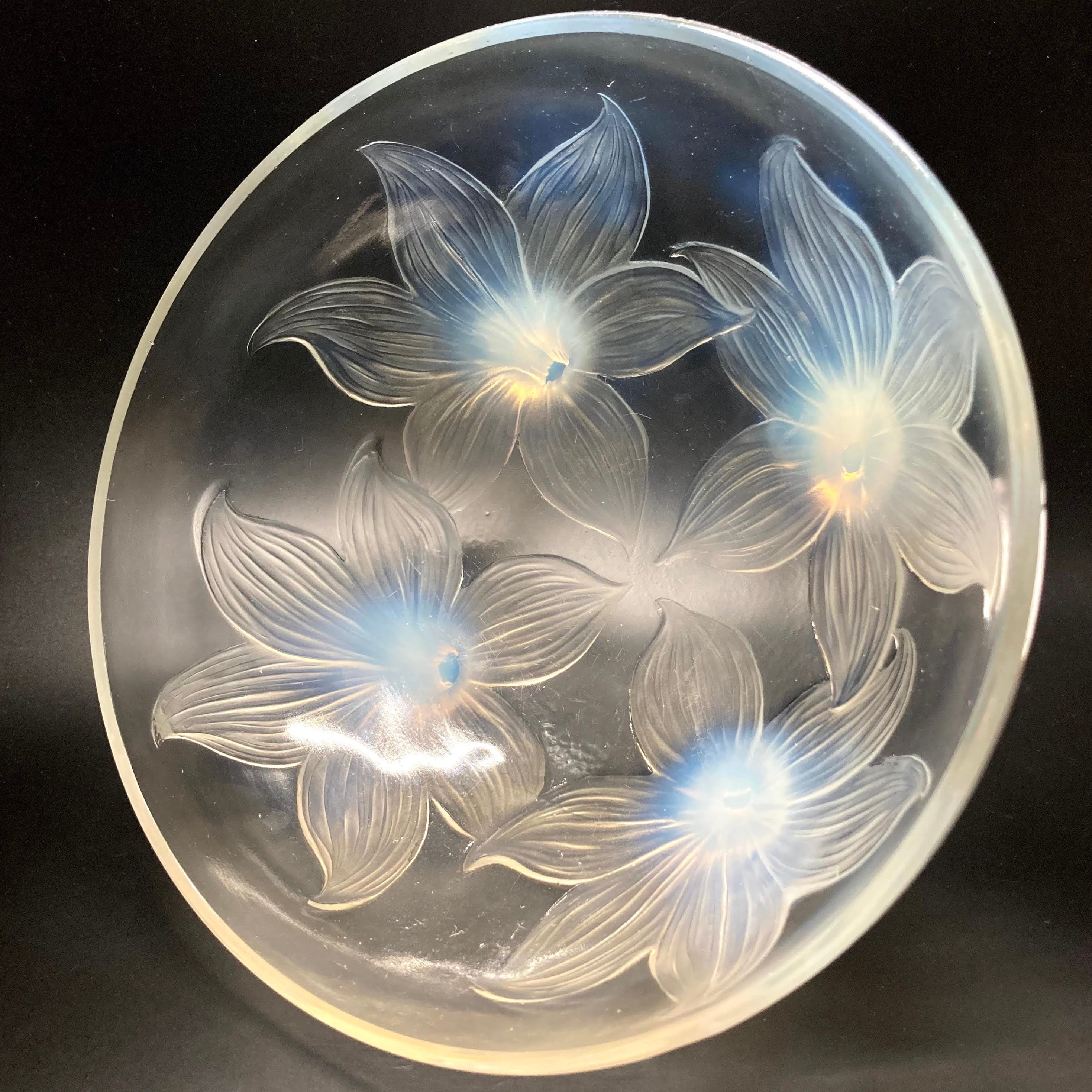 本品はルネ・ラリック作品で特徴的な、美しいブルーオパルセントガラスが用いられており、光を受けると百合の中心に光が集約され、その立体的なレリーフがより浮かび上がる 素晴らしい作品となります。