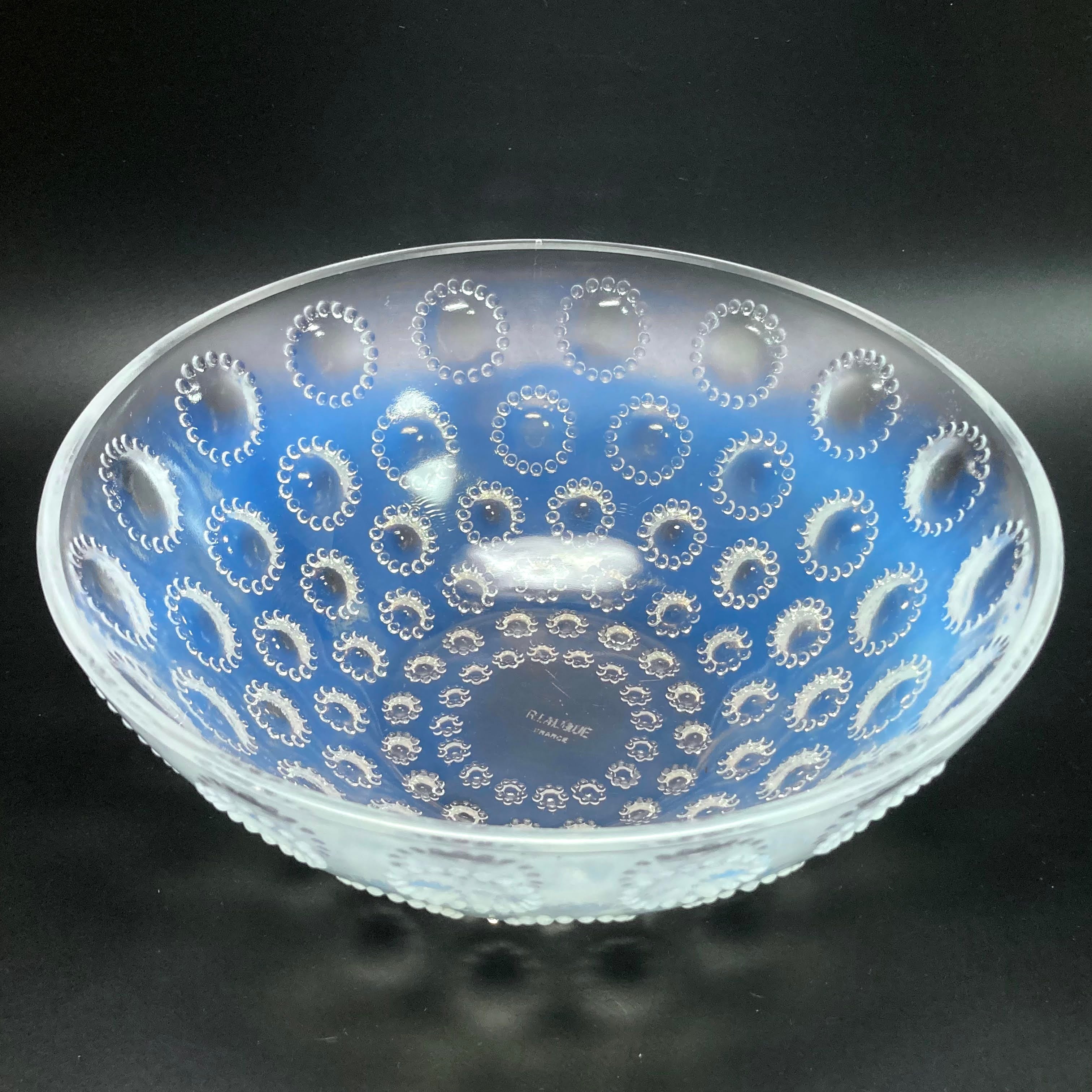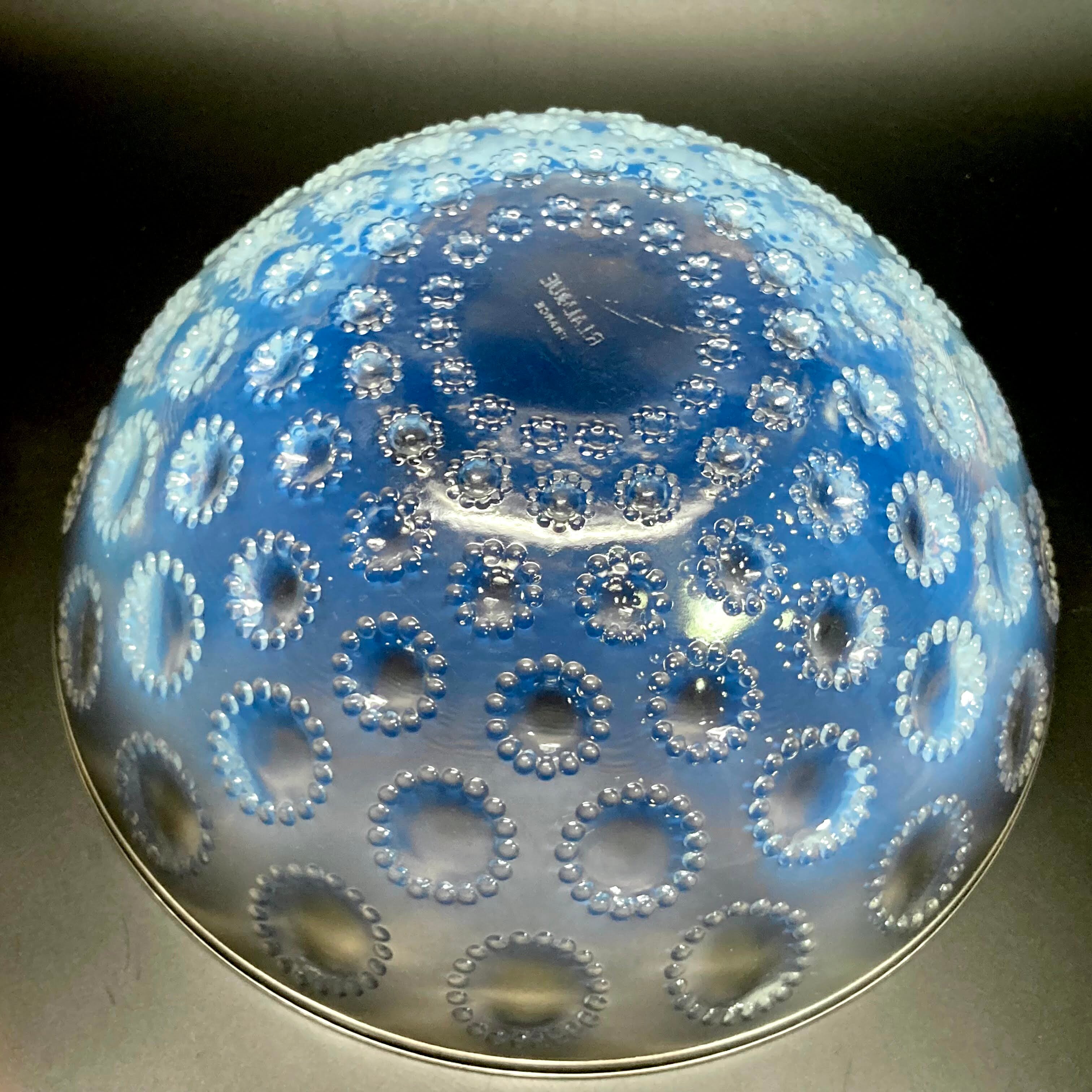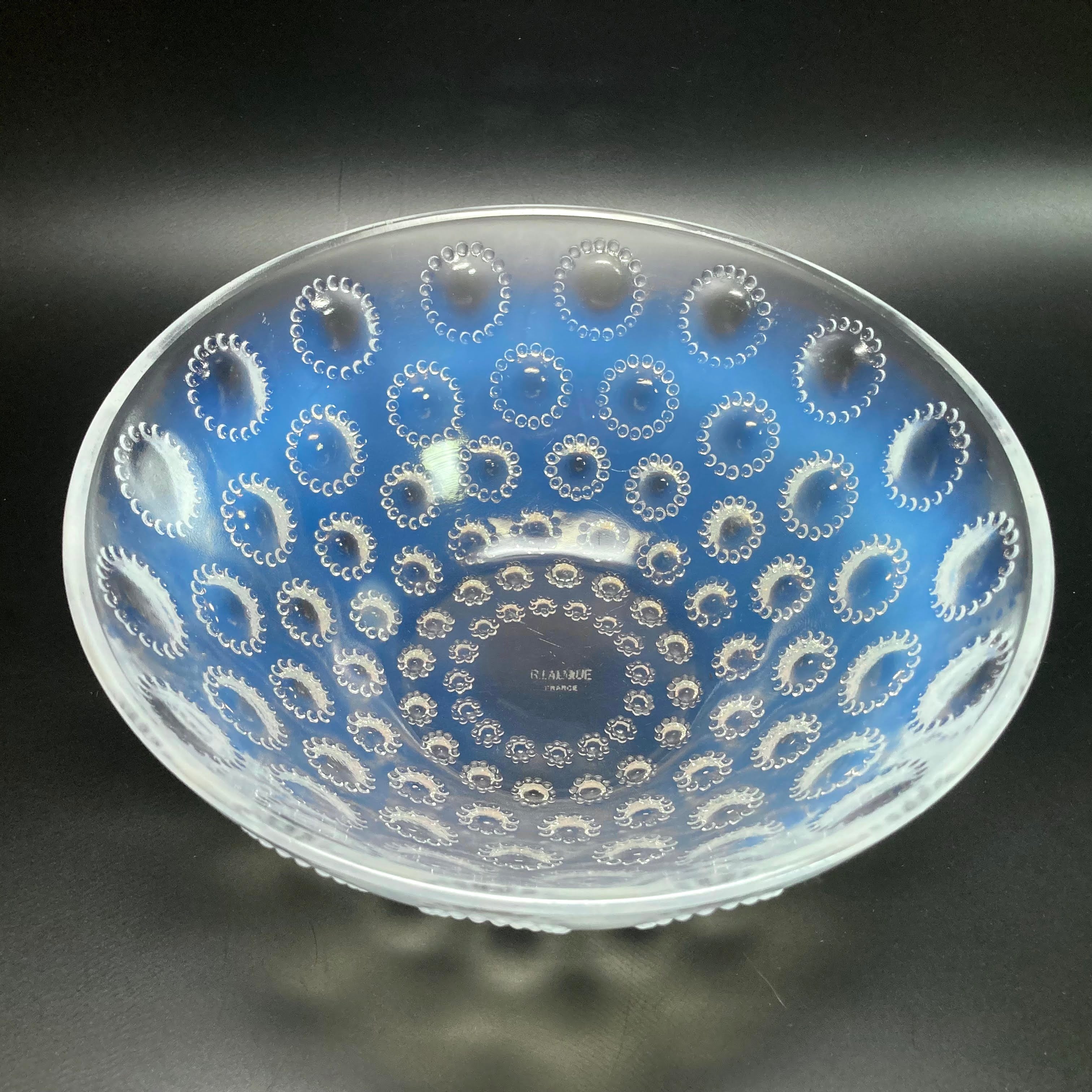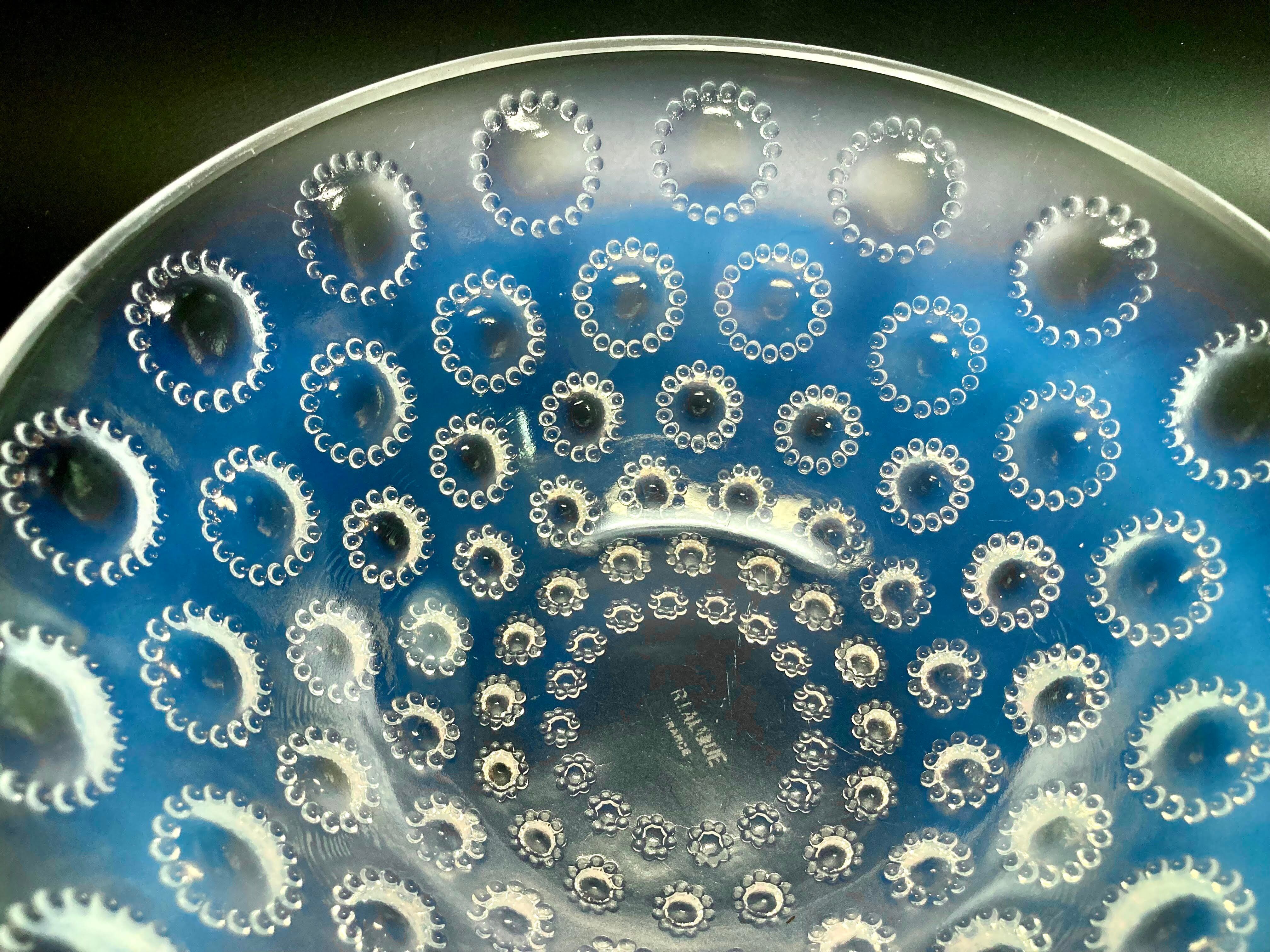 また、本品はルネ・ラリック作品で特徴的な美しいブルーオパルセント硝子による作品となり、より一層紋様が浮かび上がる素晴らしい作品となります。