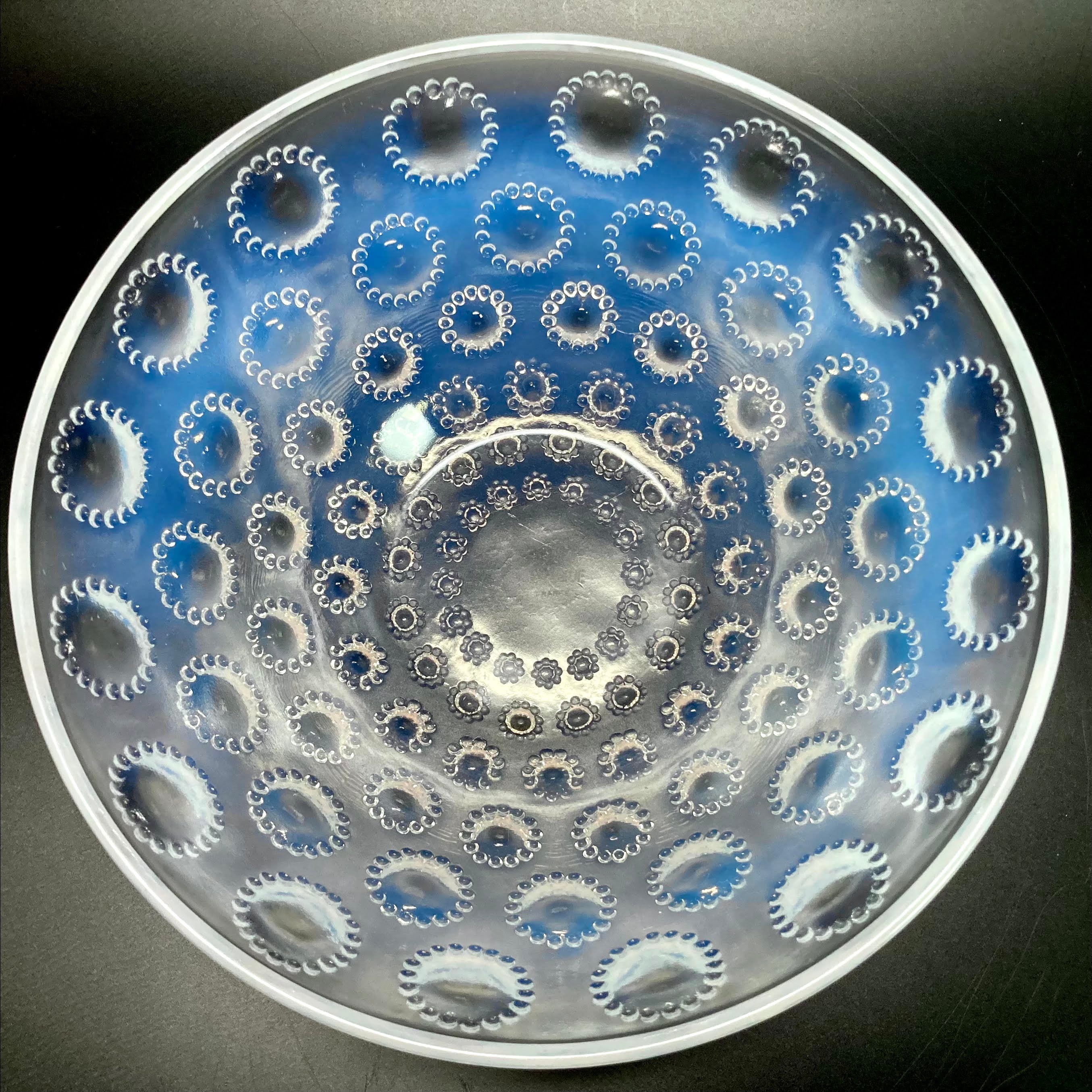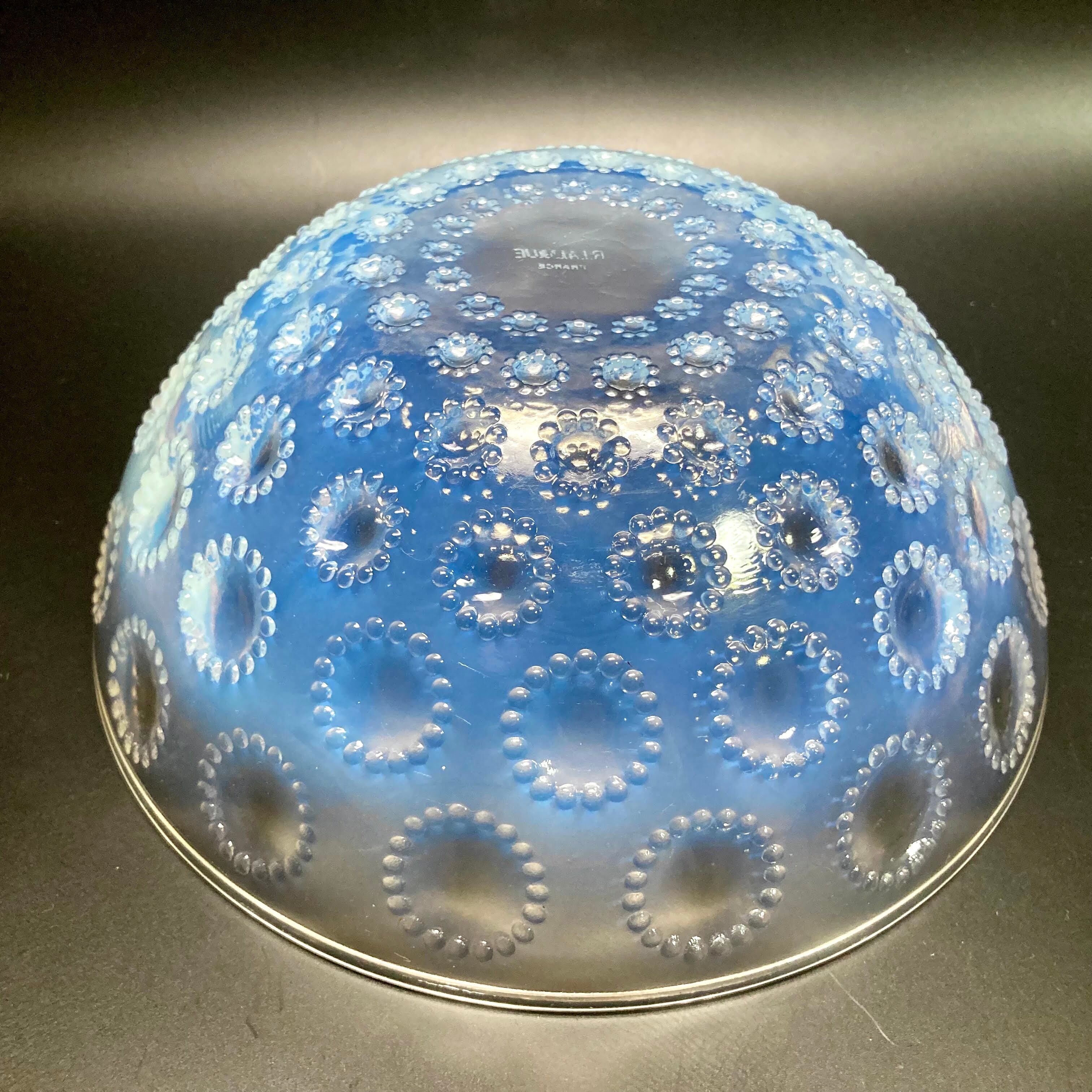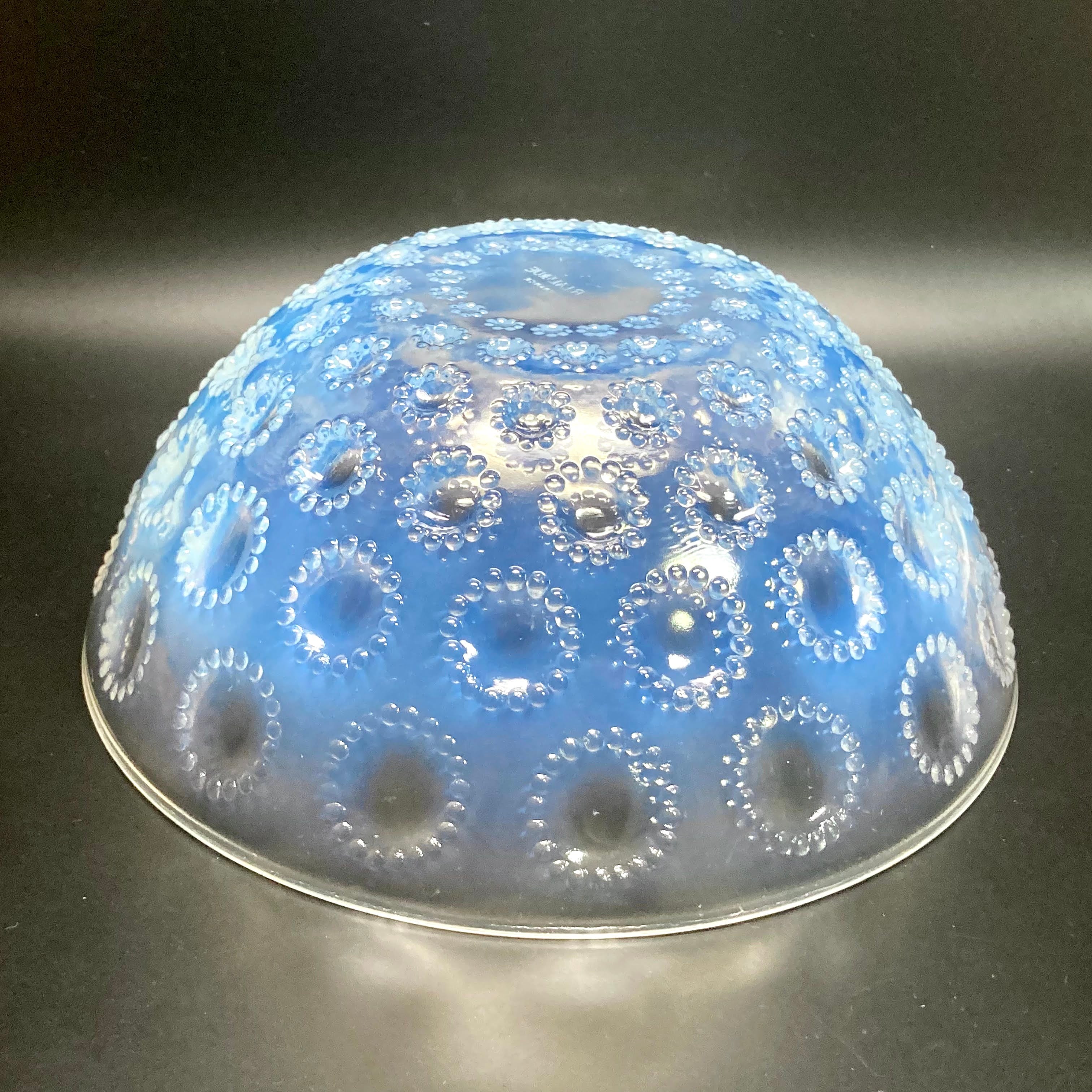 また、本品はルネ・ラリック作品で特徴的な美しいブルーオパルセント硝子による作品となり、より一層紋様が浮かび上がる素晴らしい作品となります。