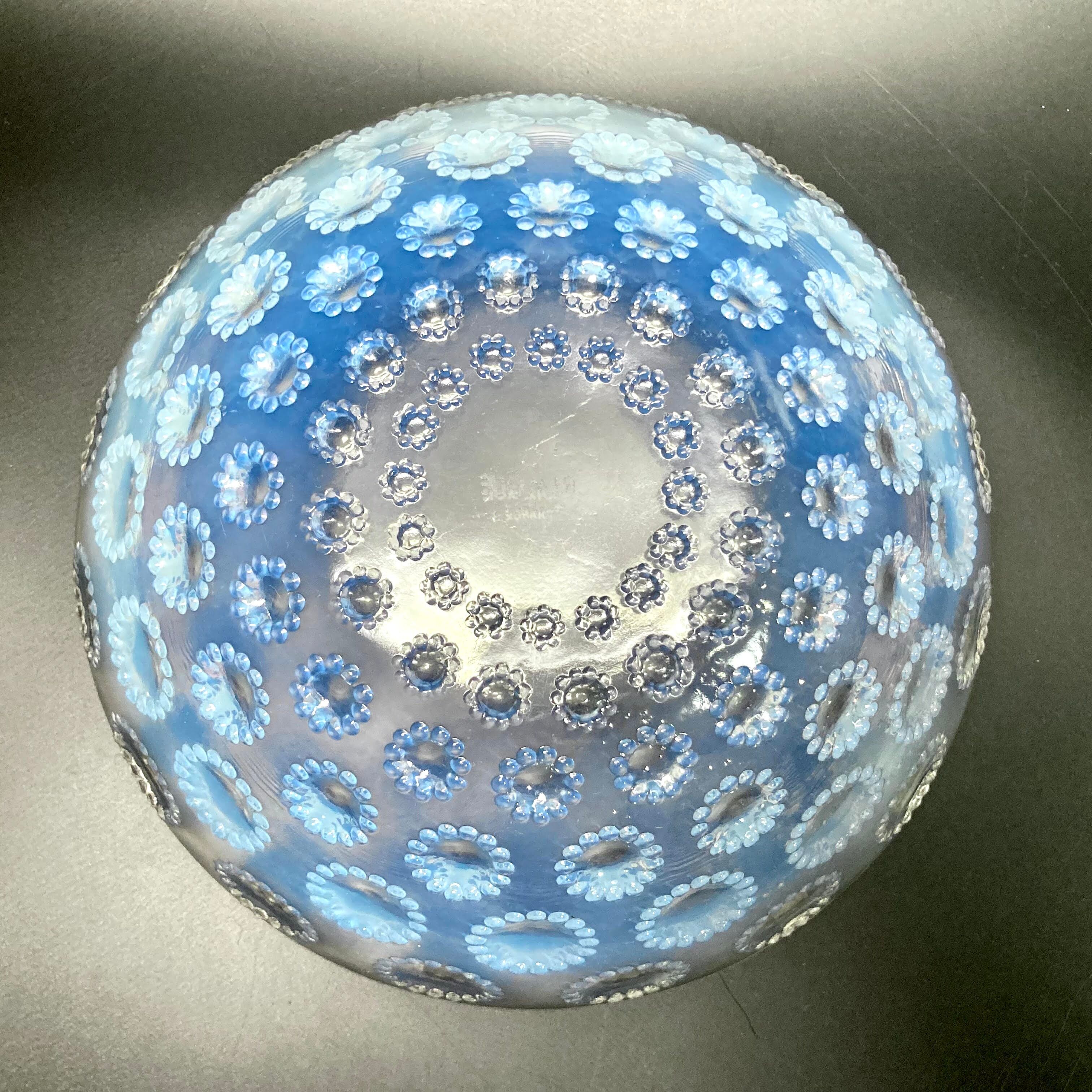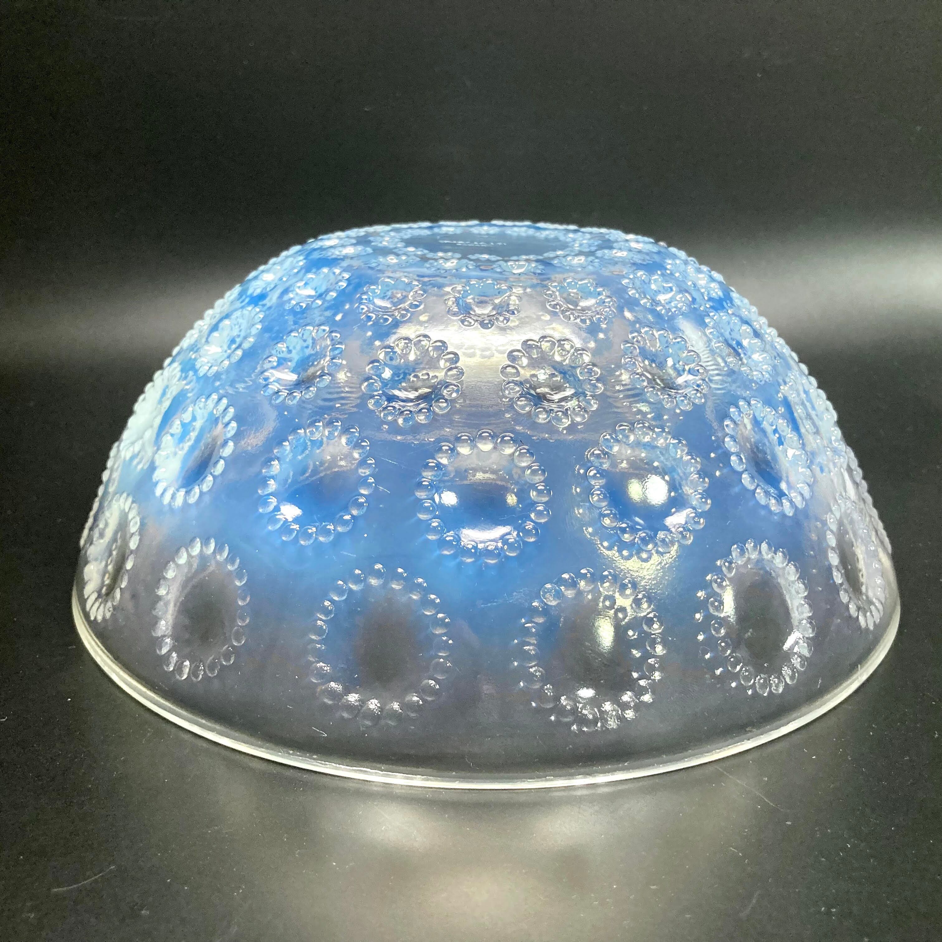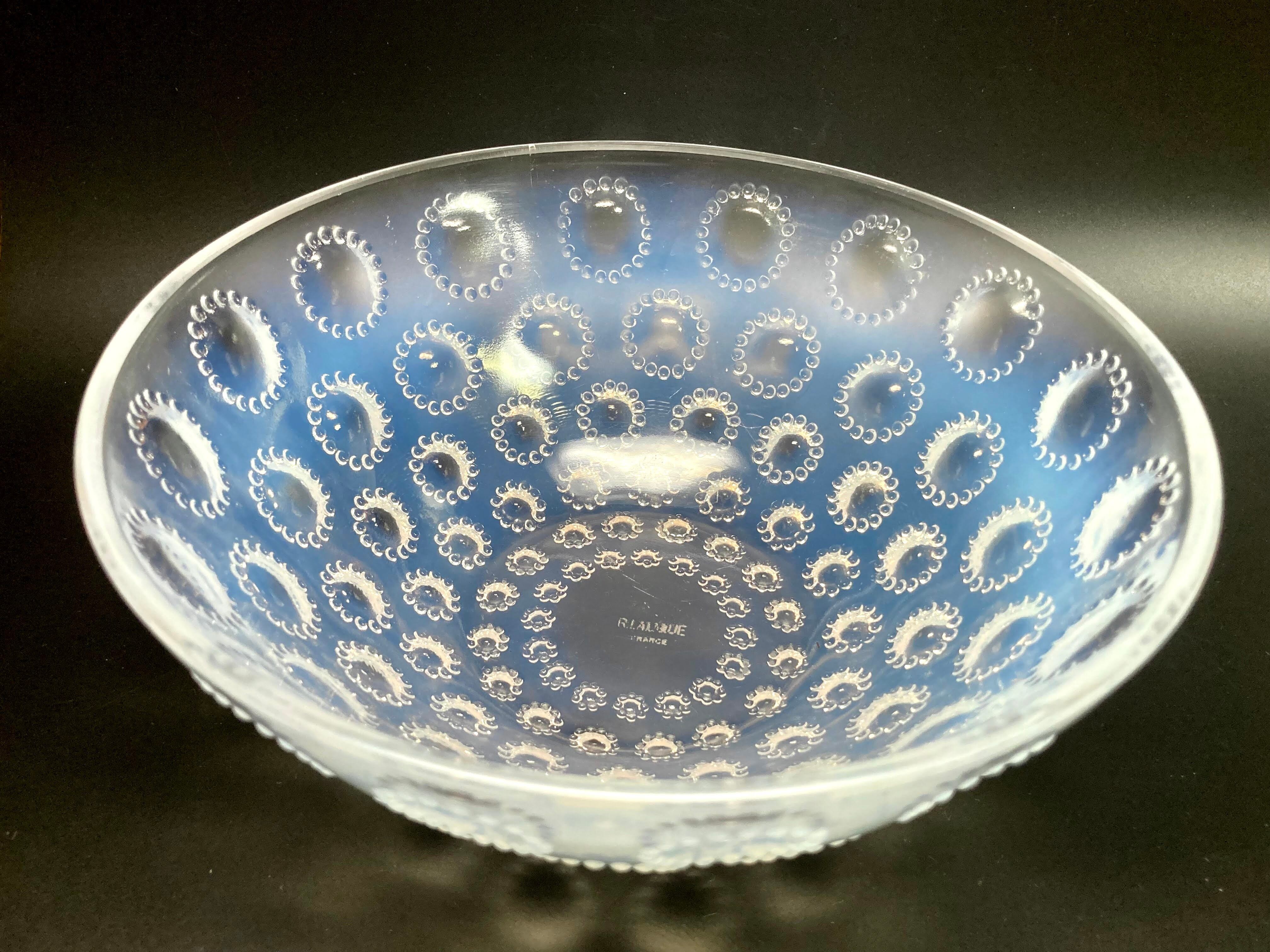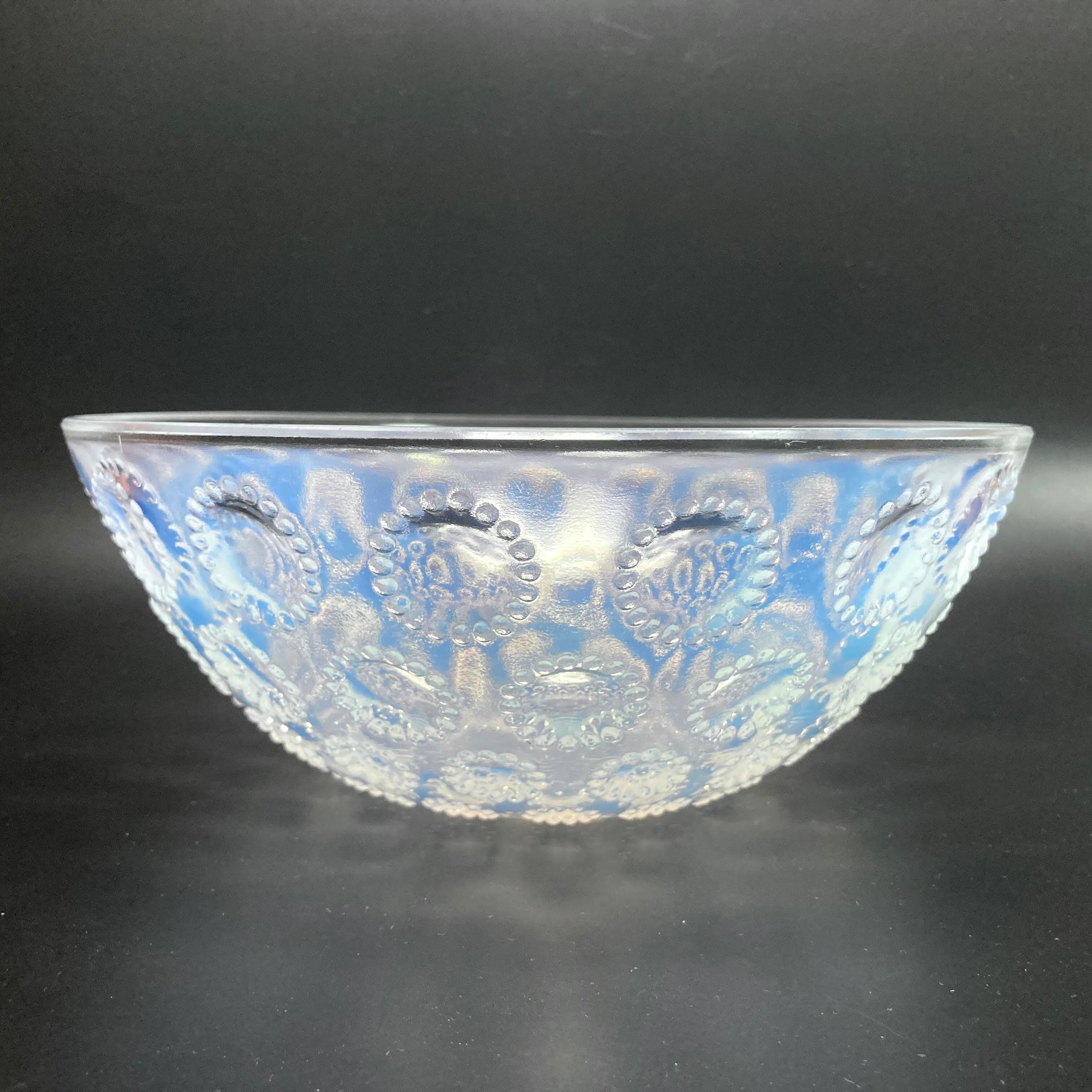 また、本品はルネ・ラリック作品で特徴的な美しいブルーオパルセント硝子による作品となり、より一層紋様が浮かび上がる素晴らしい作品となります。