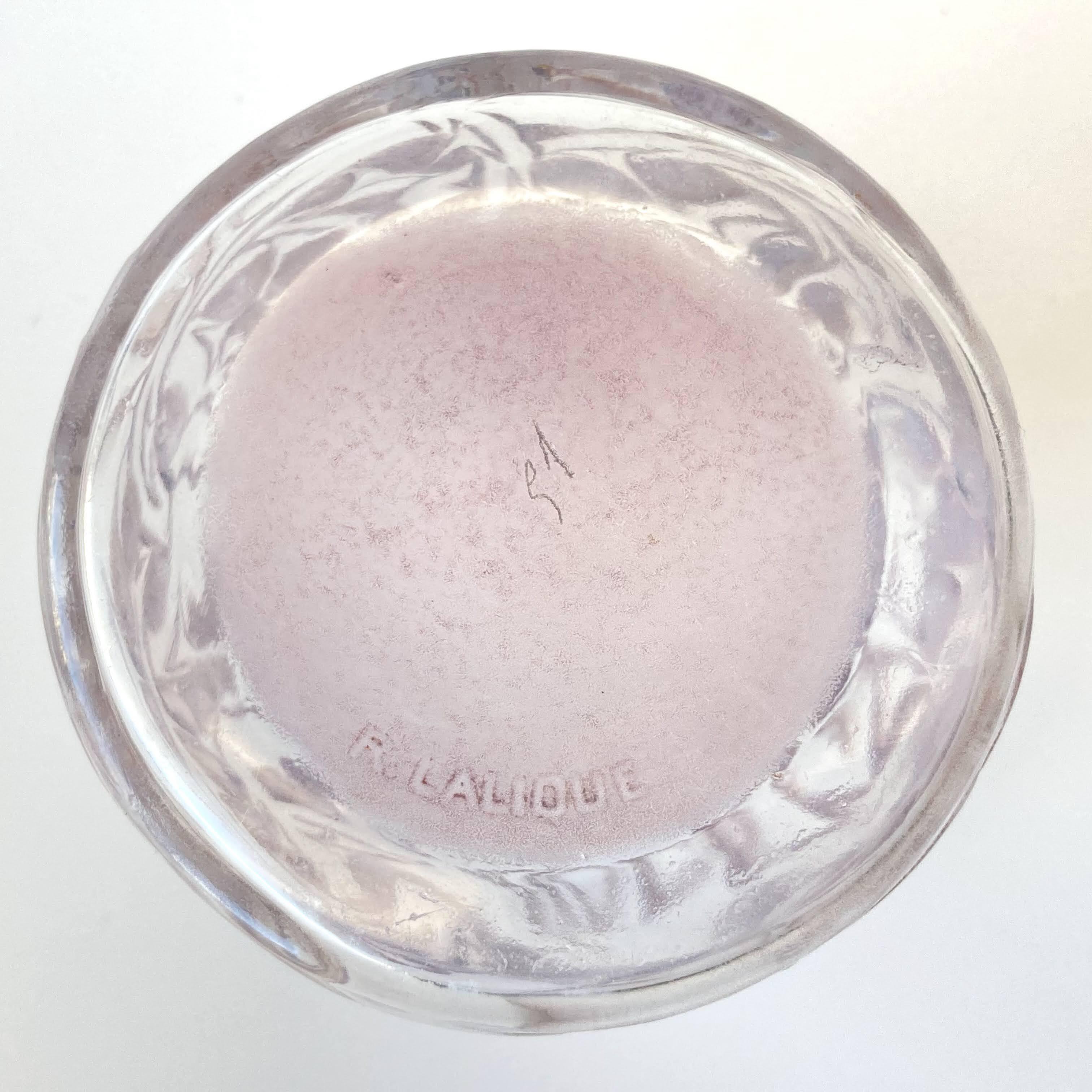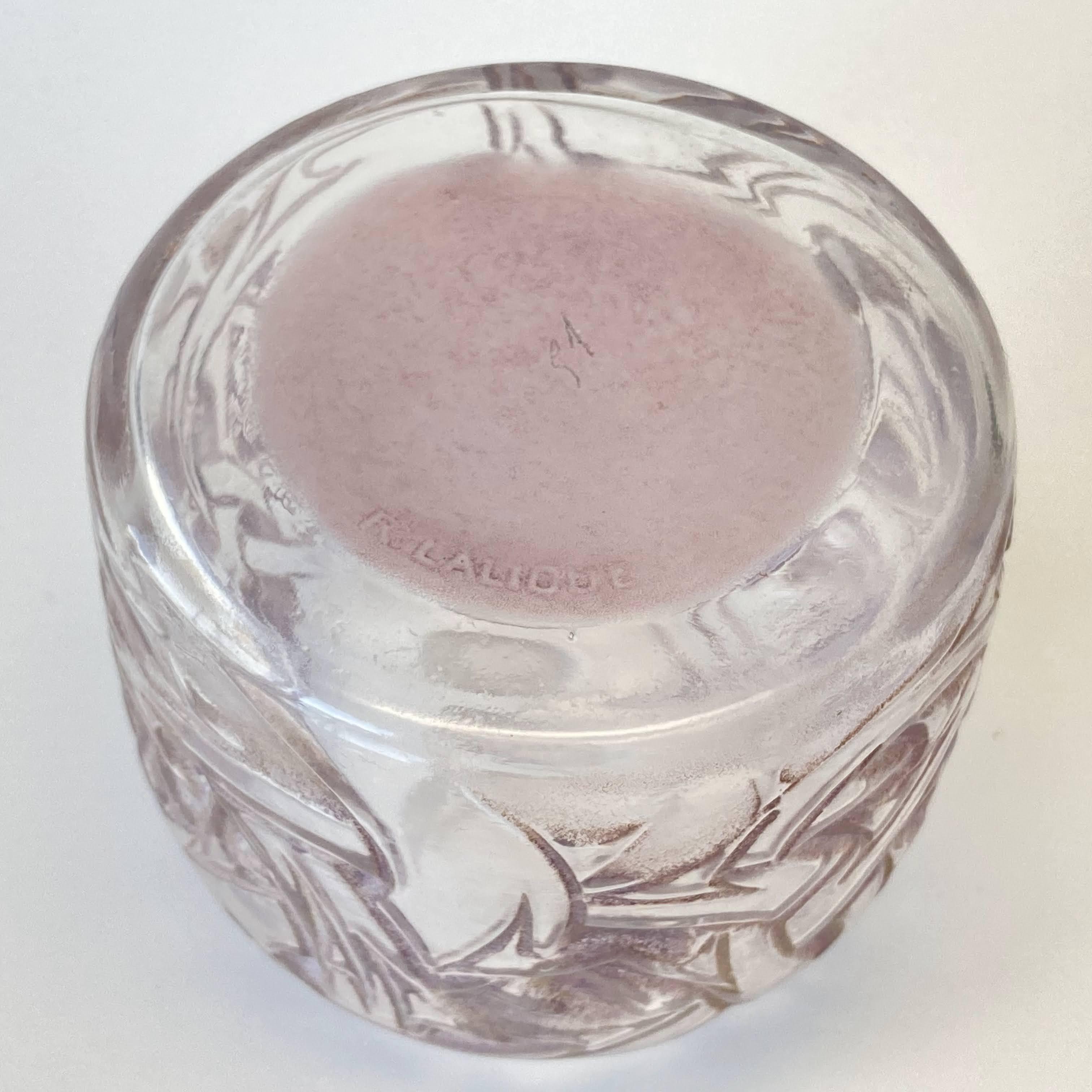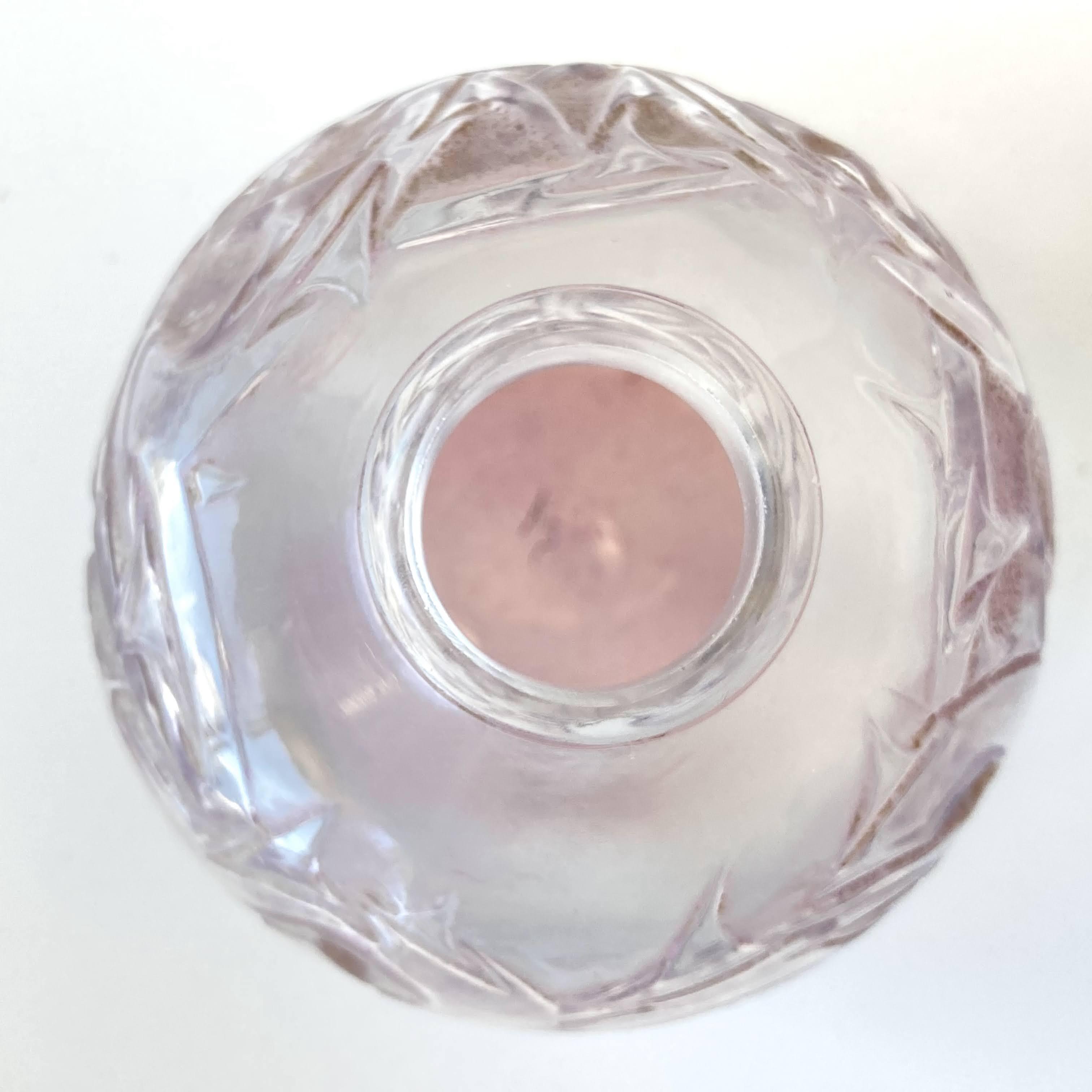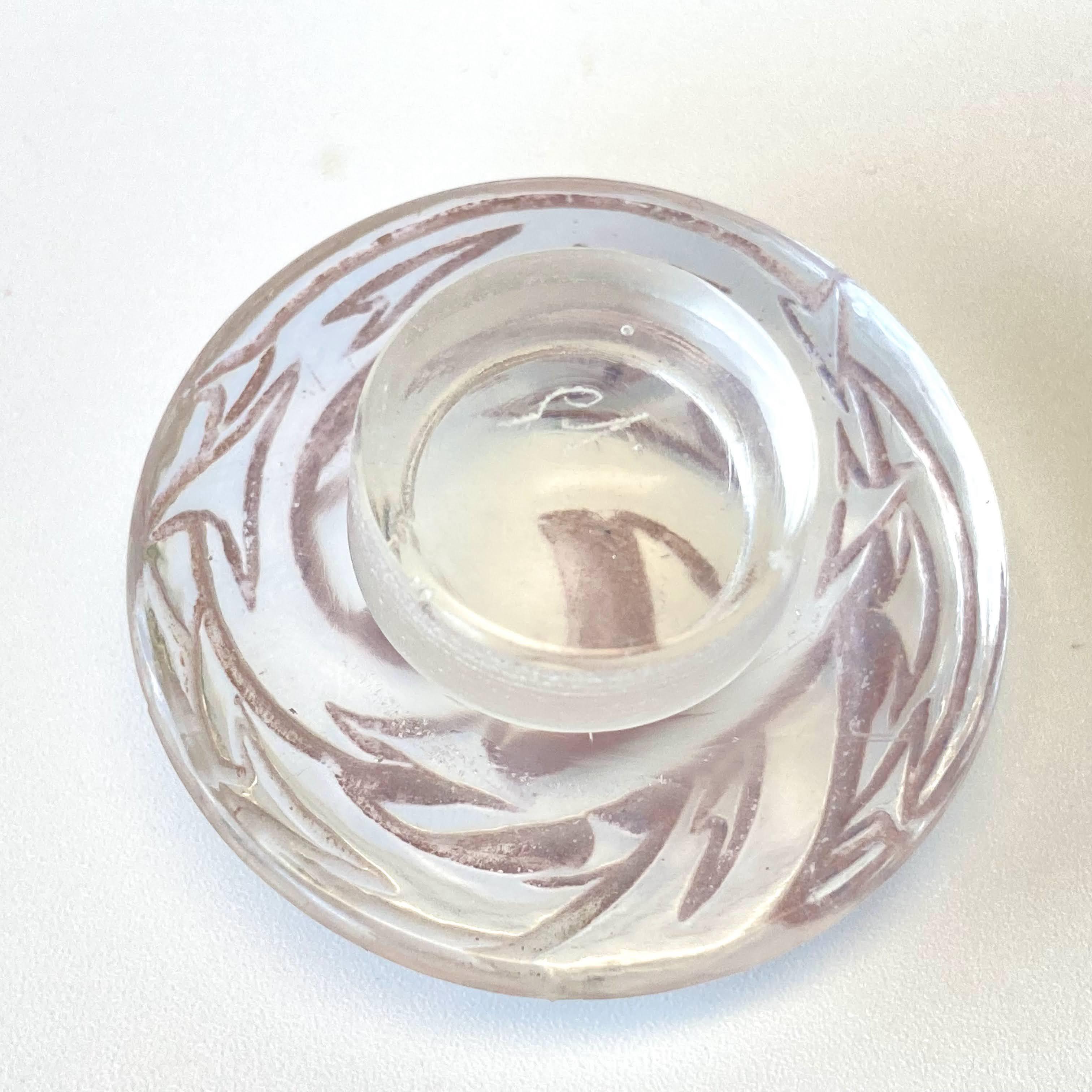 ラリックが得意としたフロスト加工と併せて、アメジスト色のパチネが施されています。