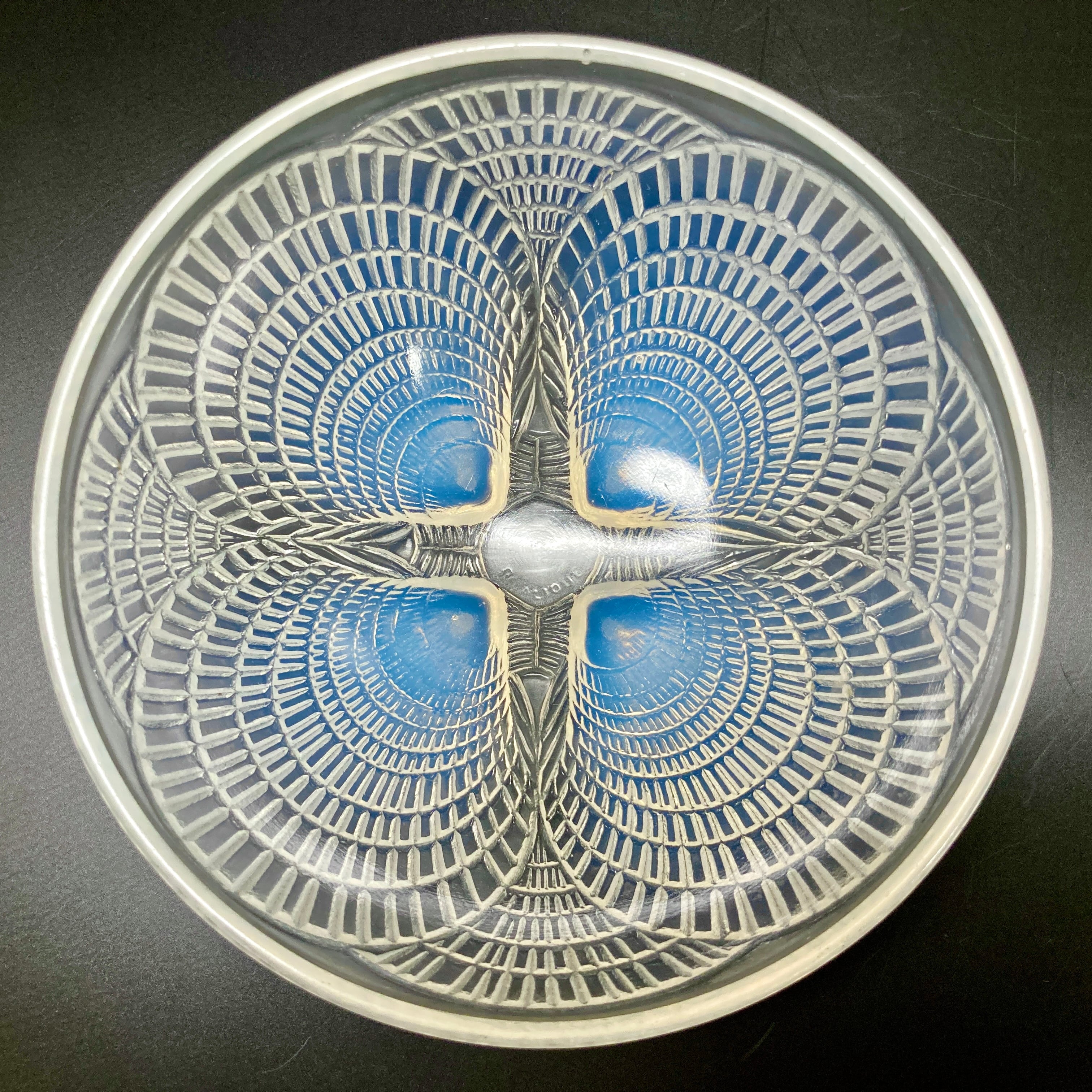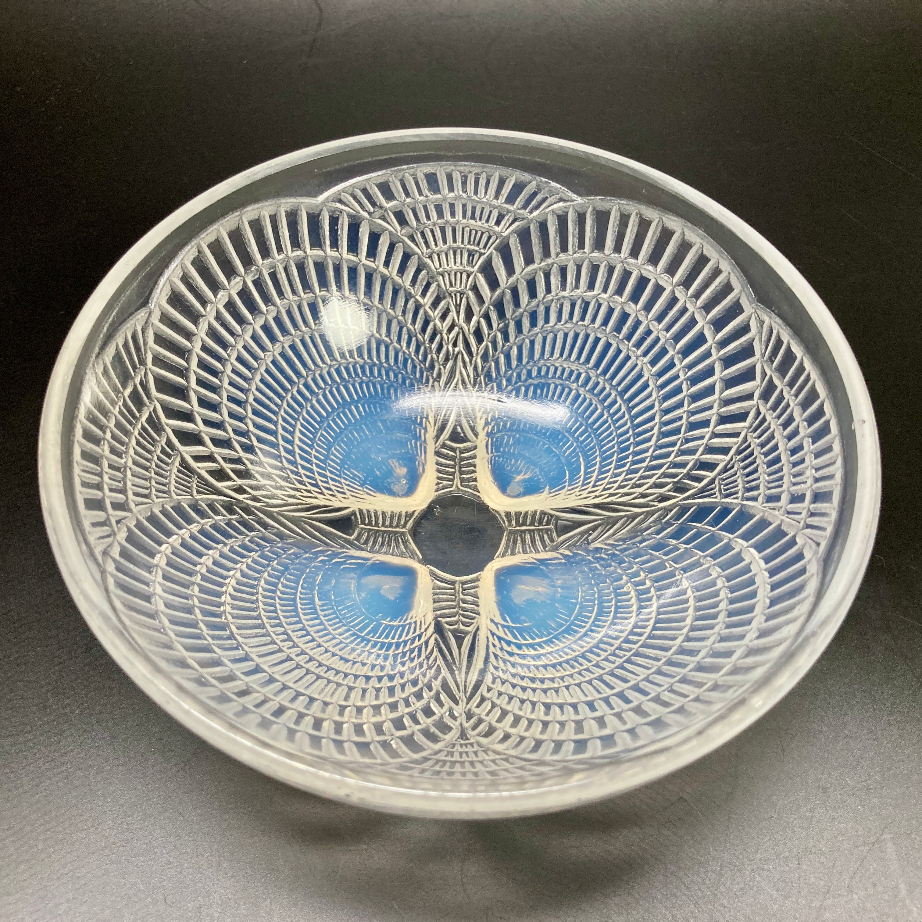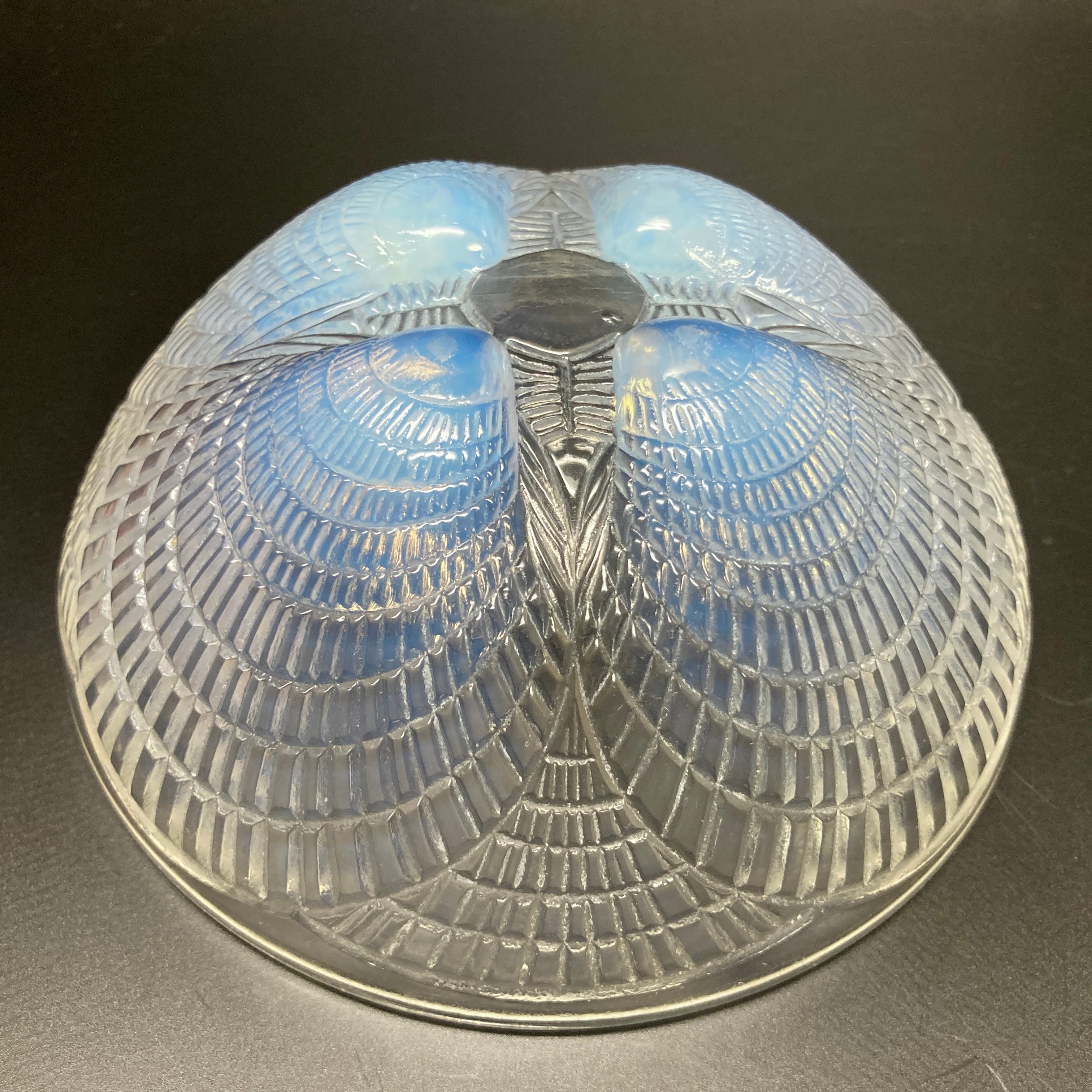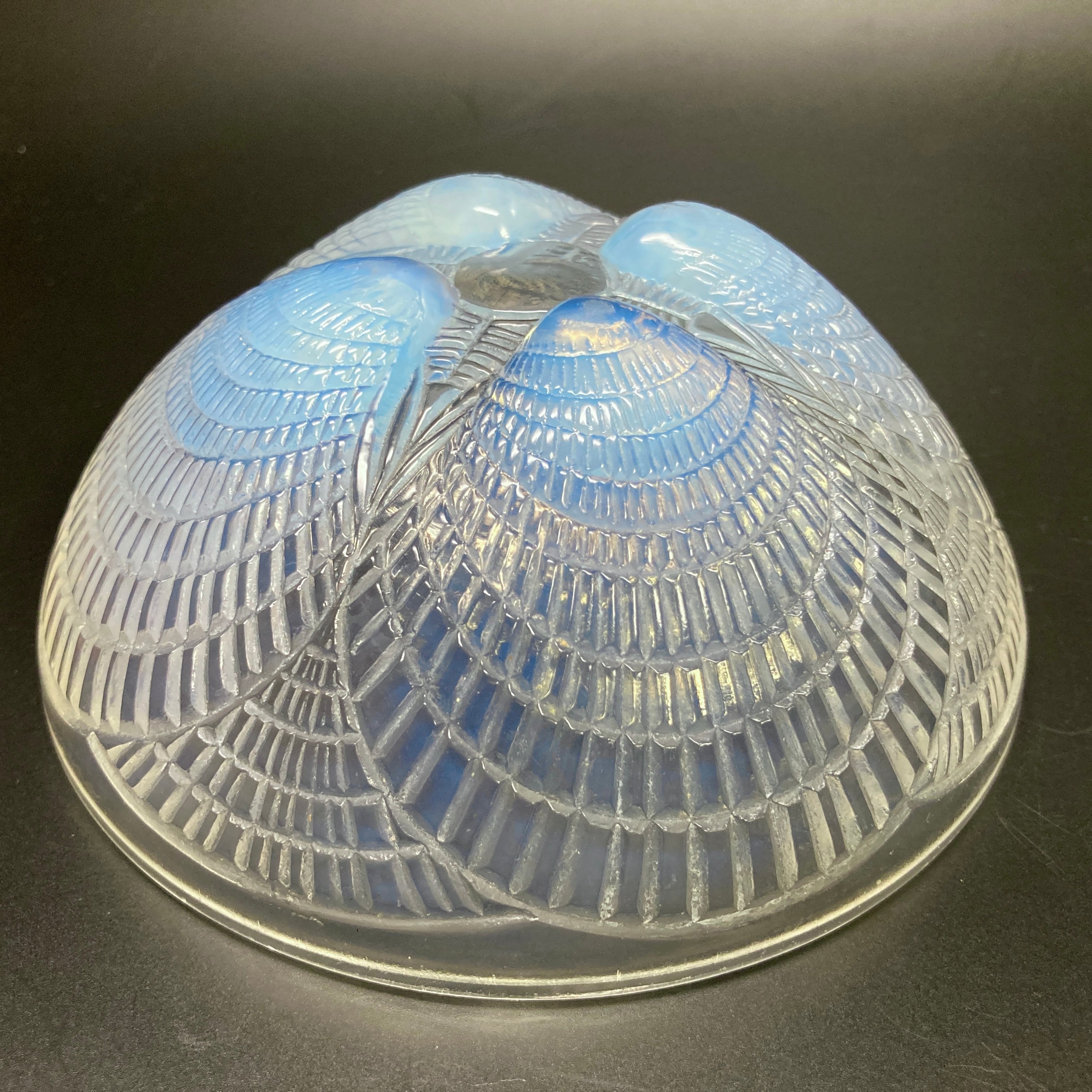 本品はルネ・ラリック作品で特徴的な、美しいブルーオパルセント硝子による作品となり、より一層紋様が浮かび上がる素晴らしい作品となります。