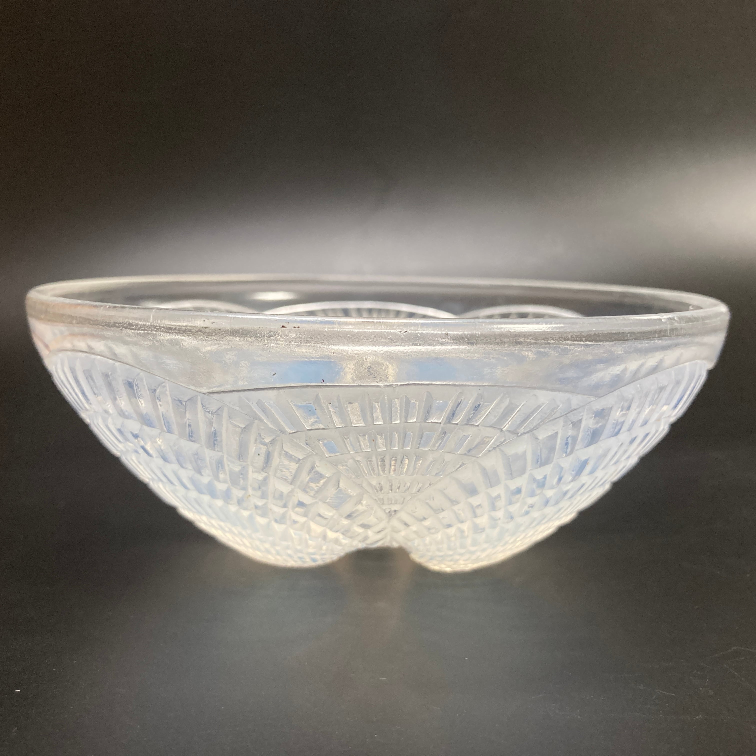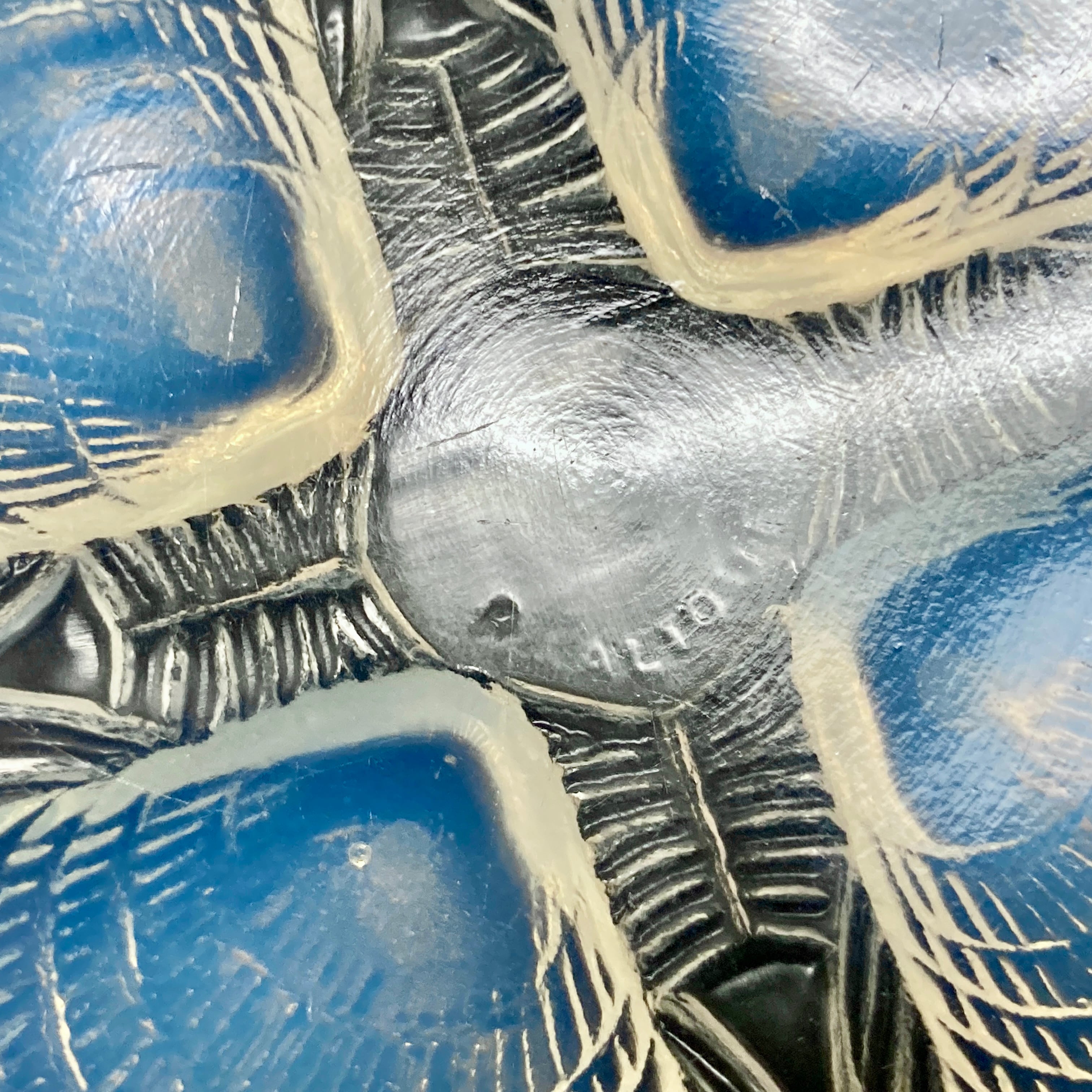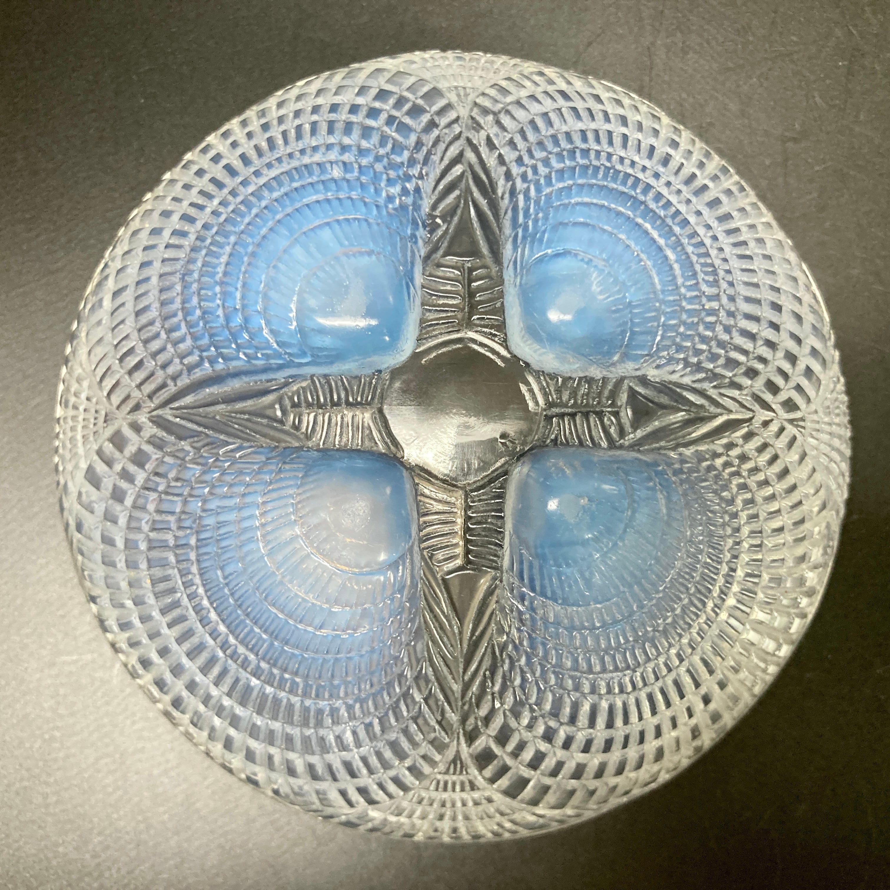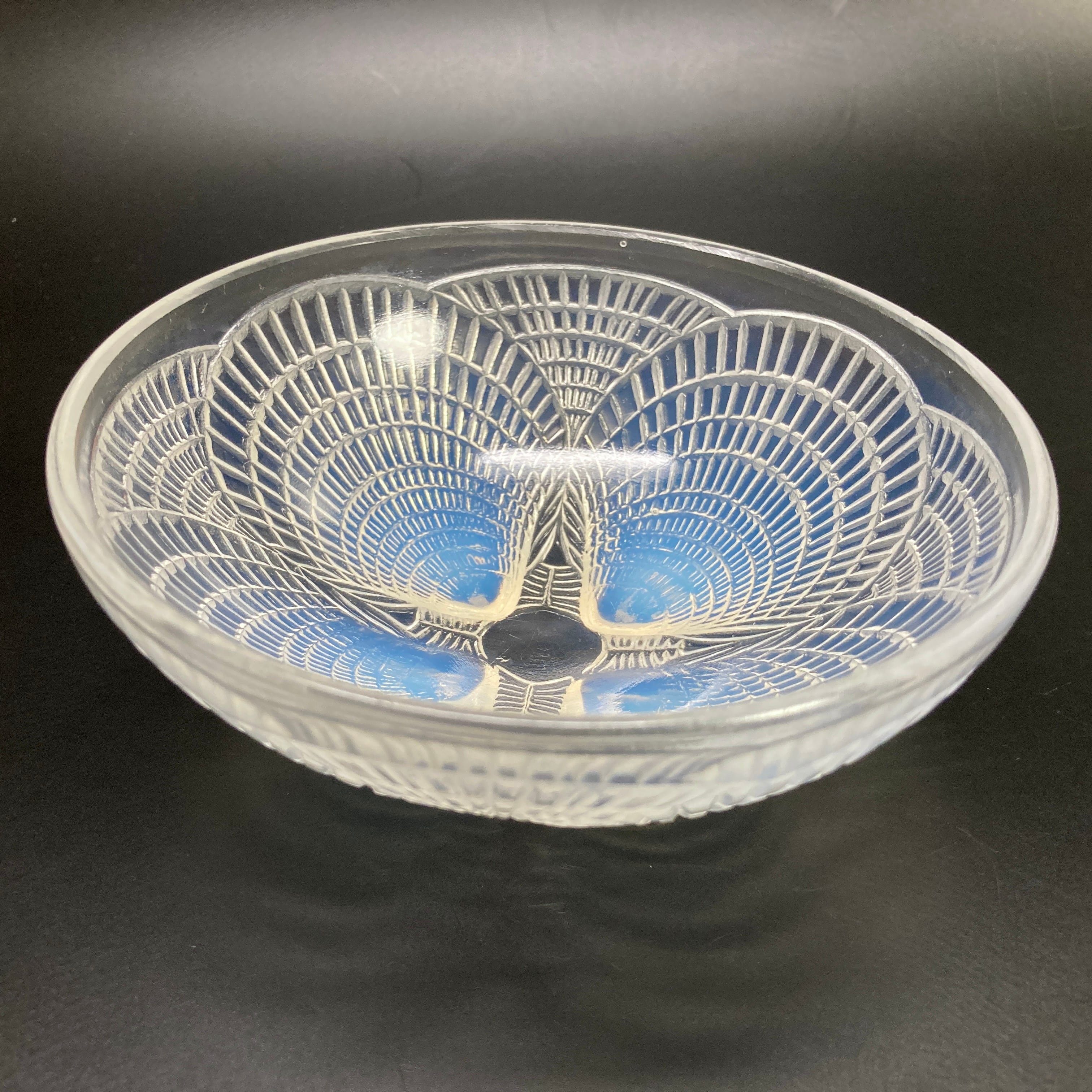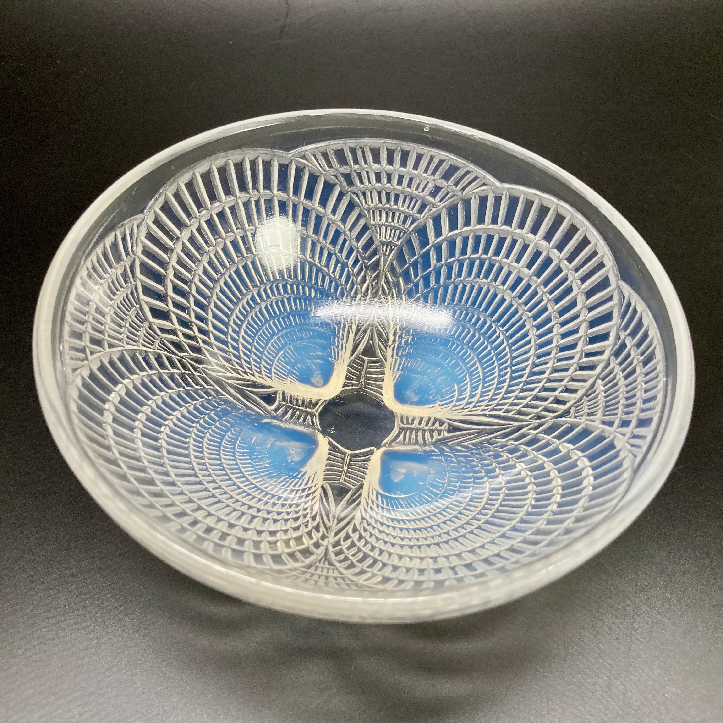 本品はルネ・ラリック作品で特徴的な、美しいブルーオパルセント硝子による作品となり、より一層紋様が浮かび上がる素晴らしい作品となります。