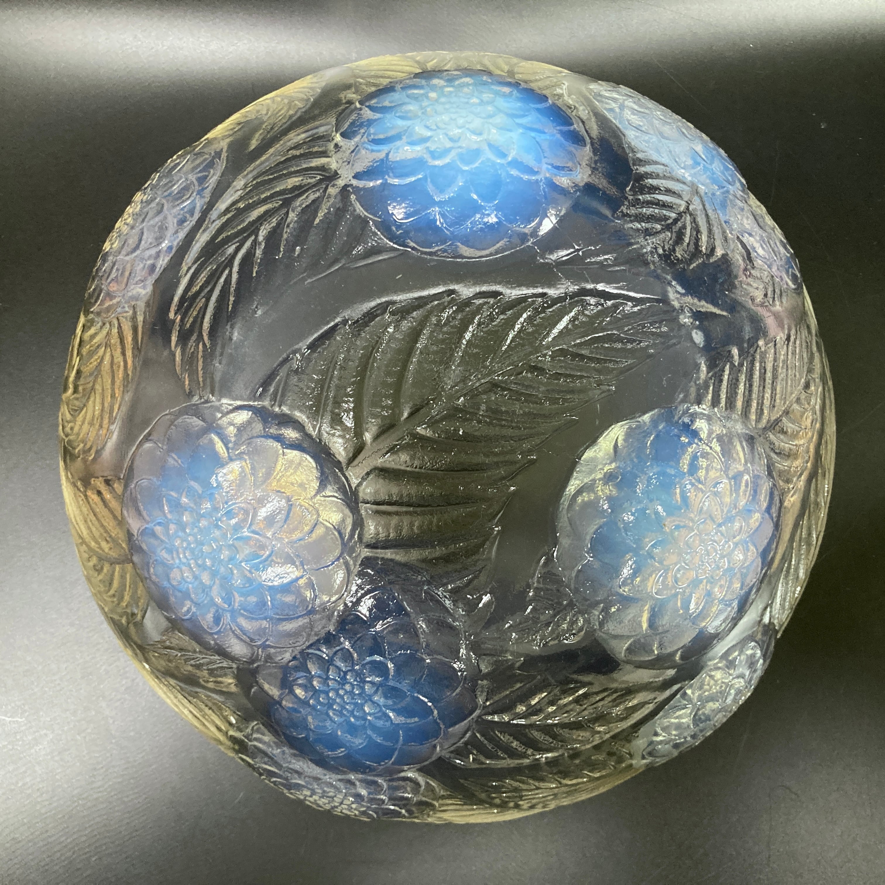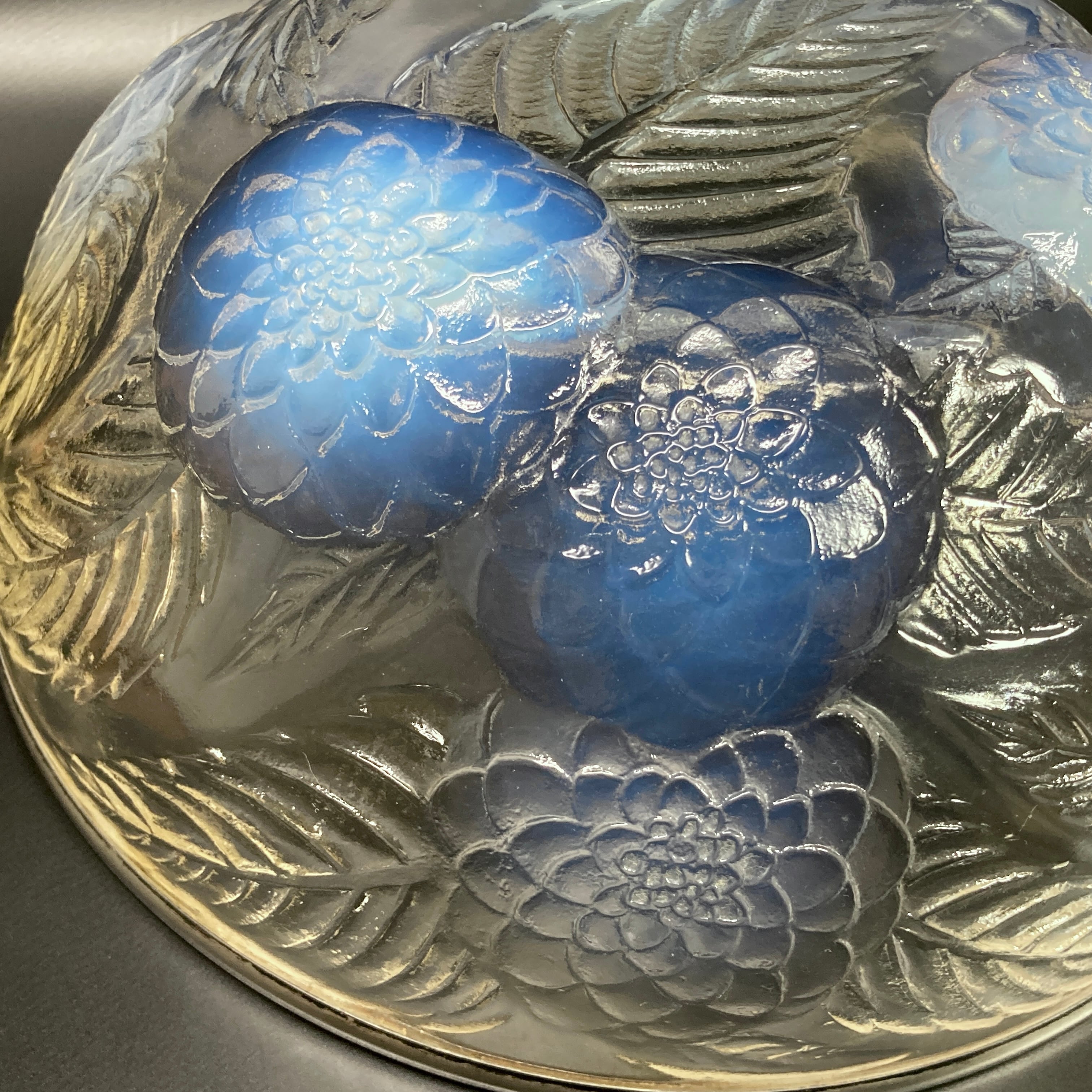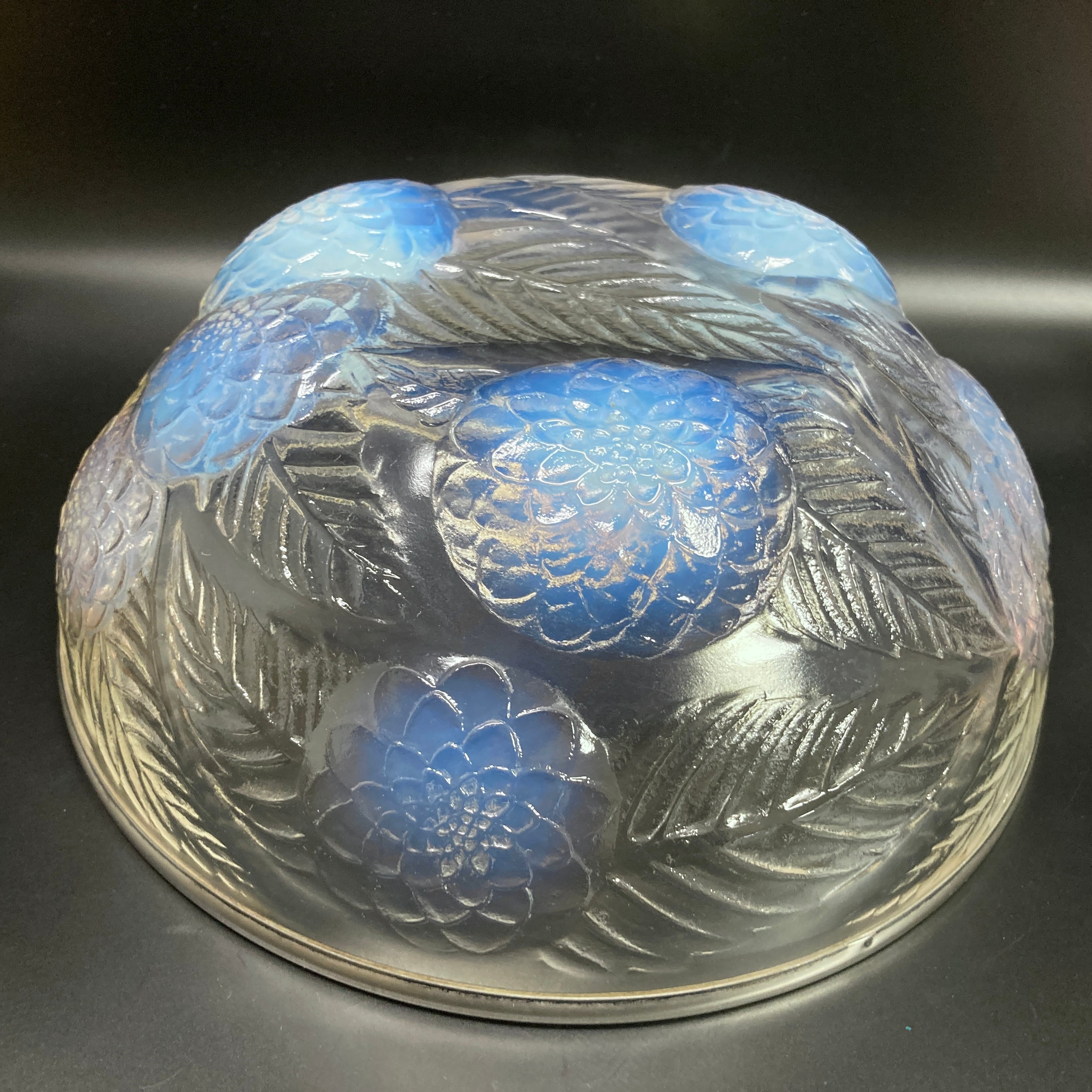 また、本品はルネ・ラリック作品で特徴的な美しいブルーオパルセント硝子による作品となり、光の当たり方によってより一層紋様が浮かび上がる幻想的な作品です。