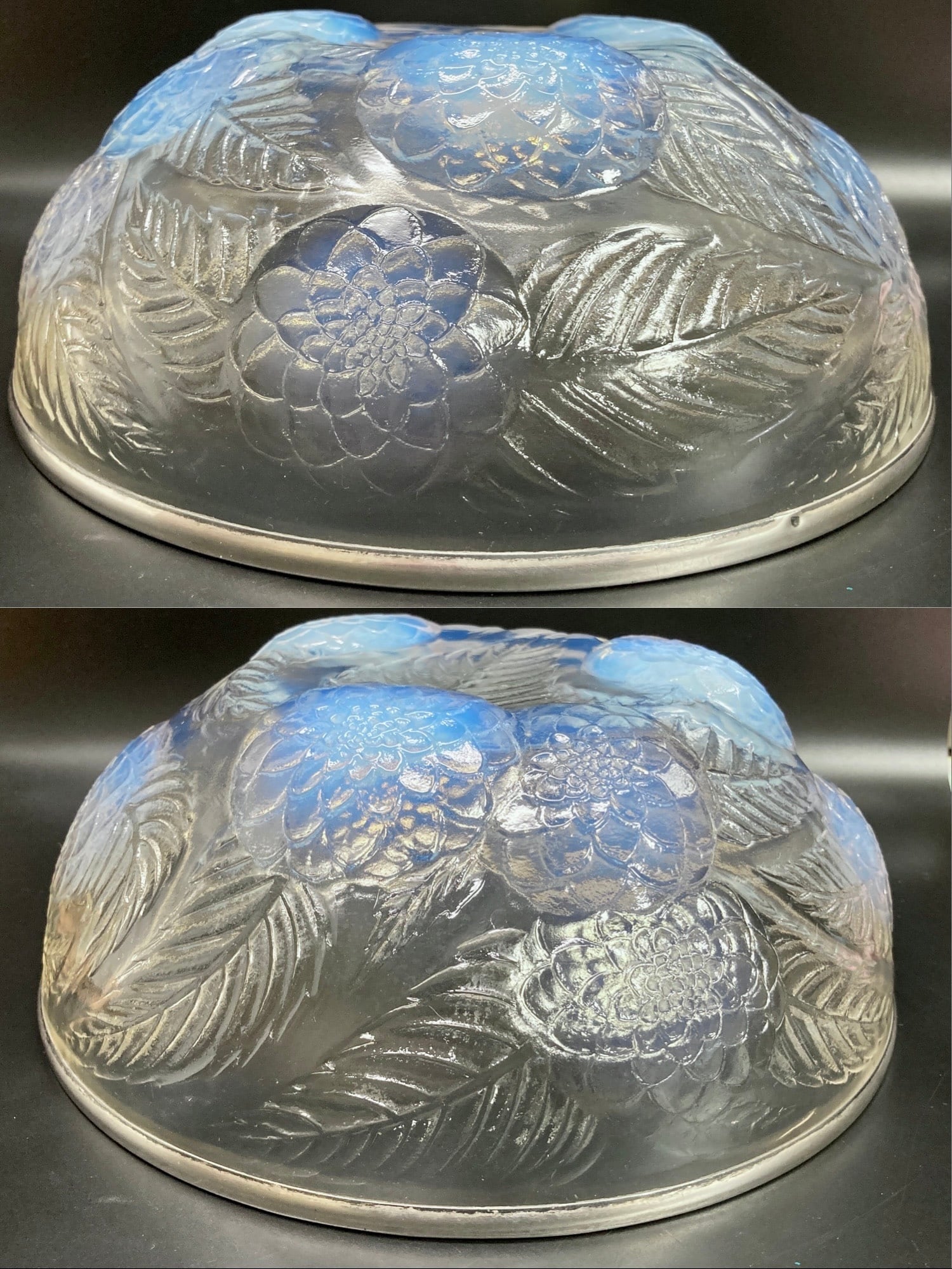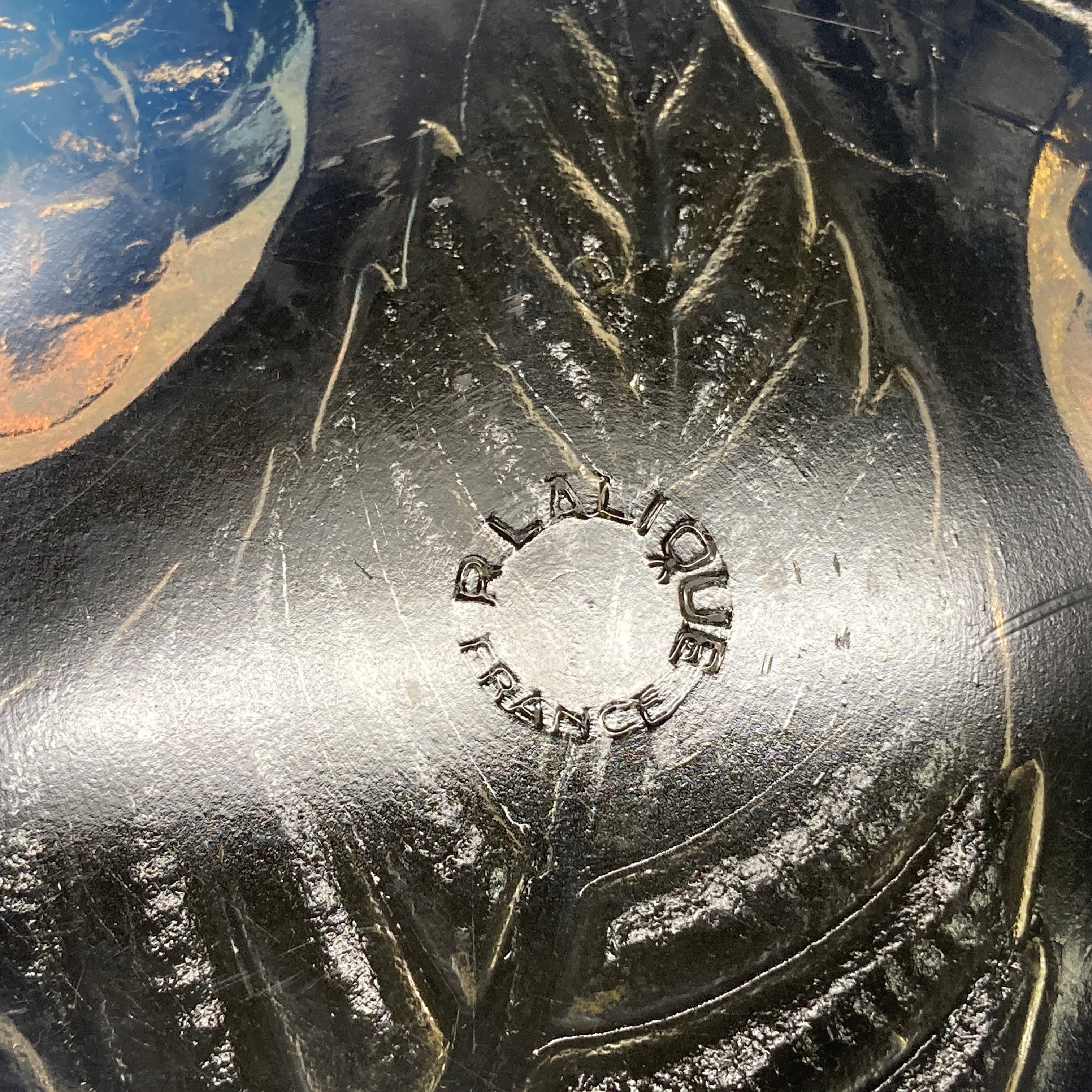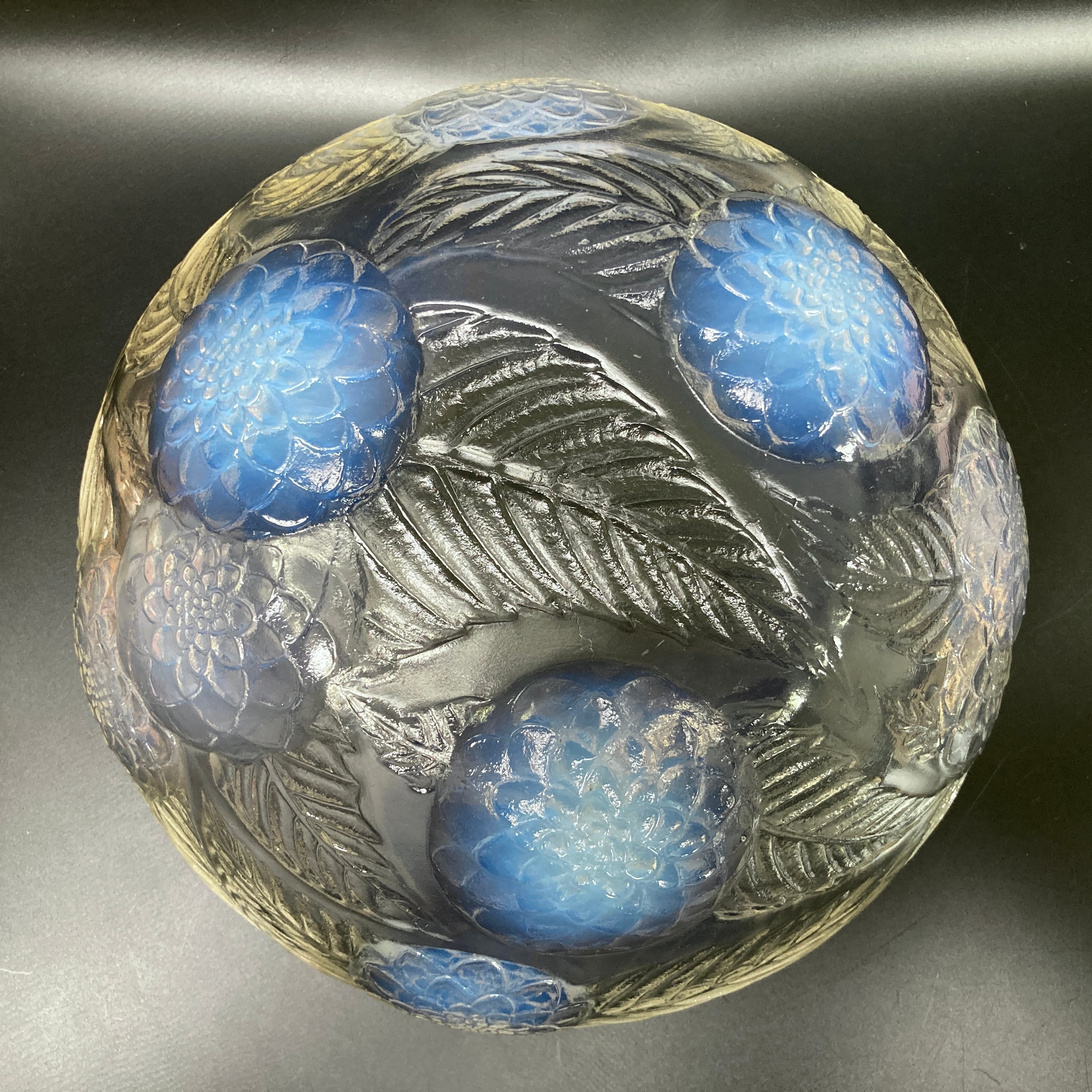 また、本品はルネ・ラリック作品で特徴的な美しいブルーオパルセント硝子による作品となり、光の当たり方によってより一層紋様が浮かび上がる幻想的な作品です。