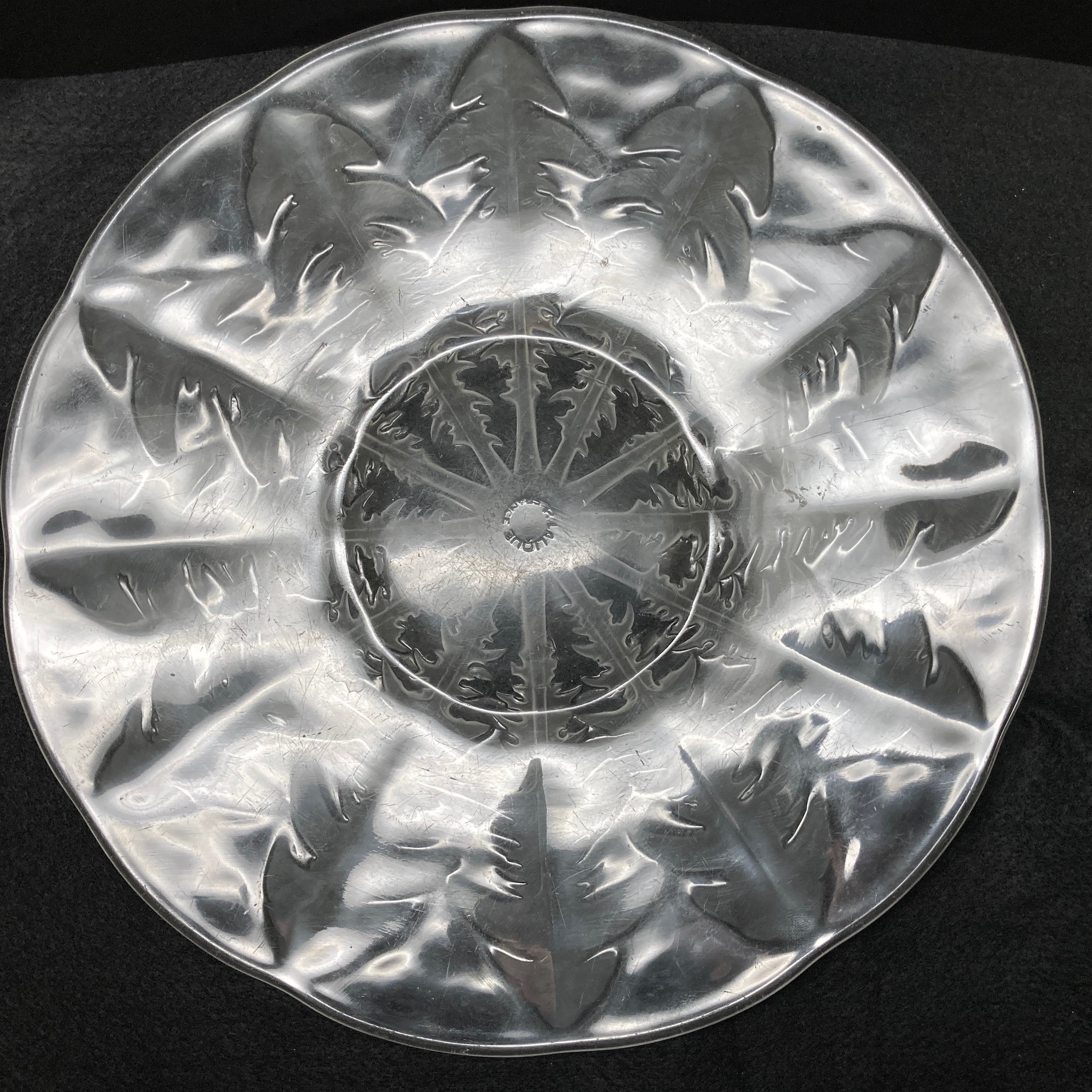 お皿の中央には陽刻によるR.LALIQUEのサインと作品番号の刻印が御座います。