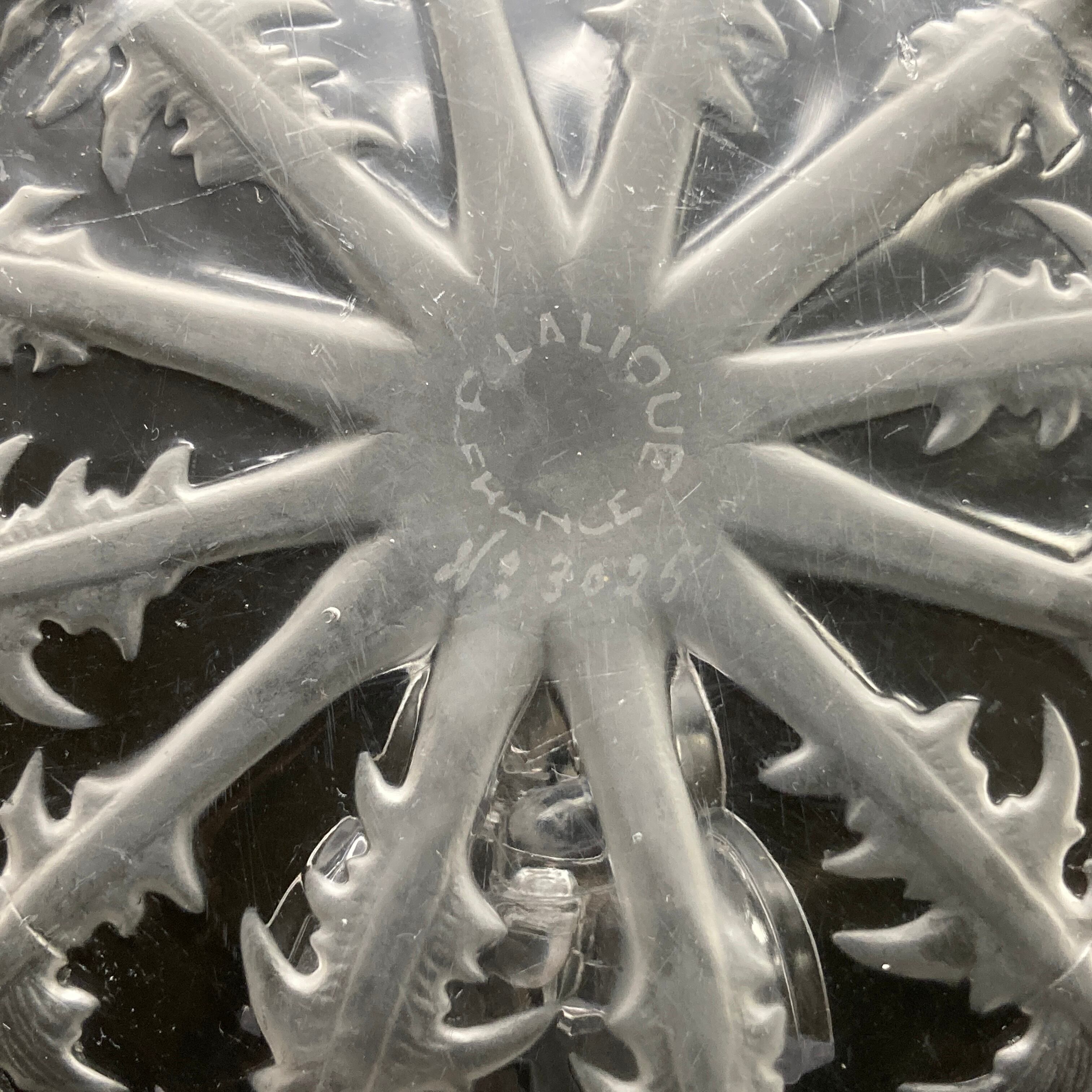 本品はルネ・ラリック作品で特徴的なフロスト硝子による作品となり、より一層紋様が浮かび上がる素晴らしい作品となります。