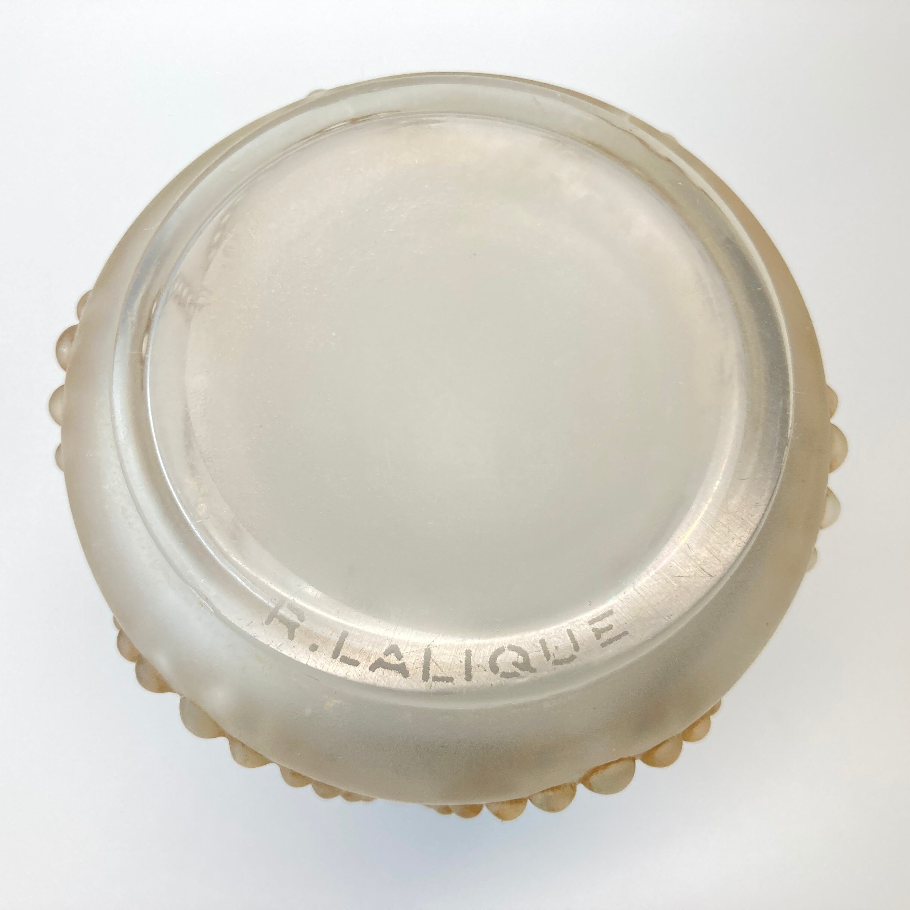 ルネ・ラリック作品で特徴的なフロスト硝子とパチネ彩による作品となり、より一層紋様が浮かび上がる素晴らしい作品となります。