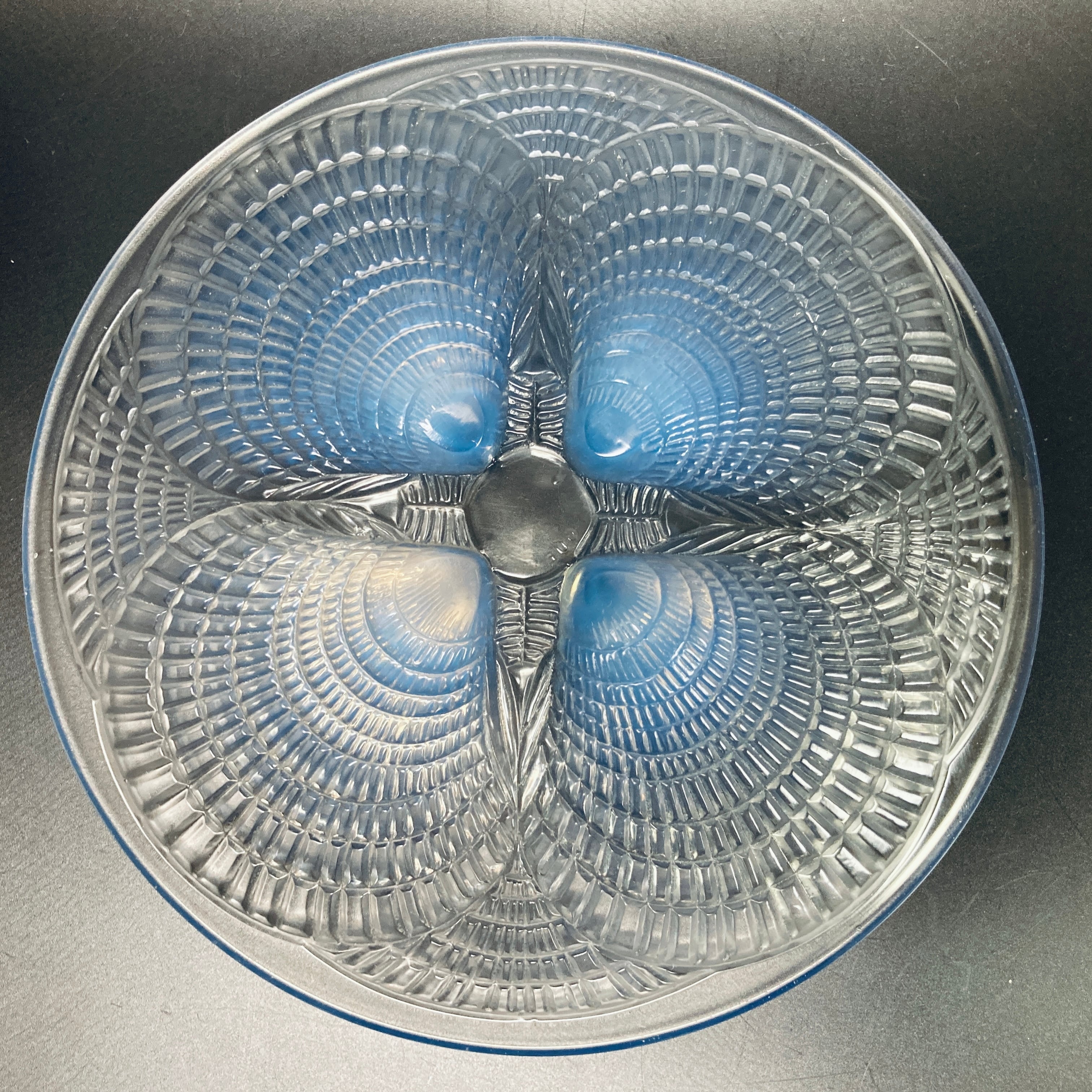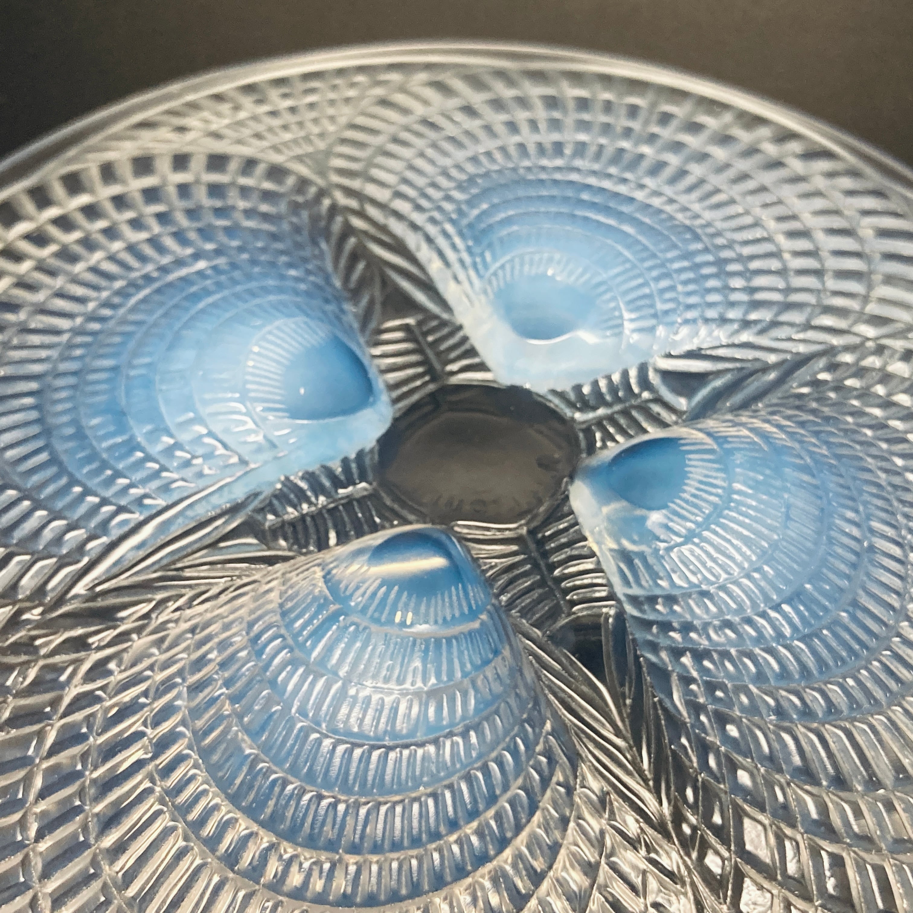本品はルネ・ラリック作品で特徴的な、美しいブルーオパルセント硝子による作品となり、より一層紋様が浮かび上がる素晴らしい作品となります。