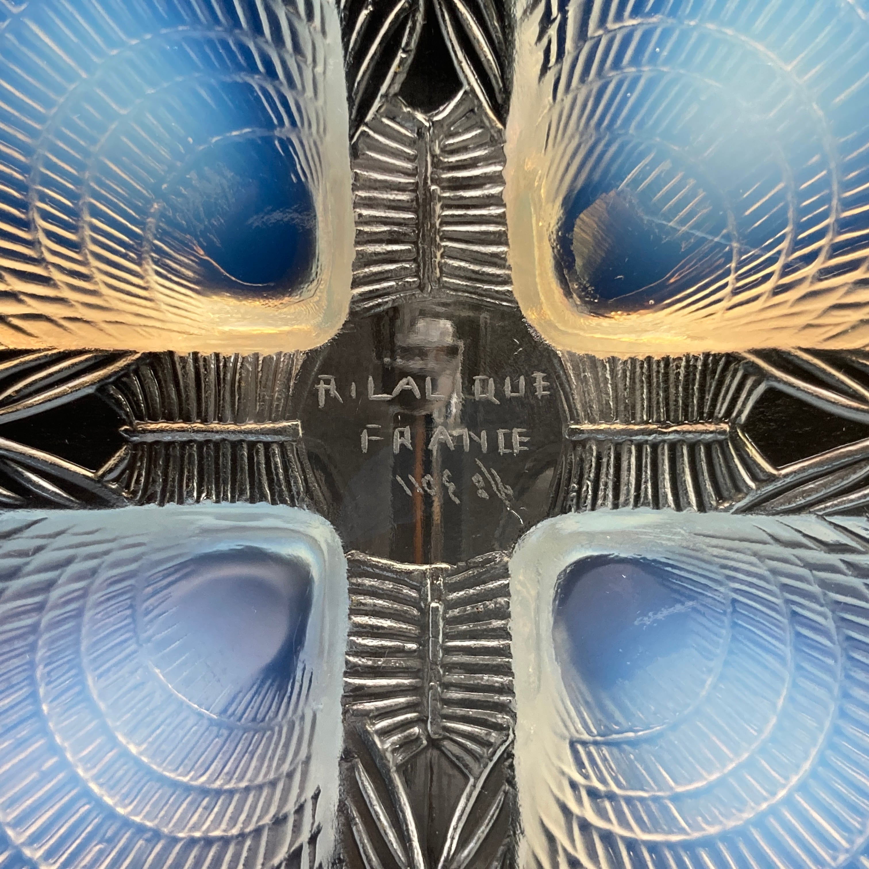 本品はルネ・ラリック作品で特徴的な、美しいブルーオパルセント硝子による作品となり、より一層紋様が浮かび上がる素晴らしい作品となります。