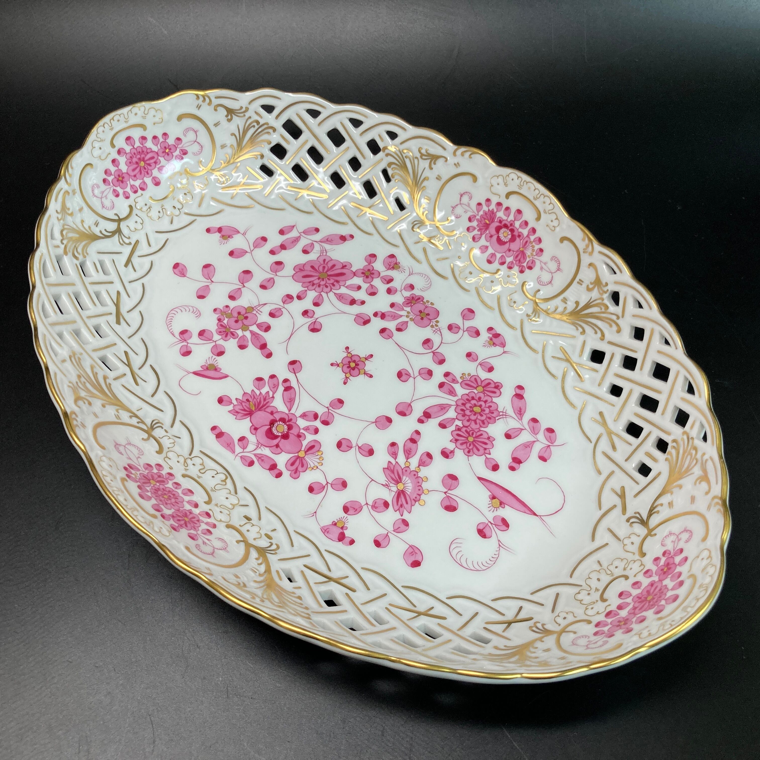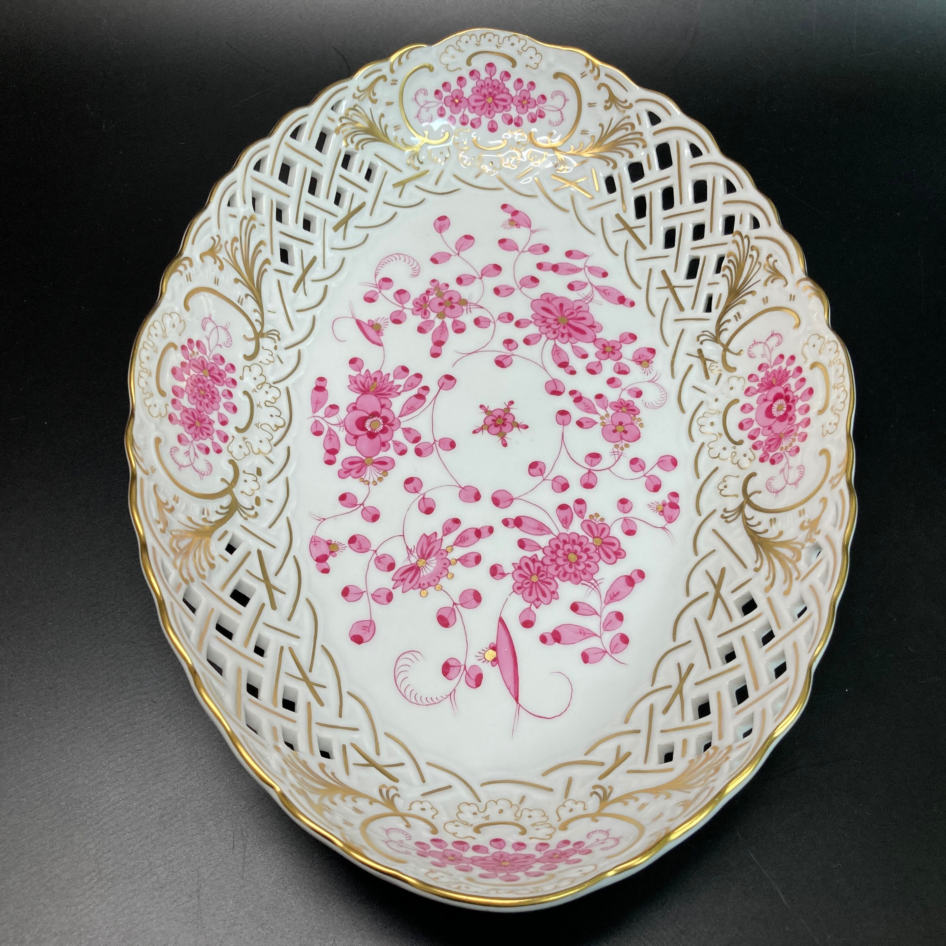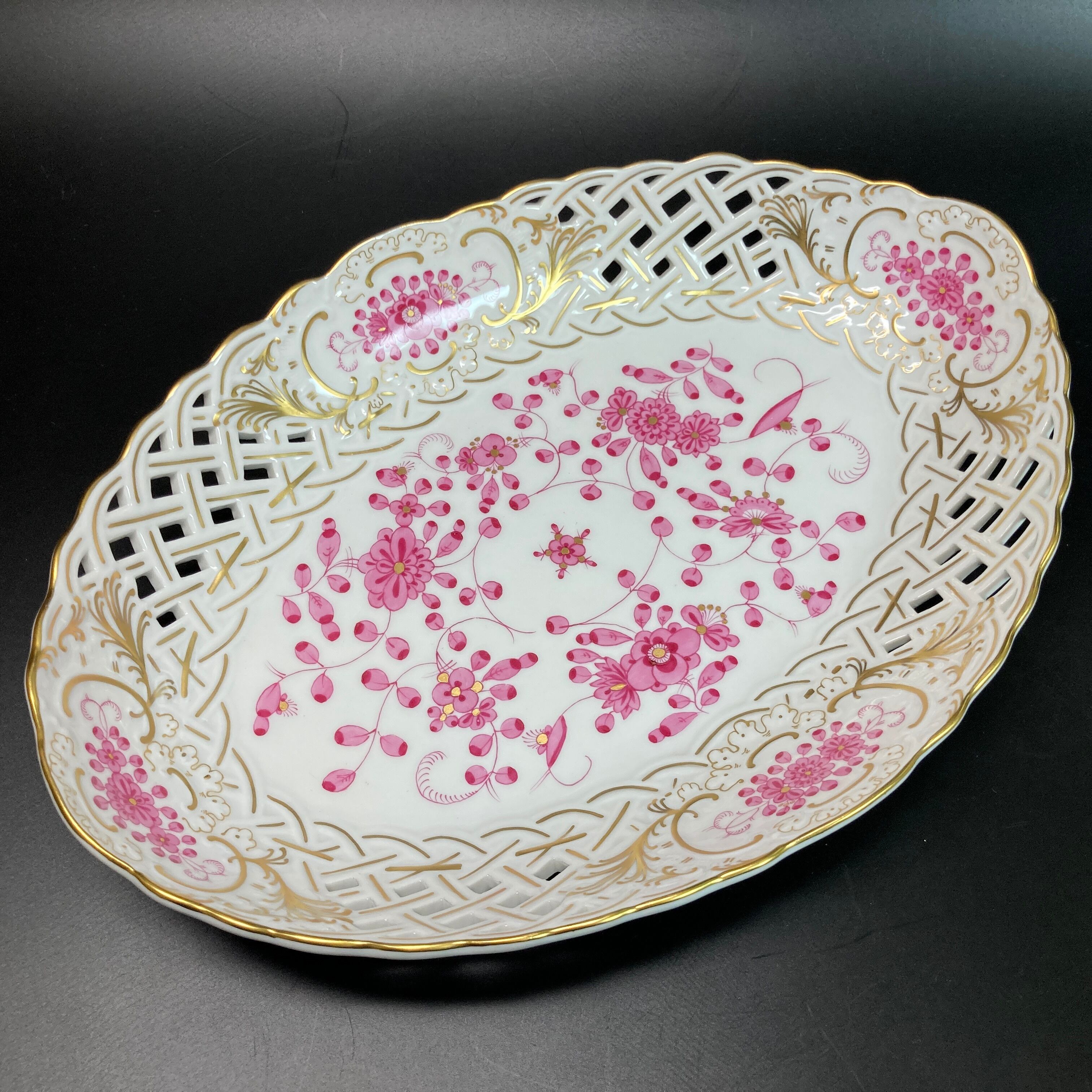 マイセン インドの華 透かし オープン オーバルディッシュ プレート ボウル リッチ ピンク 花 金彩
