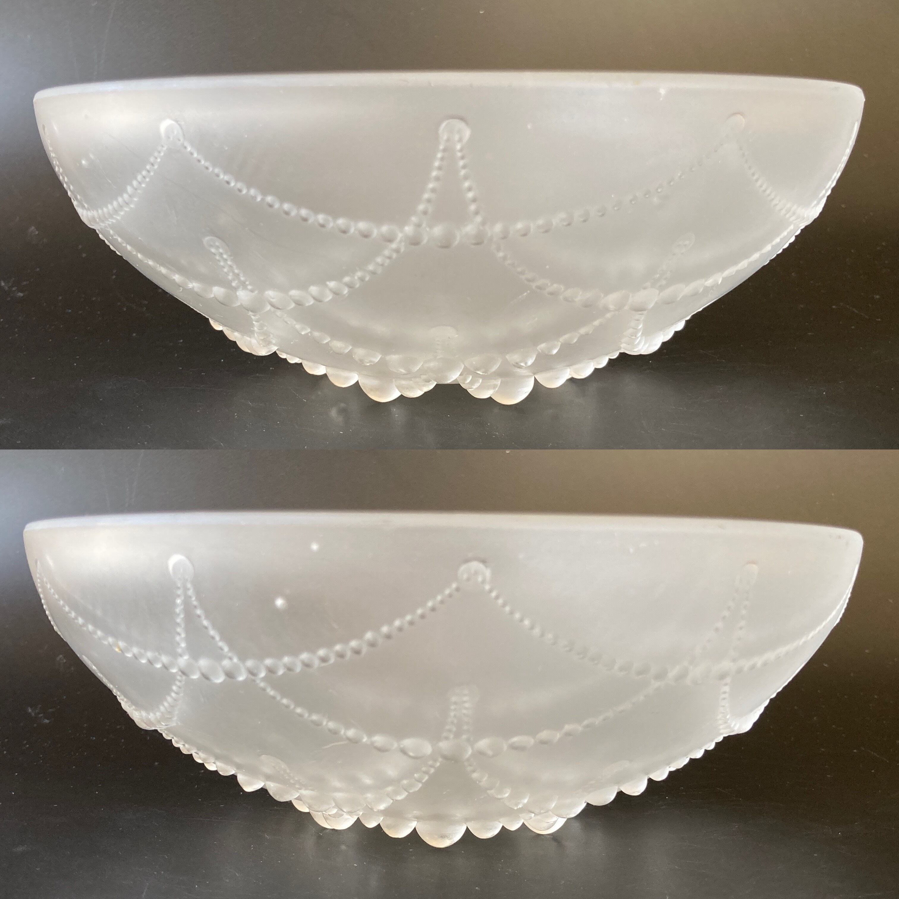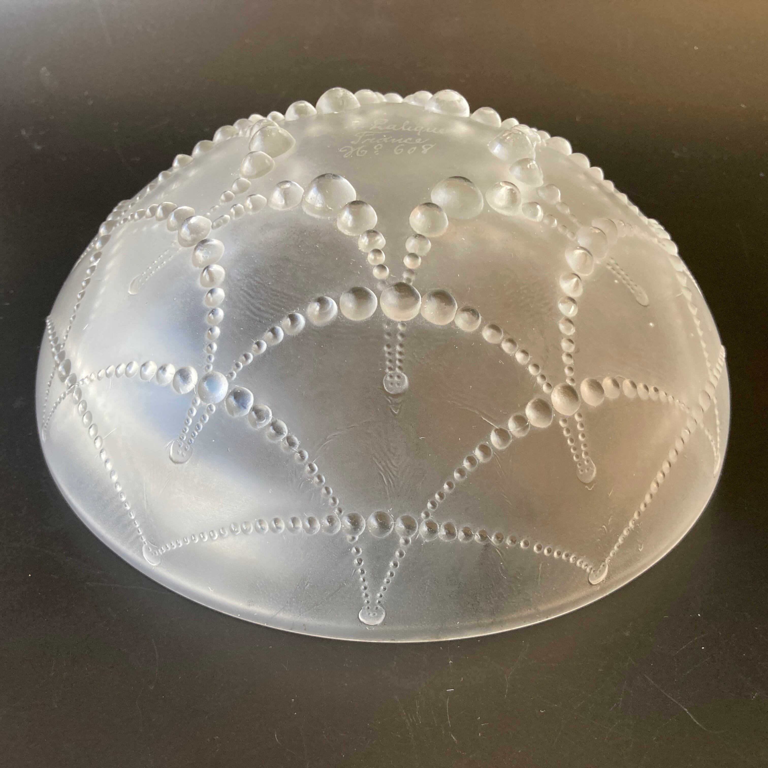 本品はルネ・ラリック作品で特徴的なフロスト硝子による作品となり、より一層紋様が浮かび上がる素晴らしい作品となります。