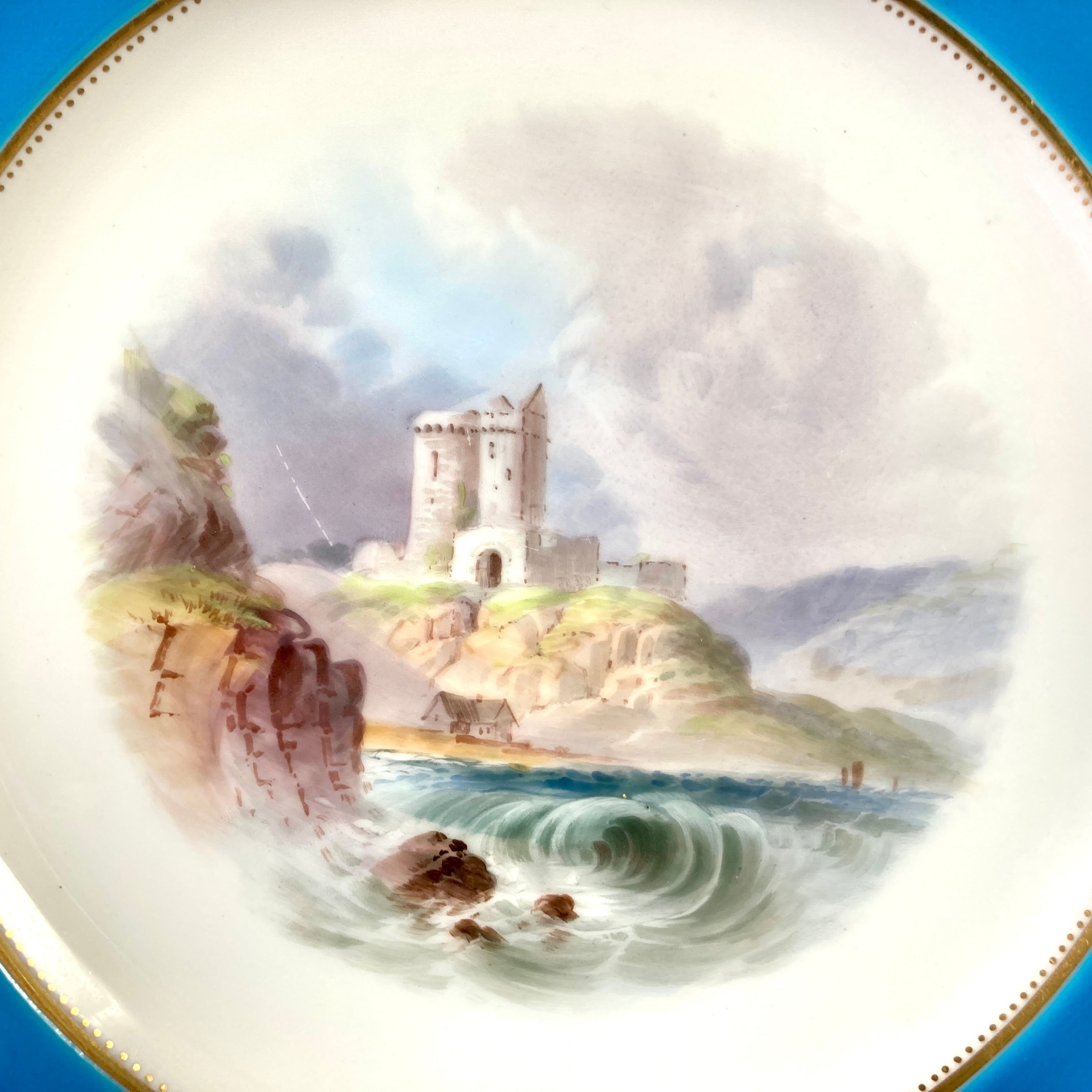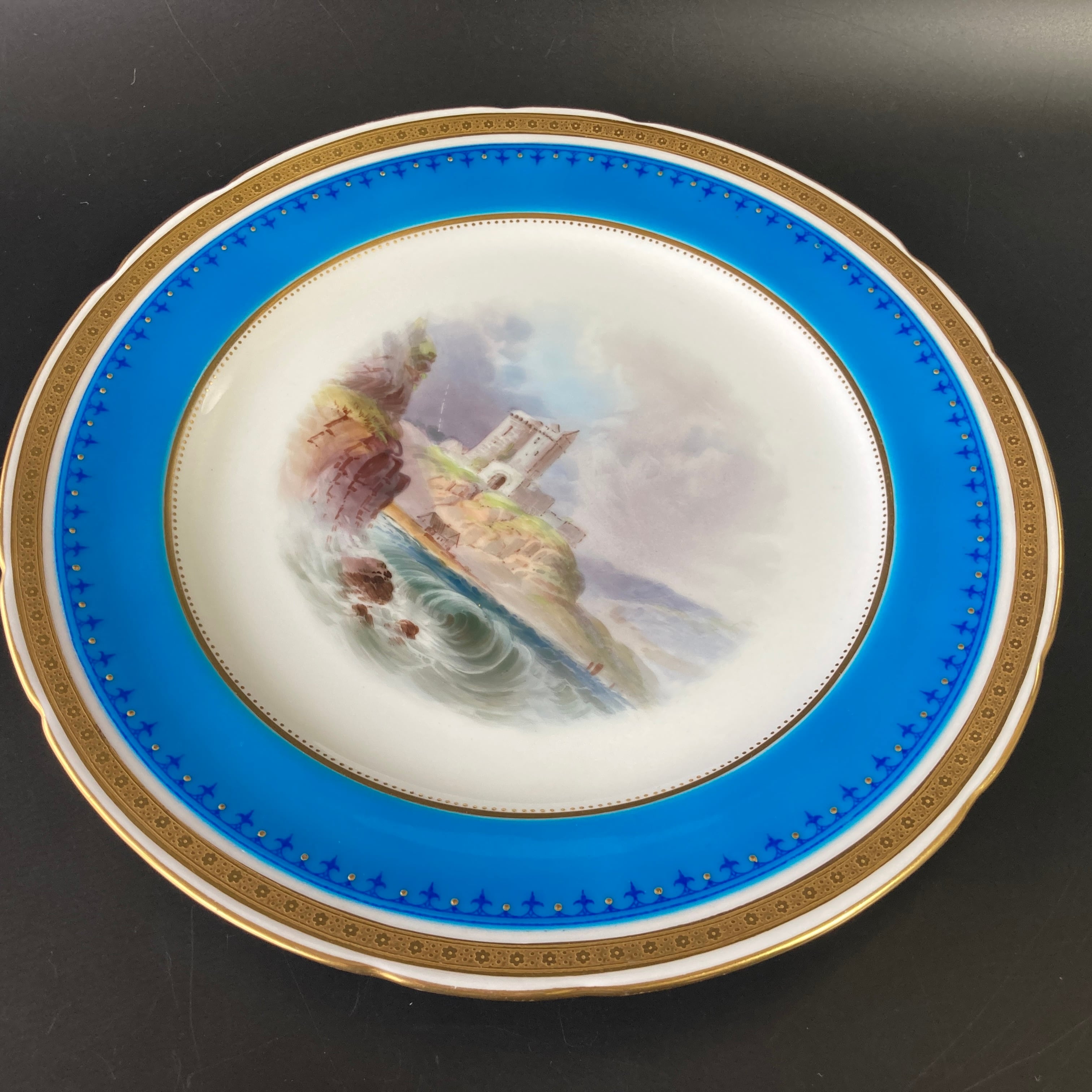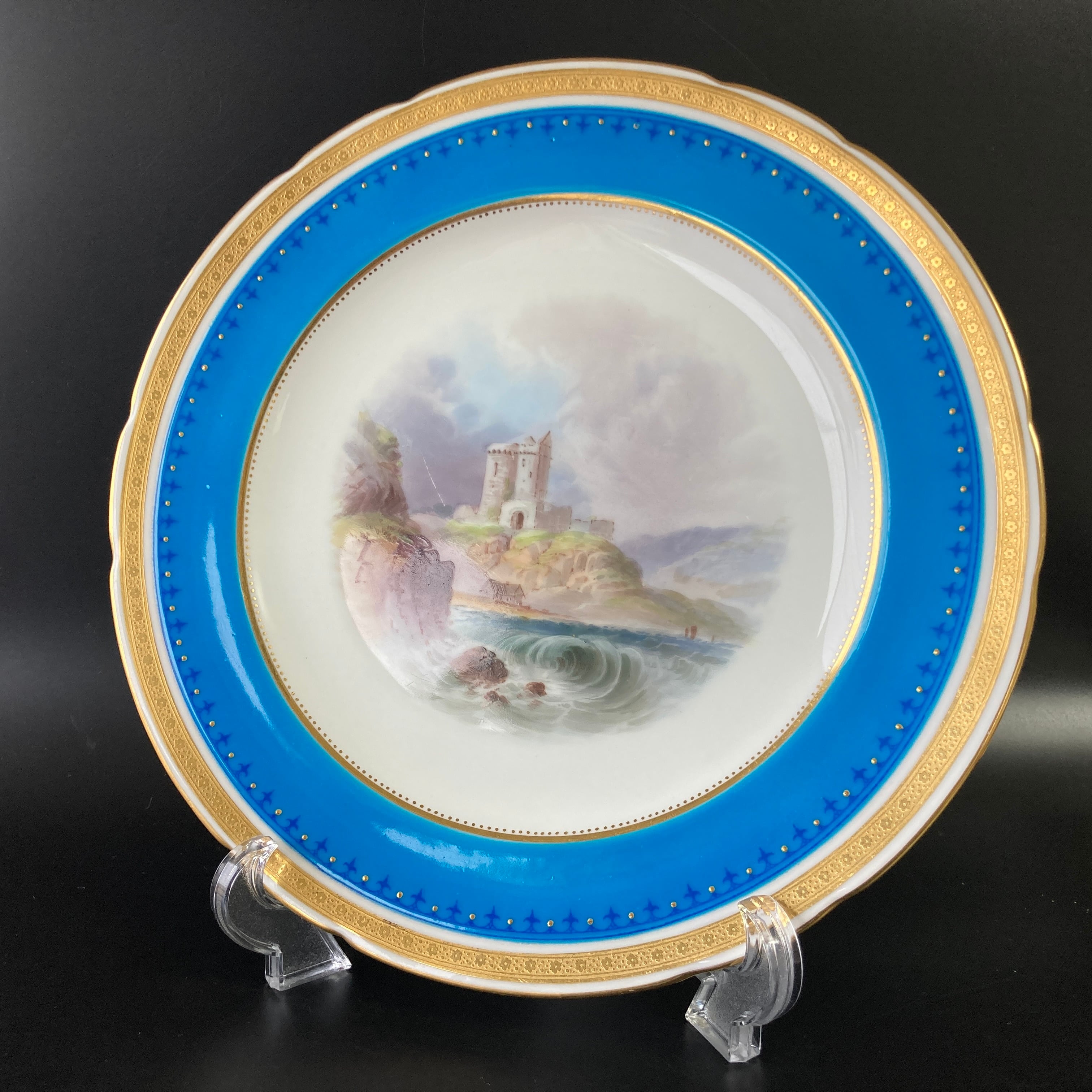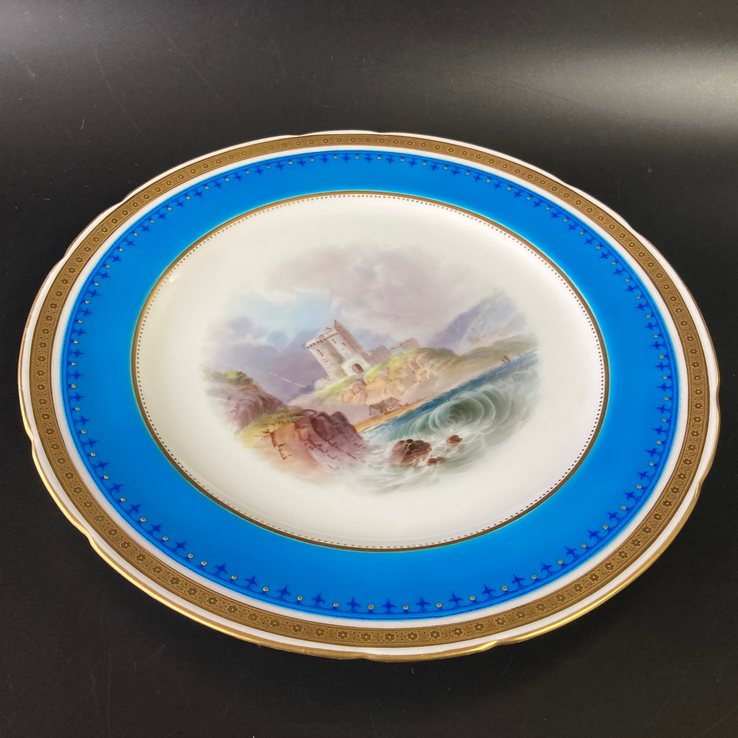 ミントン ターコイズブルー 古城風景絵図飾皿 エナメル七宝金彩 金盛 キャビネットプレート 大皿 アンティーク ゴールド