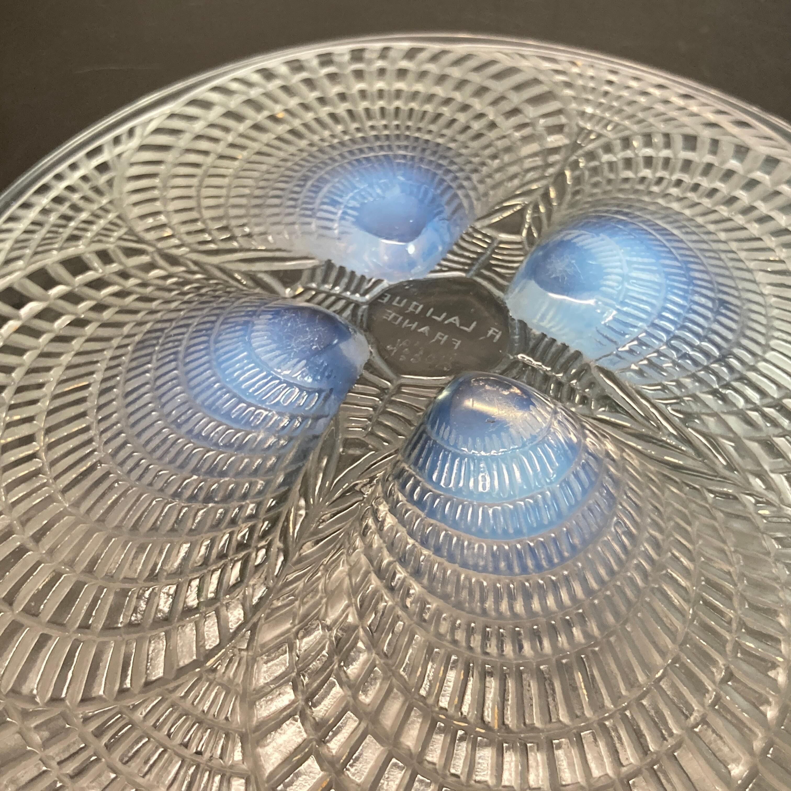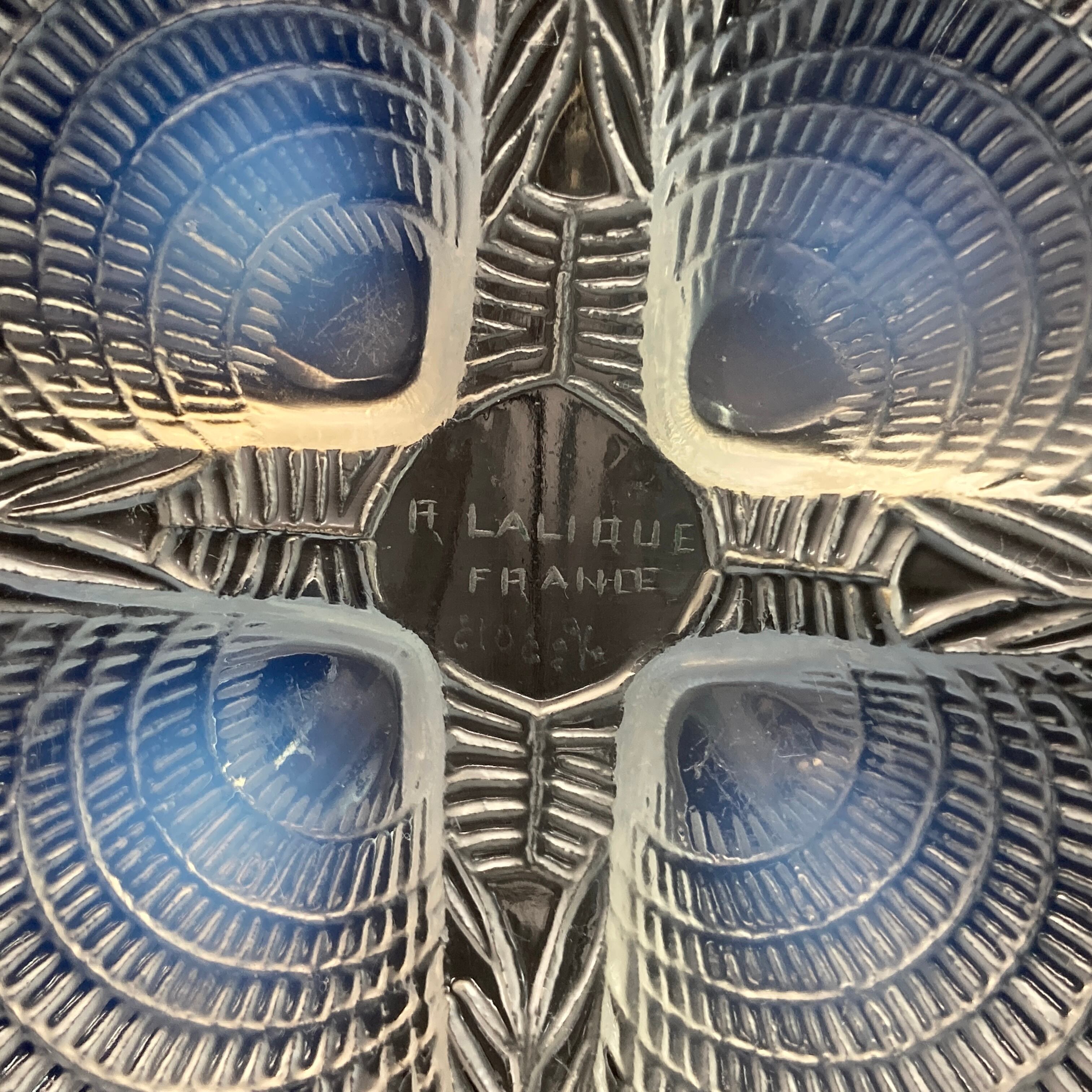 本品はルネ・ラリック作品で特徴的な、美しいブルーオパルセント硝子による作品となり、より一層紋様が浮かび上がる素晴らしい作品となります。