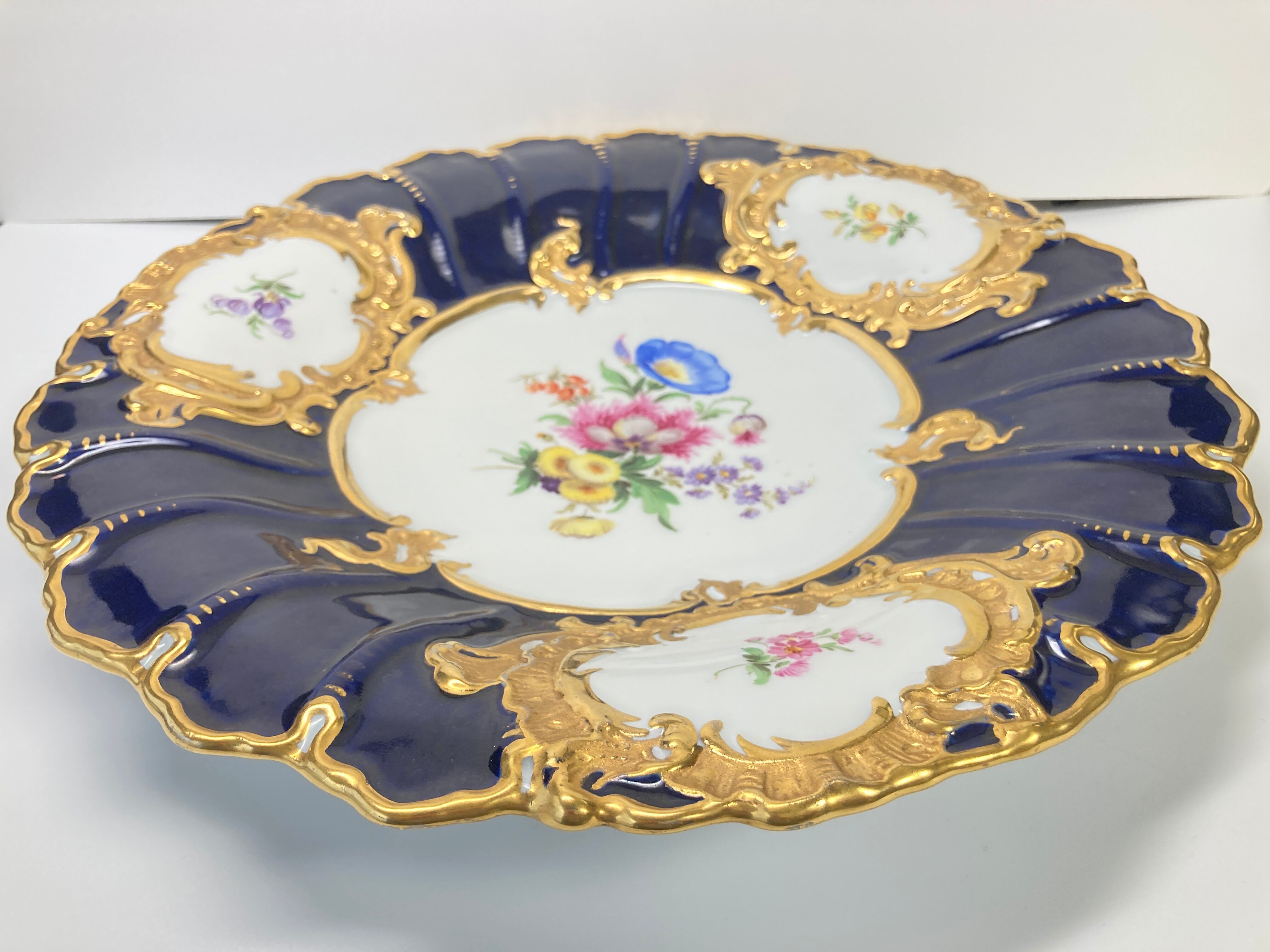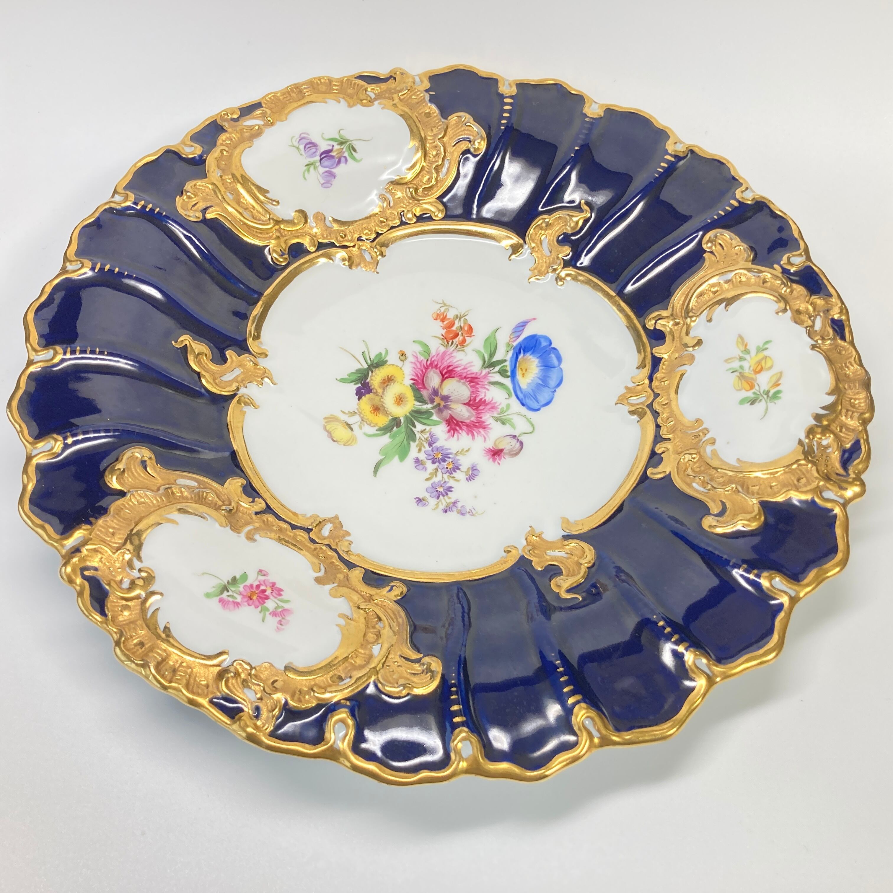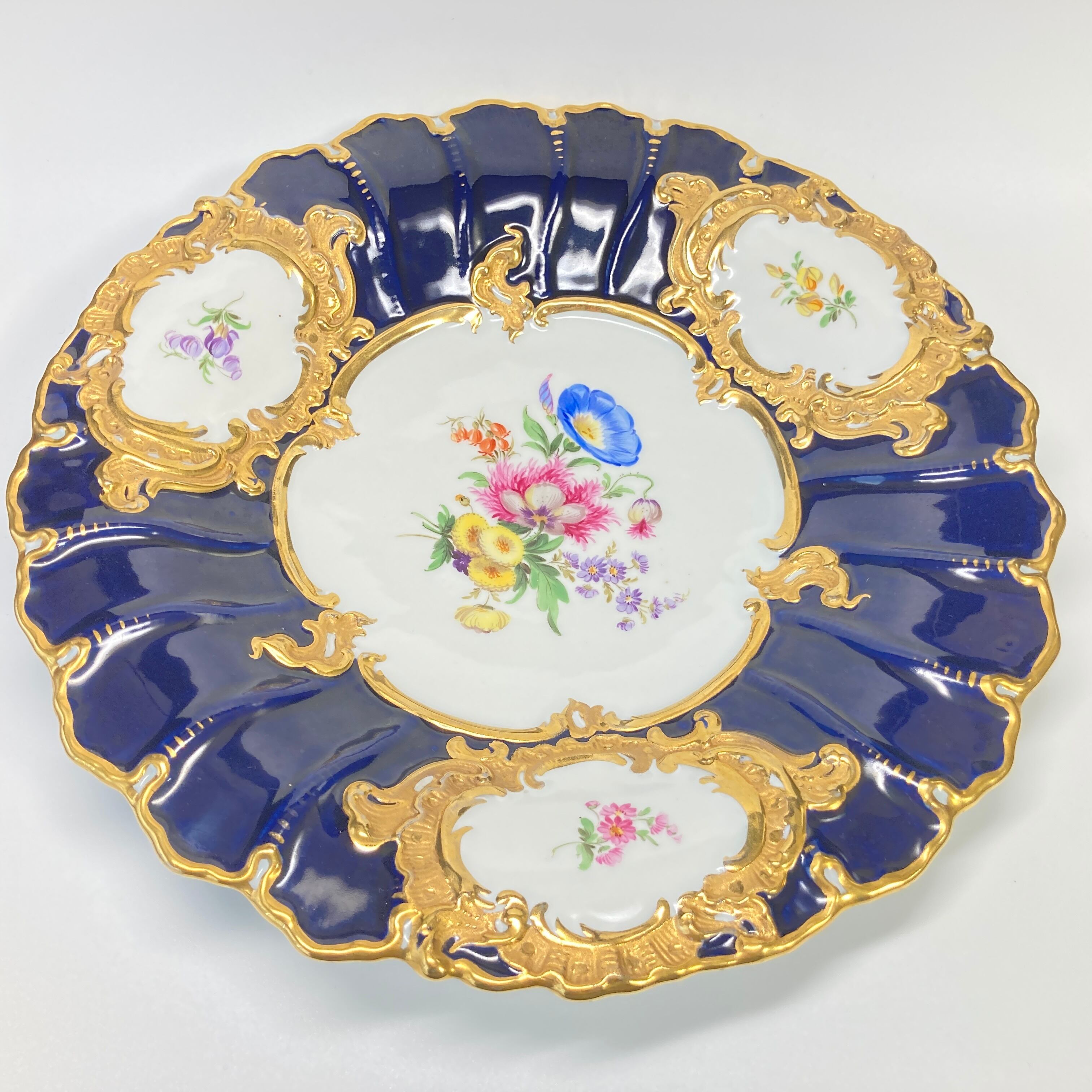 マイセン Bフォーム 5つ花 金彩 グランツ ゴールド フラワーブーケ 飾り皿 大皿 キャビネットプレート 30cm コバルト