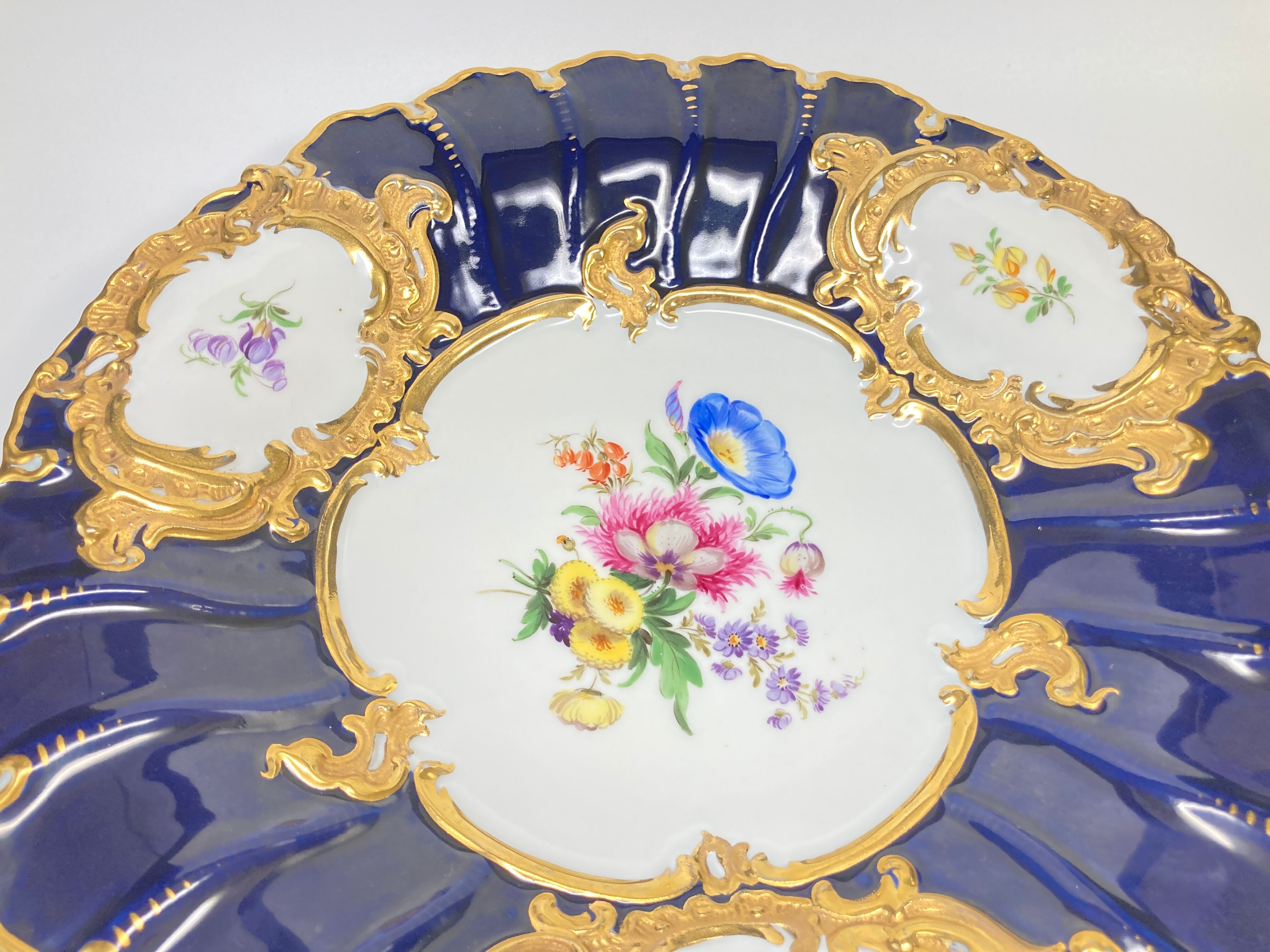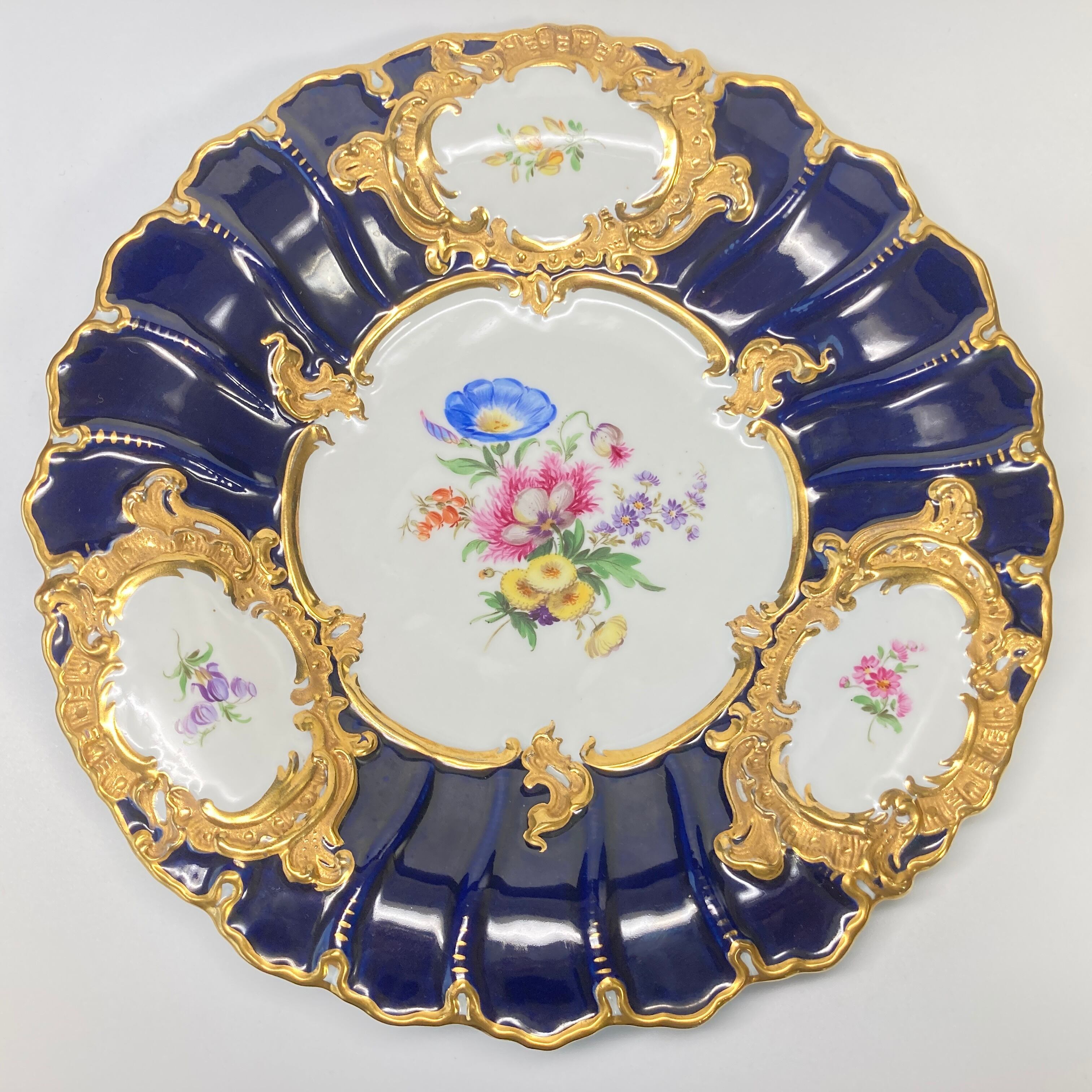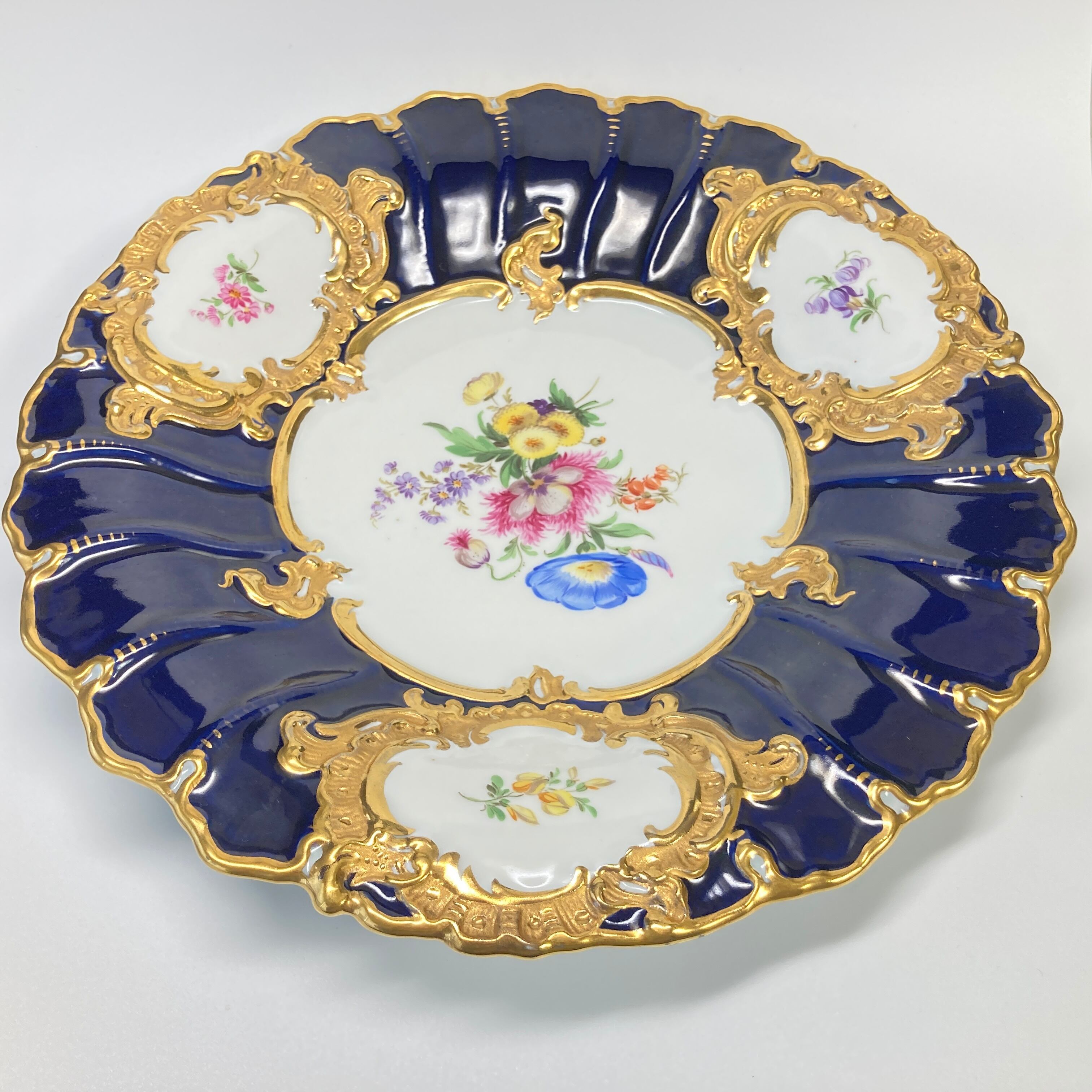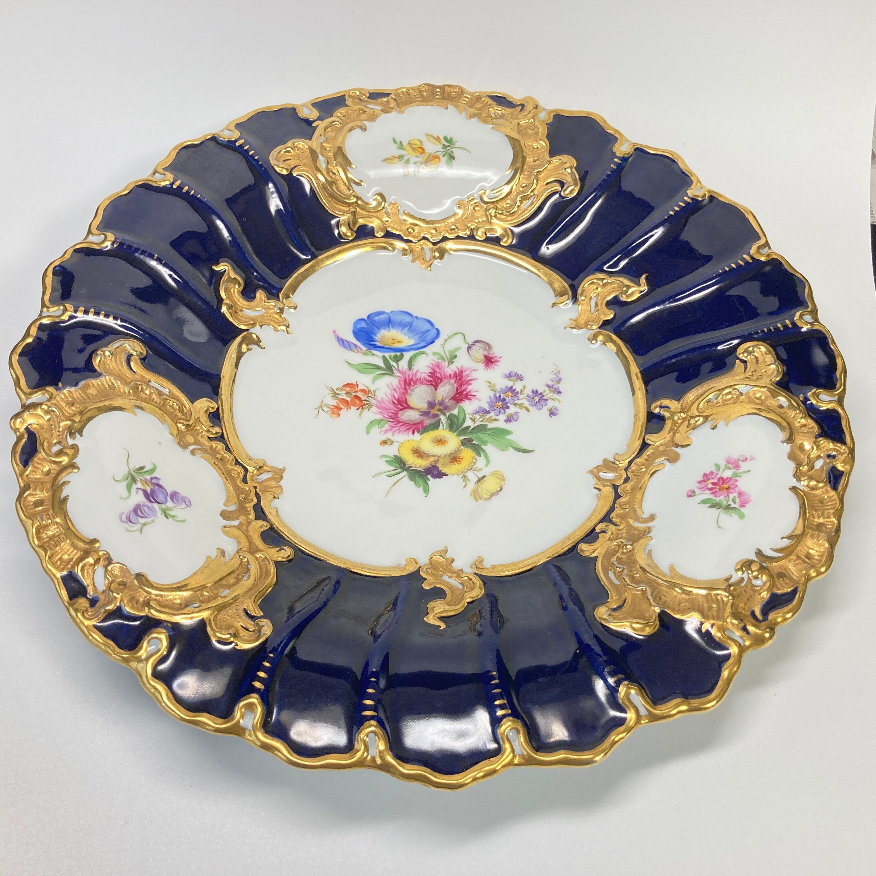 マイセン Bフォーム 5つ花 金彩 グランツ ゴールド フラワーブーケ 飾り皿 大皿 キャビネットプレート 30cm コバルト