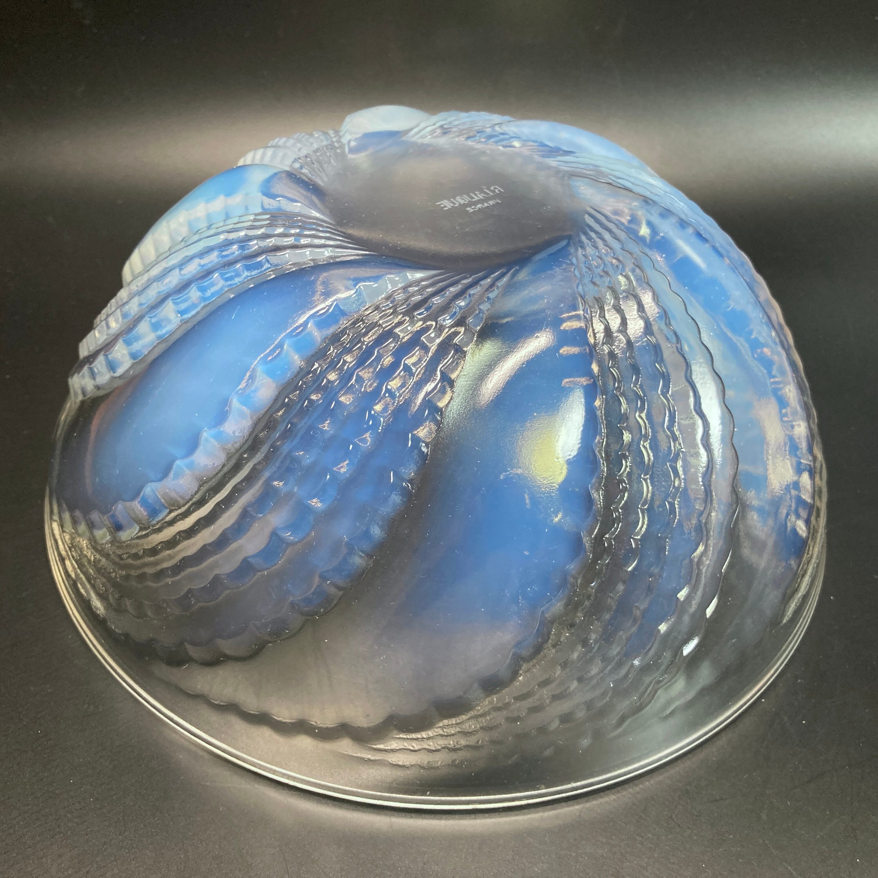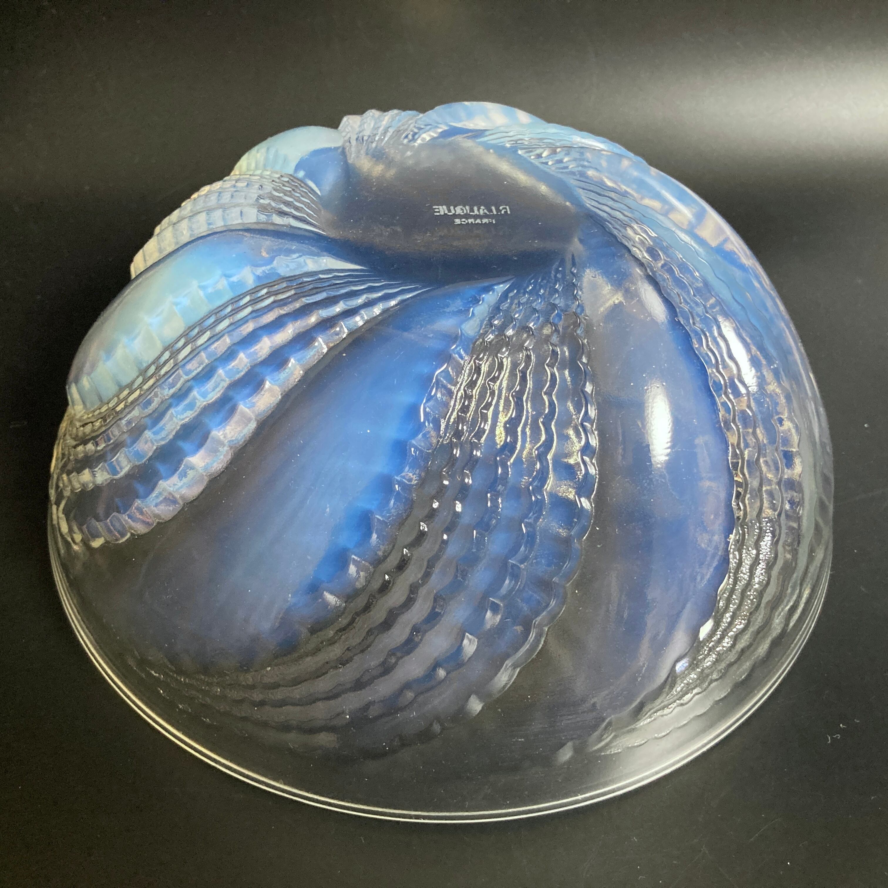 本品はルネ・ラリック作品で特徴的な美しいブルーオパルセント硝子による作品となり、より一層紋様が浮かび上がる素晴らしい作品となります。