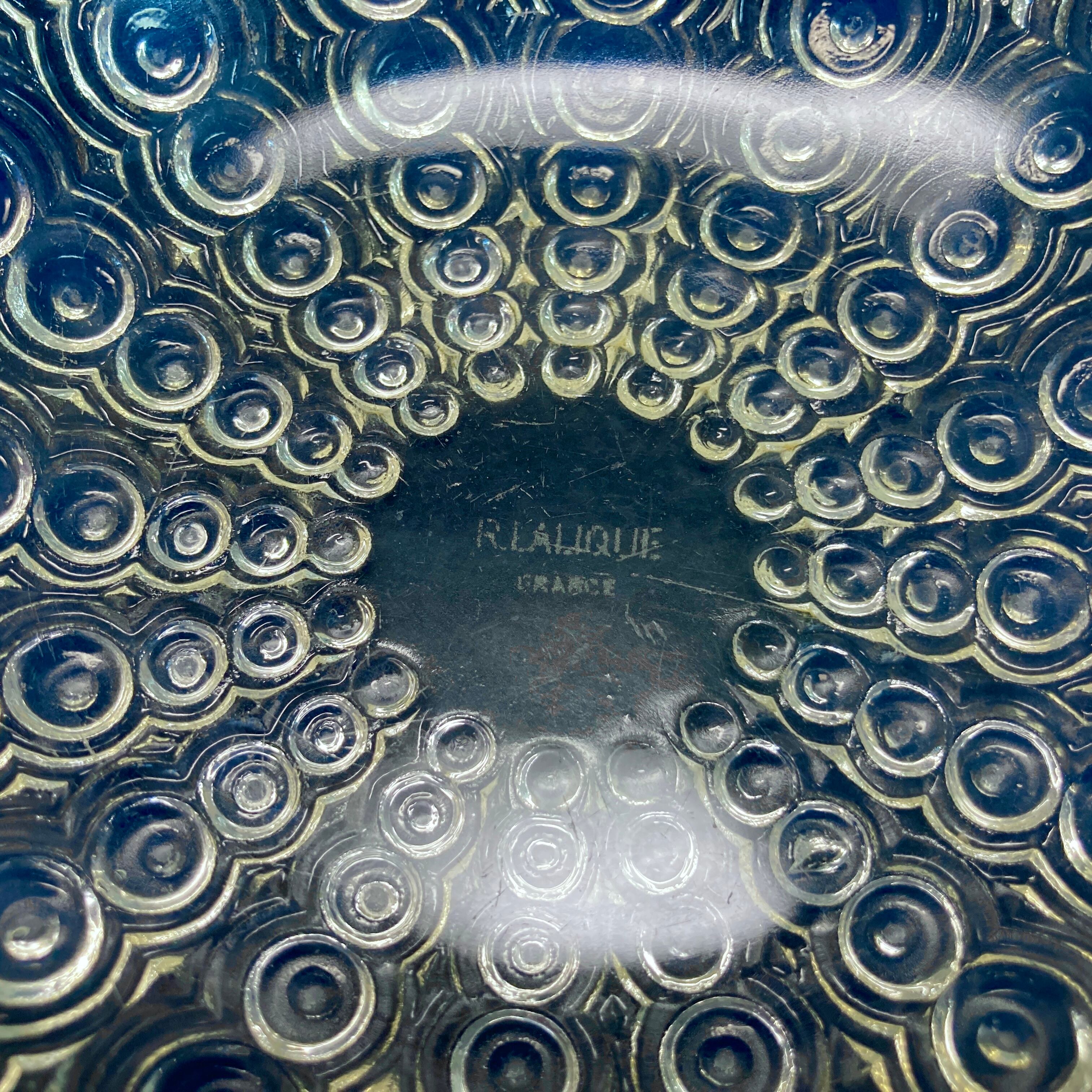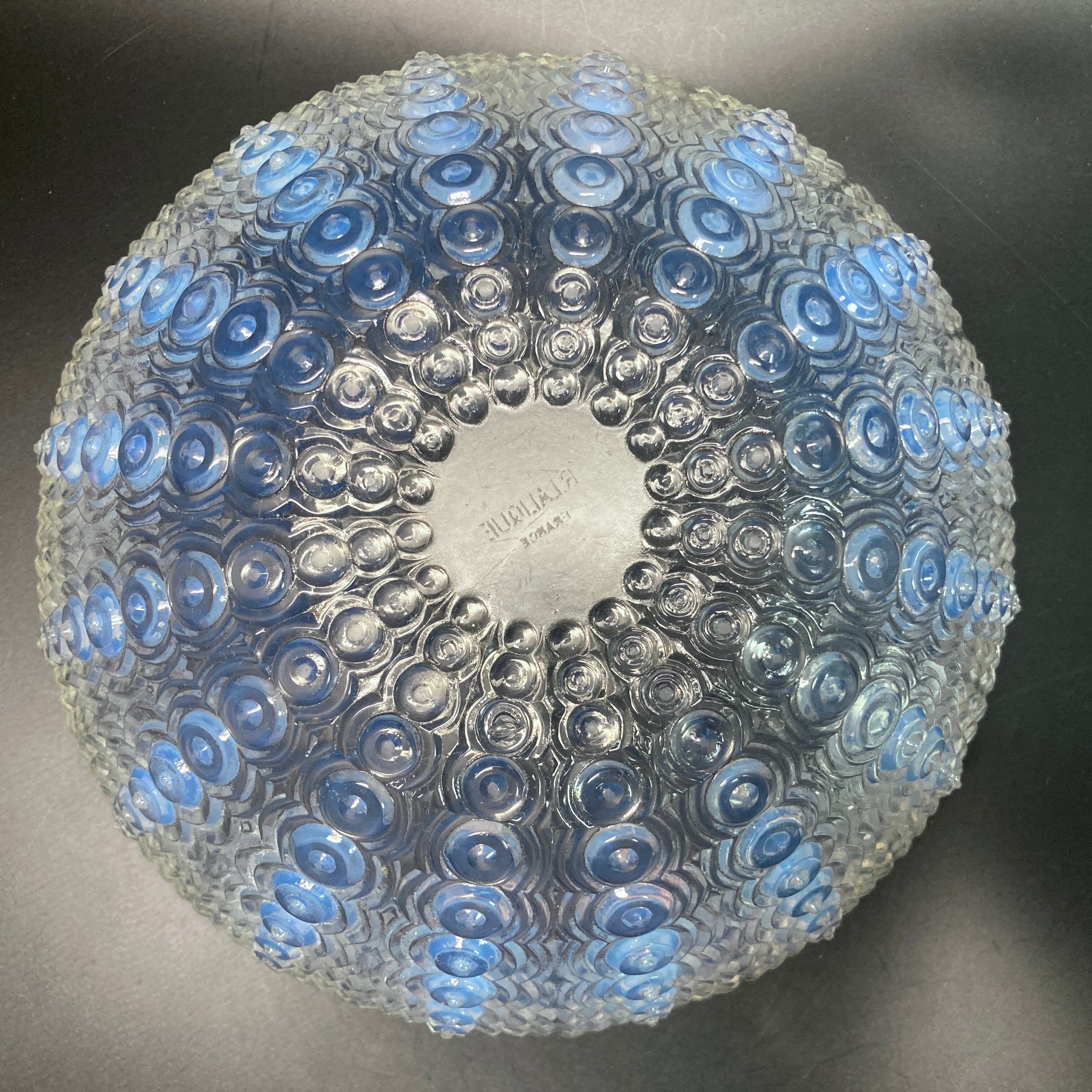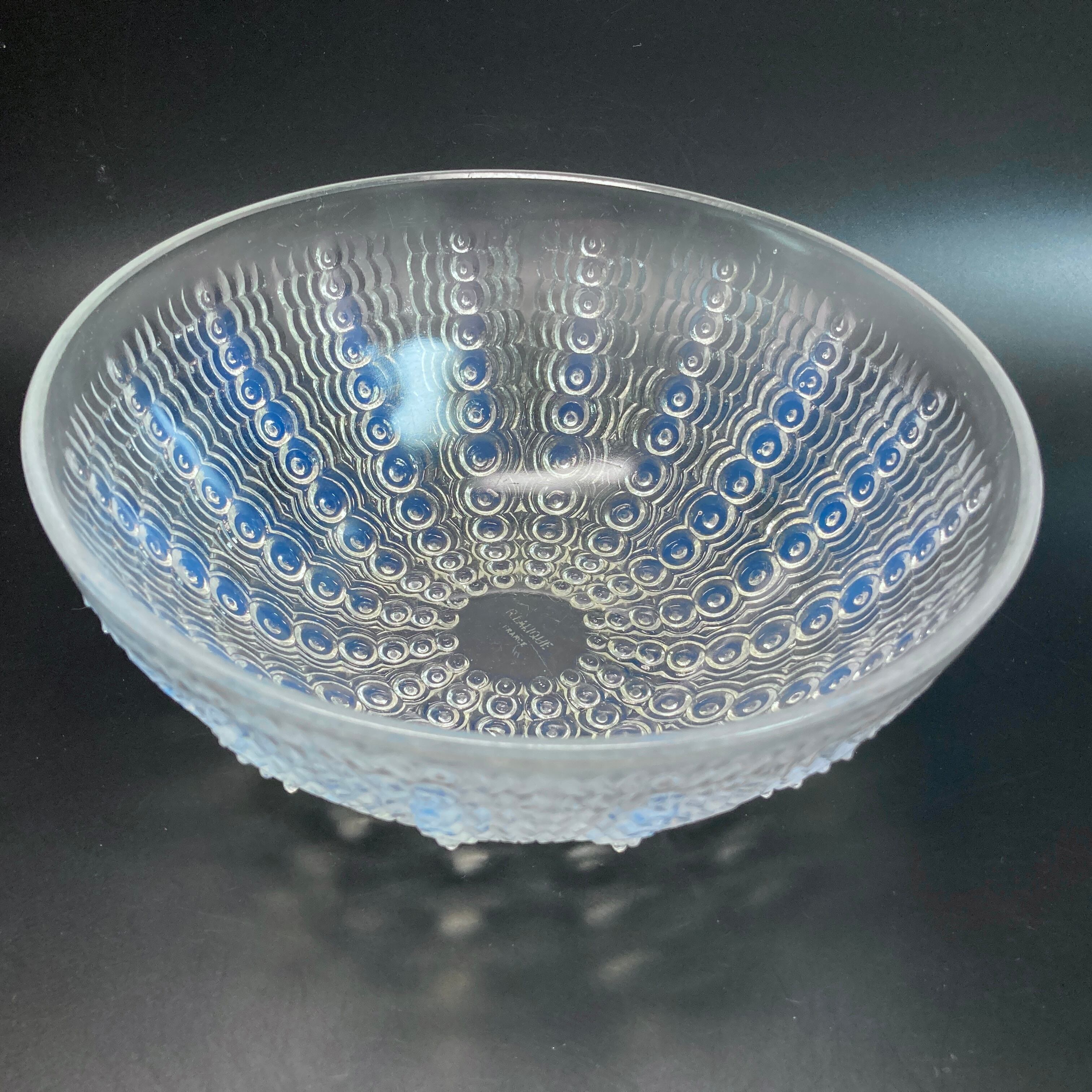 本品はルネ・ラリック作品で特徴的な美しいブルーオパルセント硝子による作品となり、より一層紋様が浮かび上がる素晴らしい作品となります。