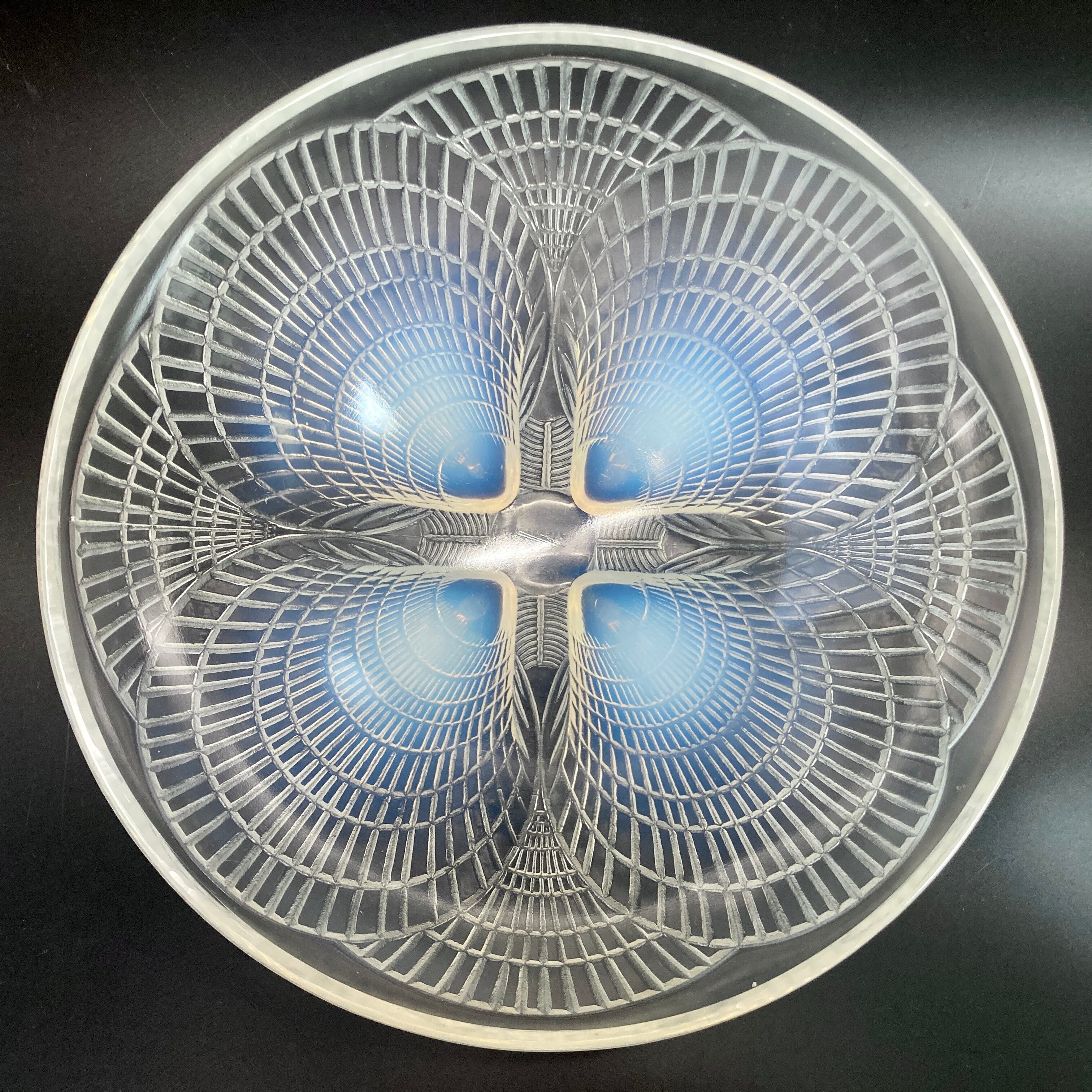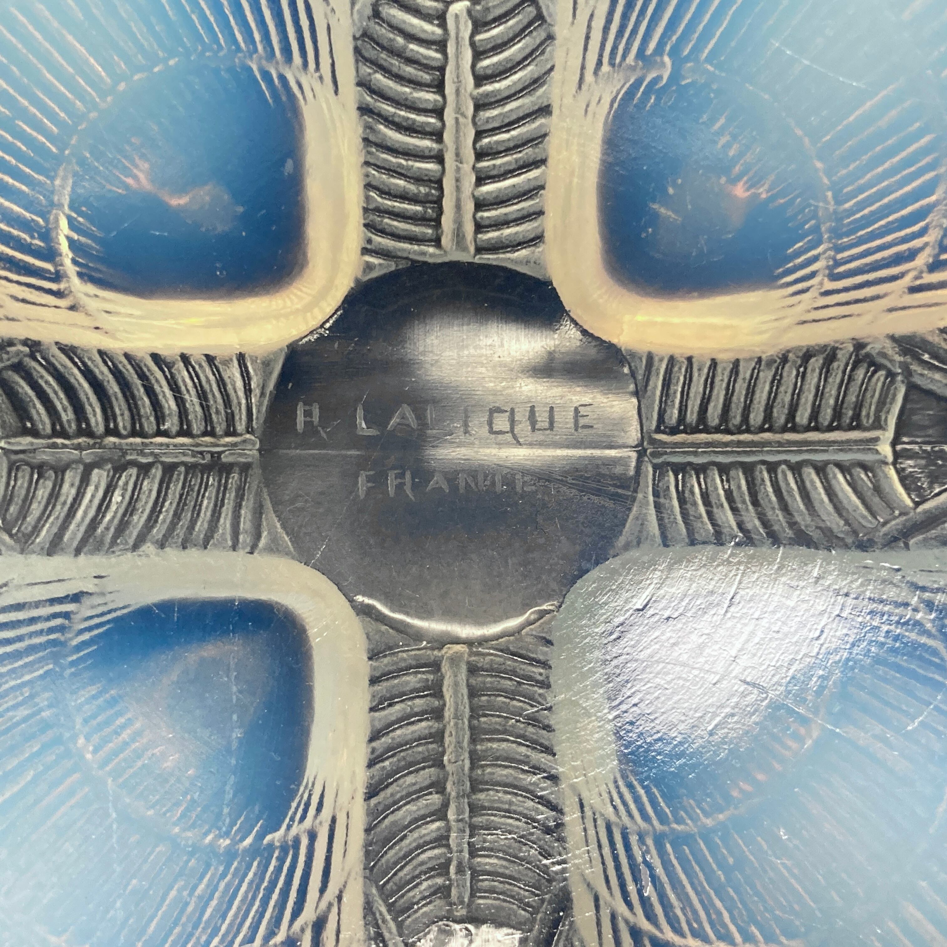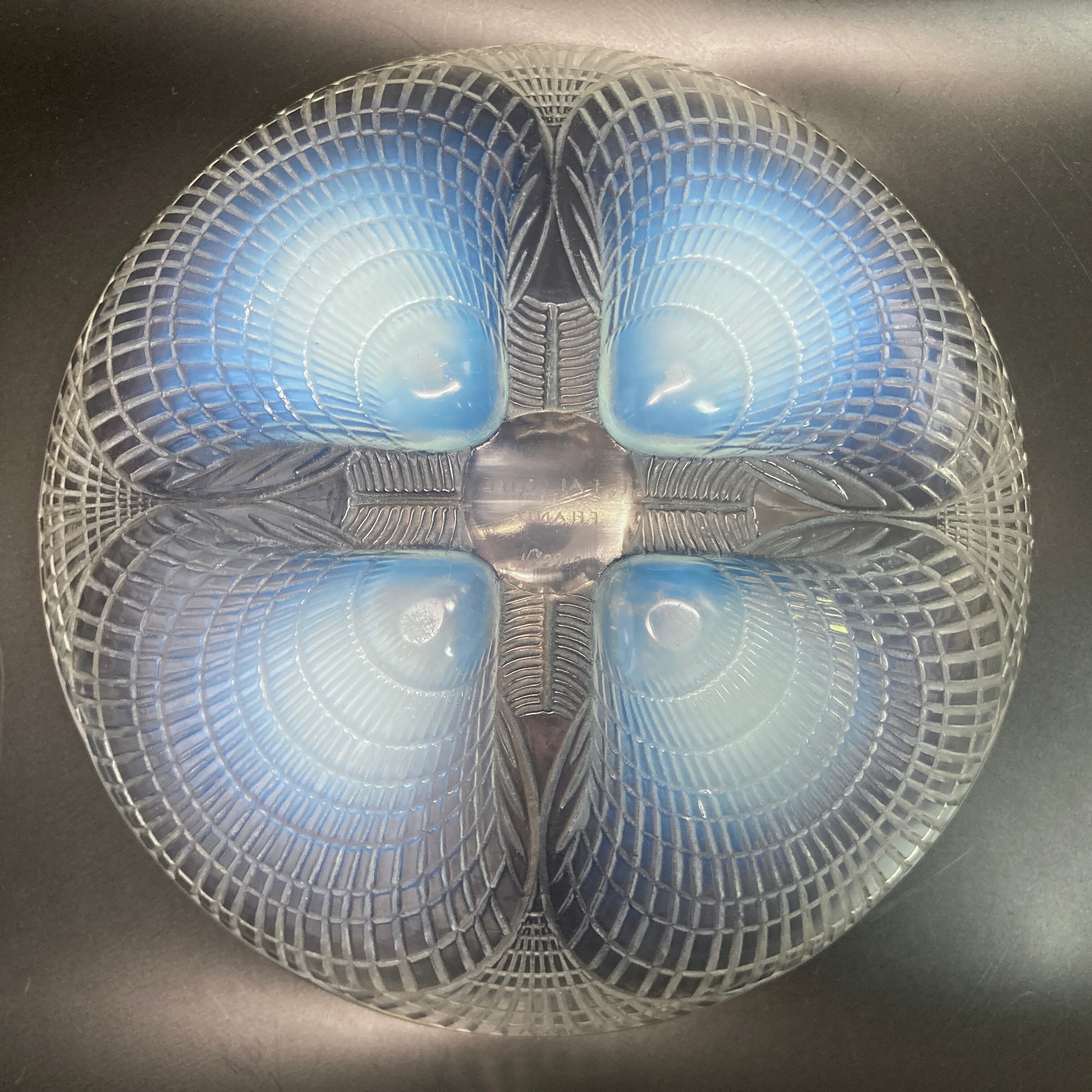 本品はルネ・ラリック作品で特徴的な、美しいブルーオパルセント硝子による作品となり、より一層紋様が浮かび上がる素晴らしい作品となります。