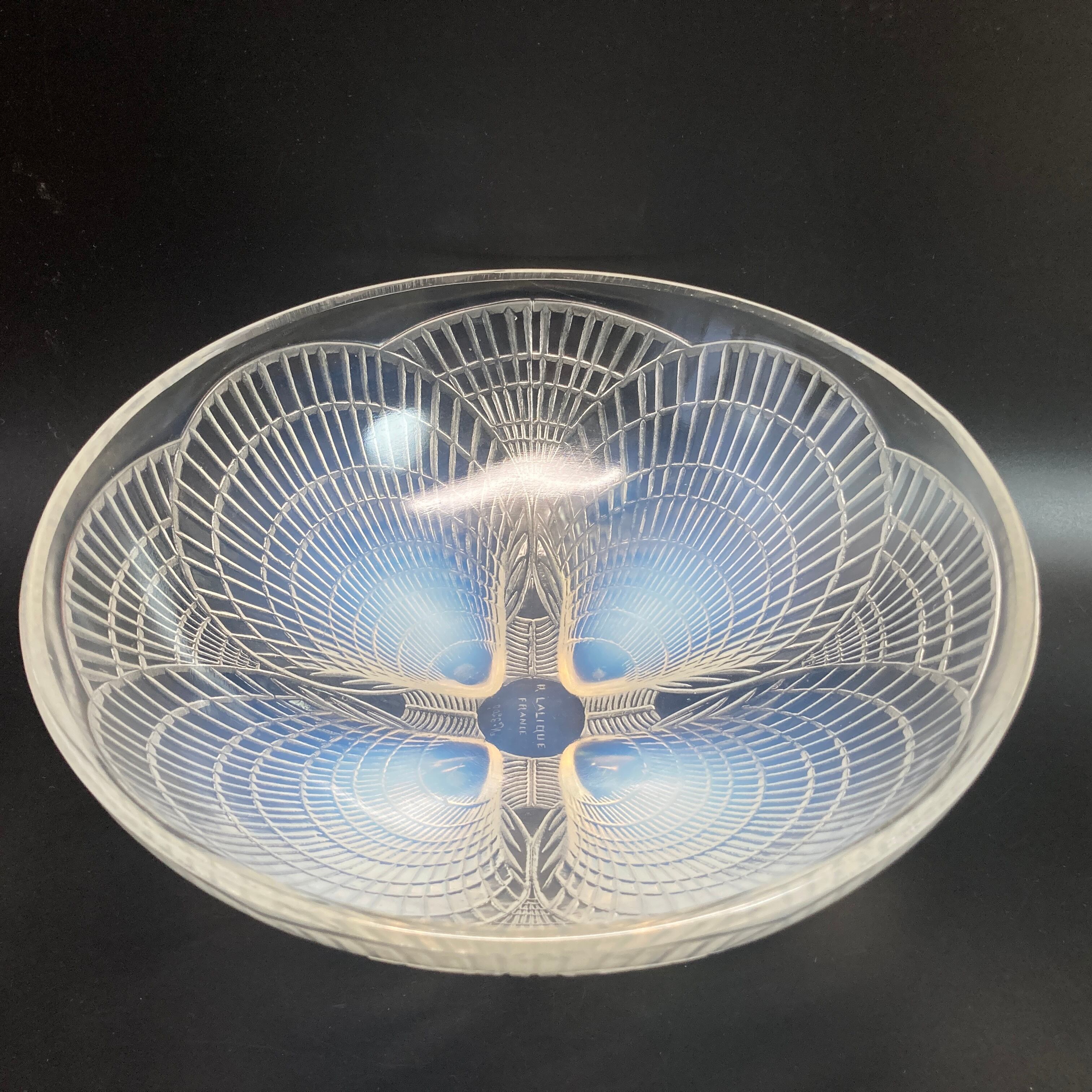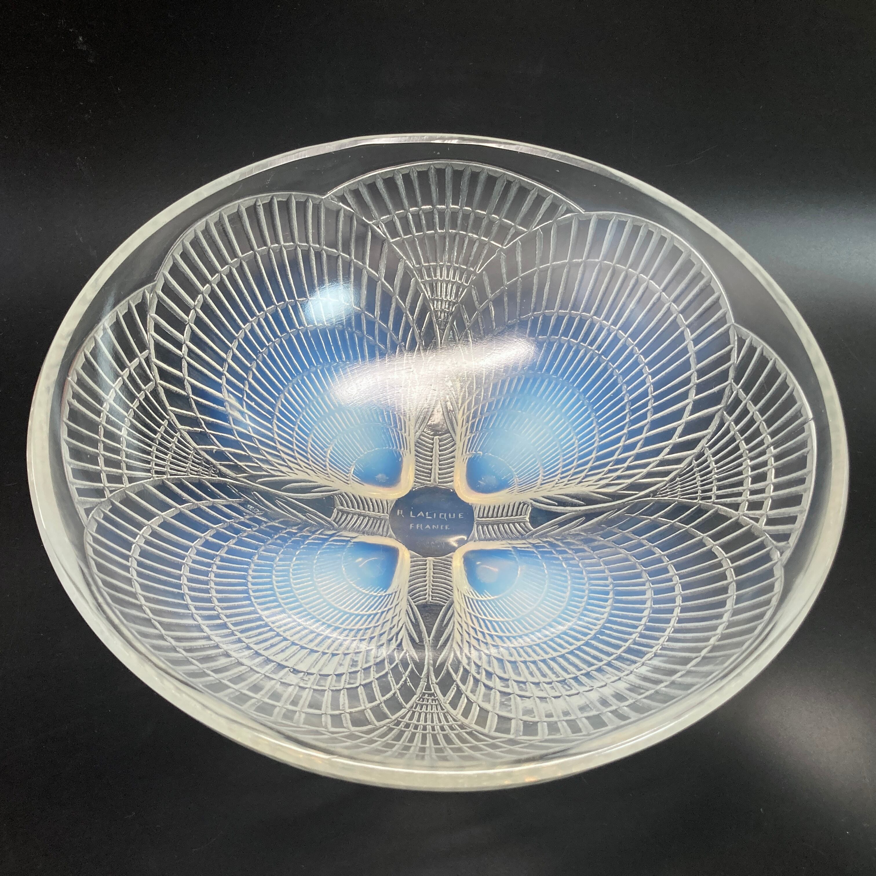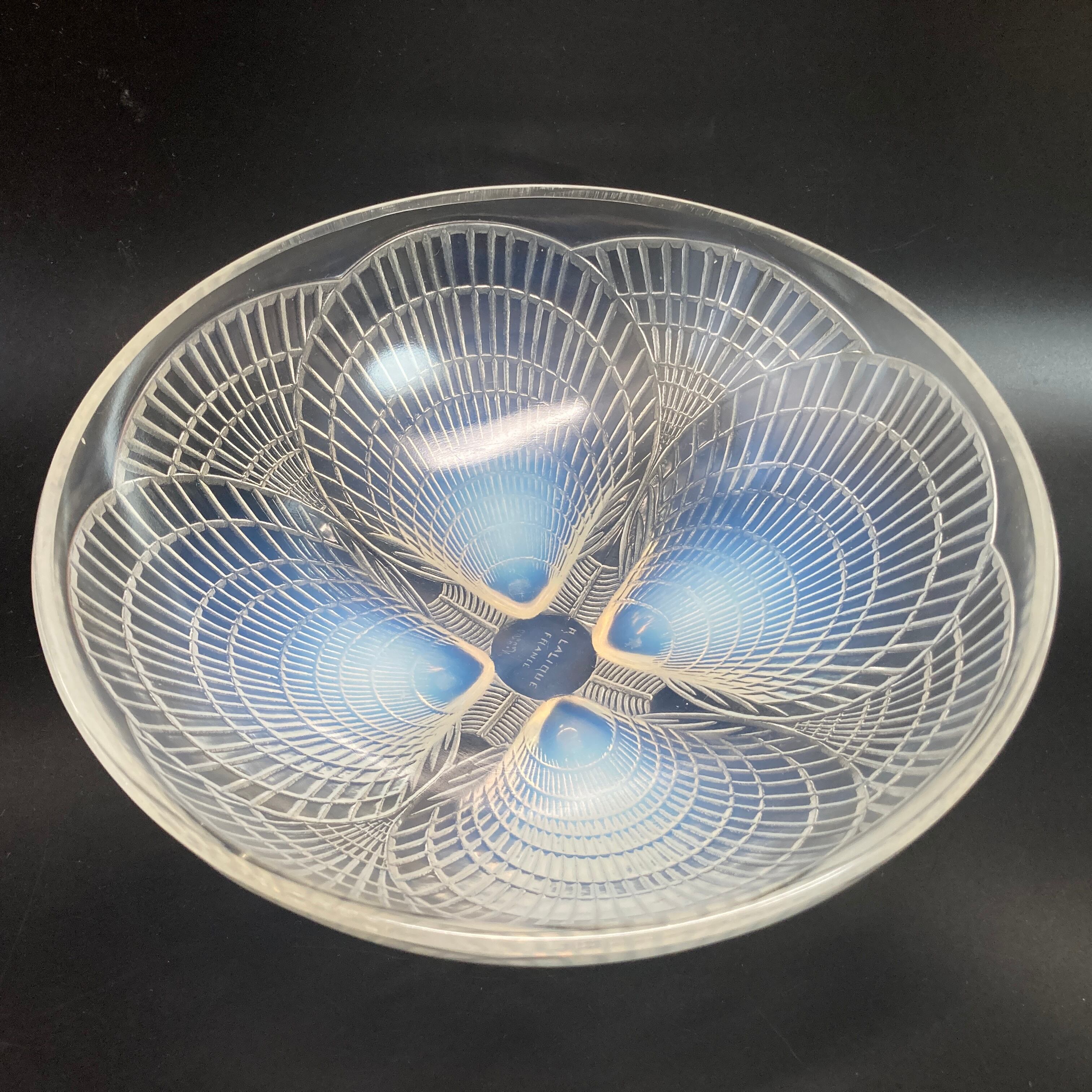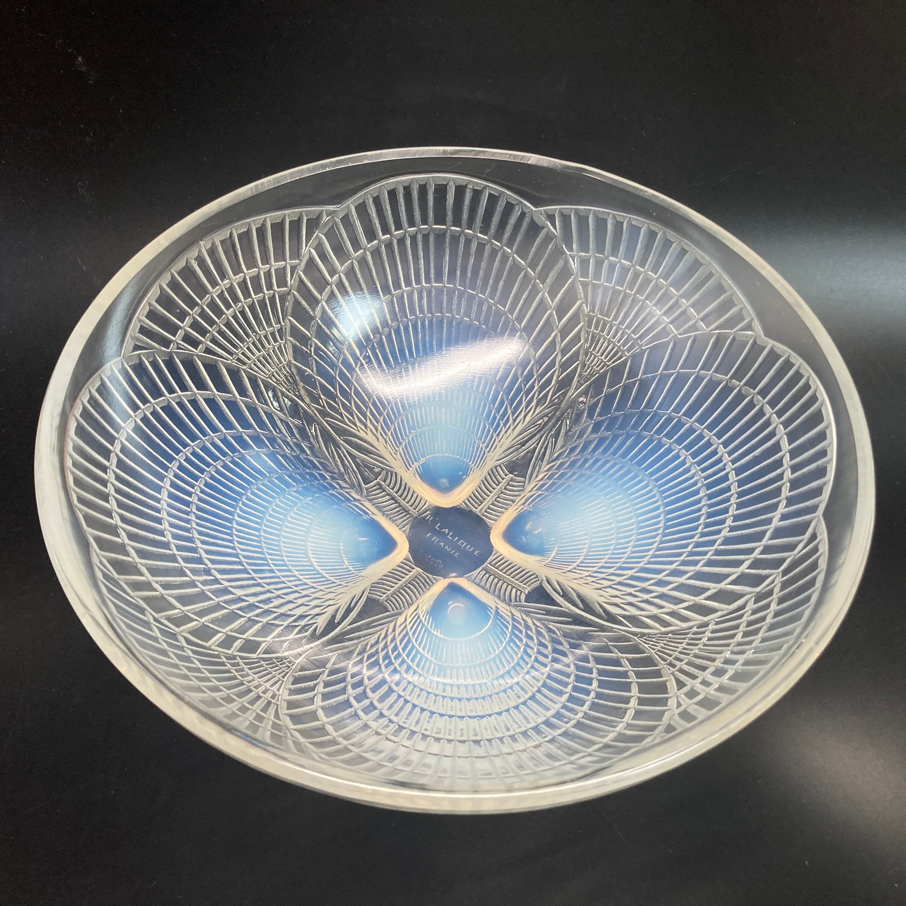 本品はルネ・ラリック作品で特徴的な、美しいブルーオパルセント硝子による作品となり、より一層紋様が浮かび上がる素晴らしい作品となります。