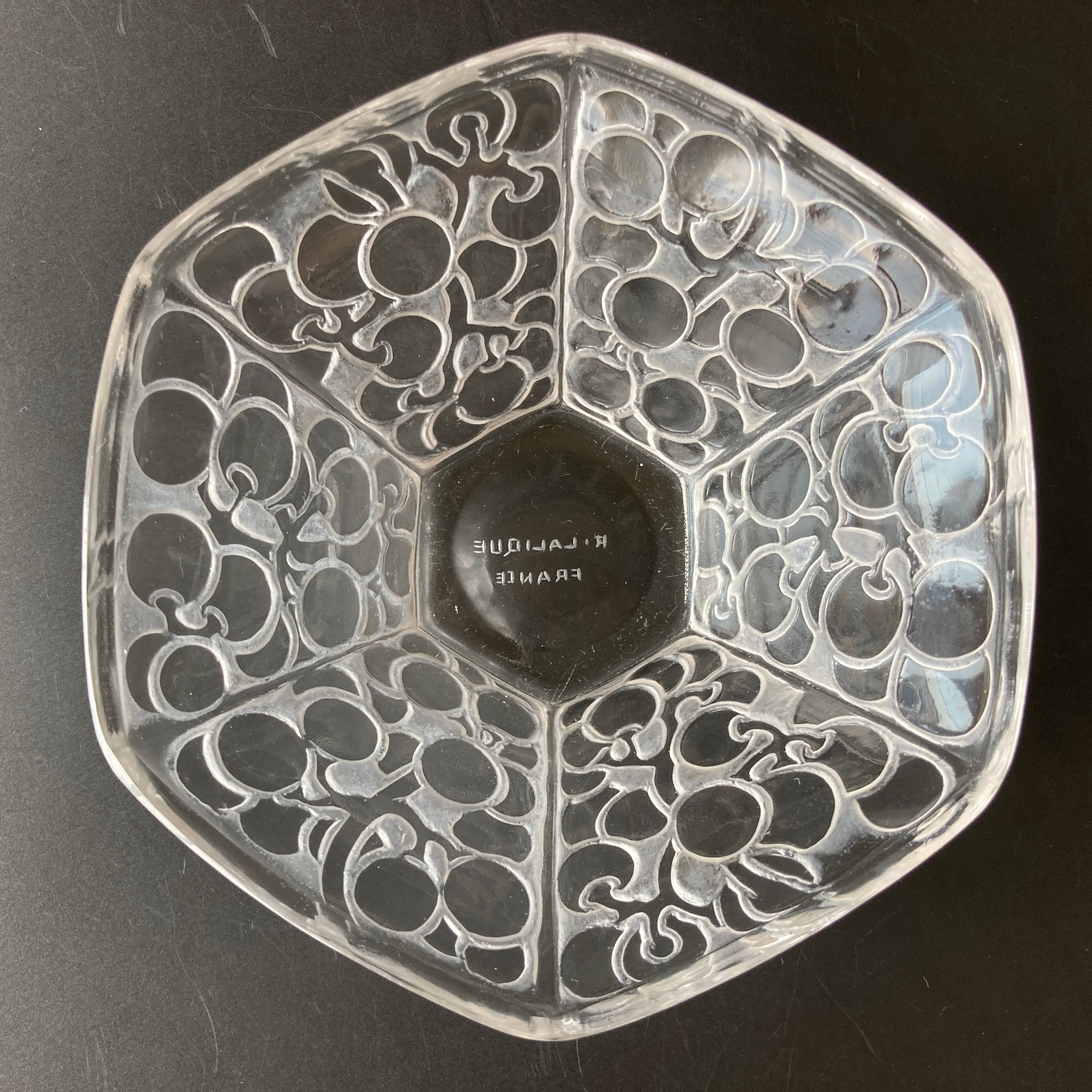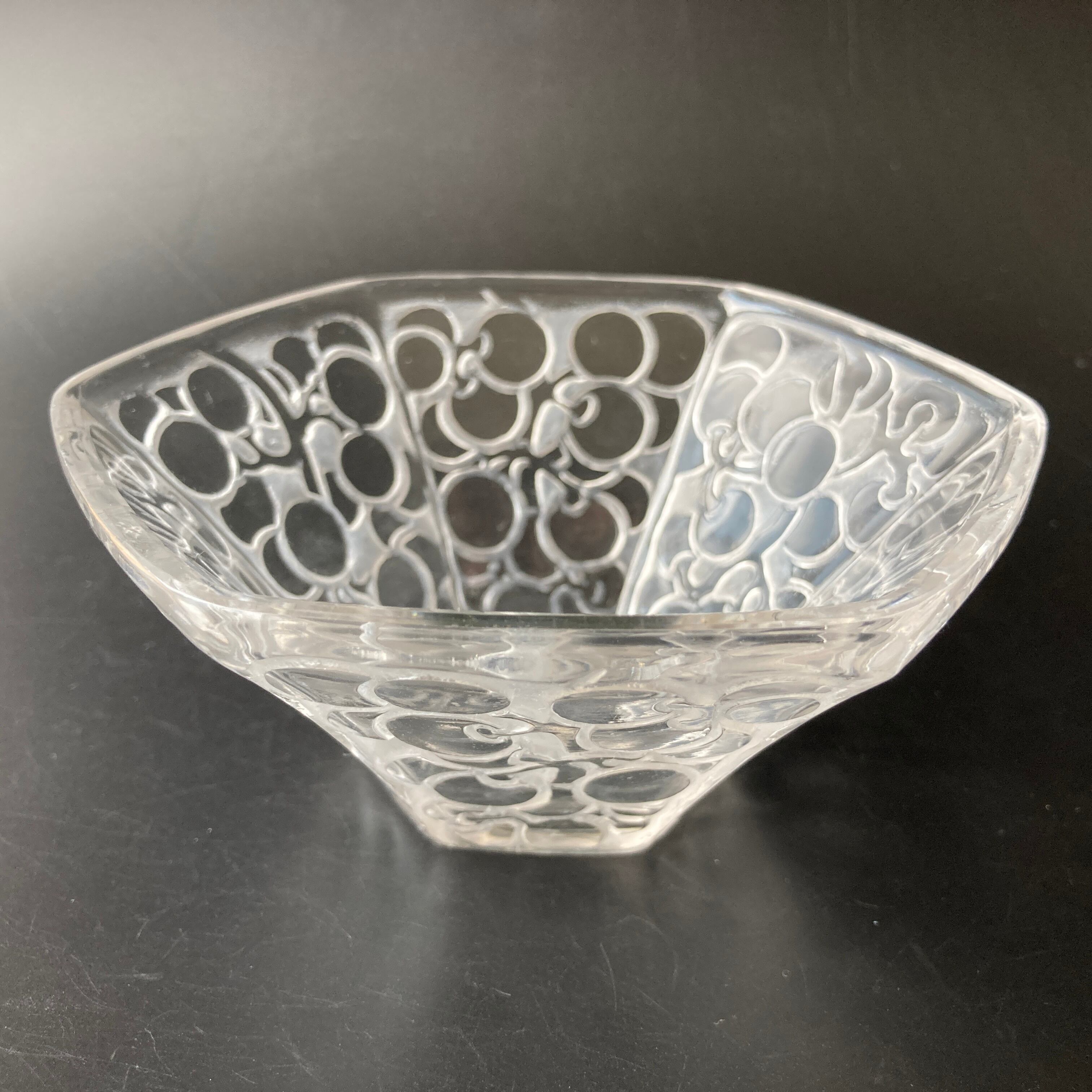 ボウルのそれぞれの面にはデフォルメされた葡萄の実のレリーフがデザインされており、ラリックならではの卓越した芸術性と高い制作技術を感じさせる作品です。