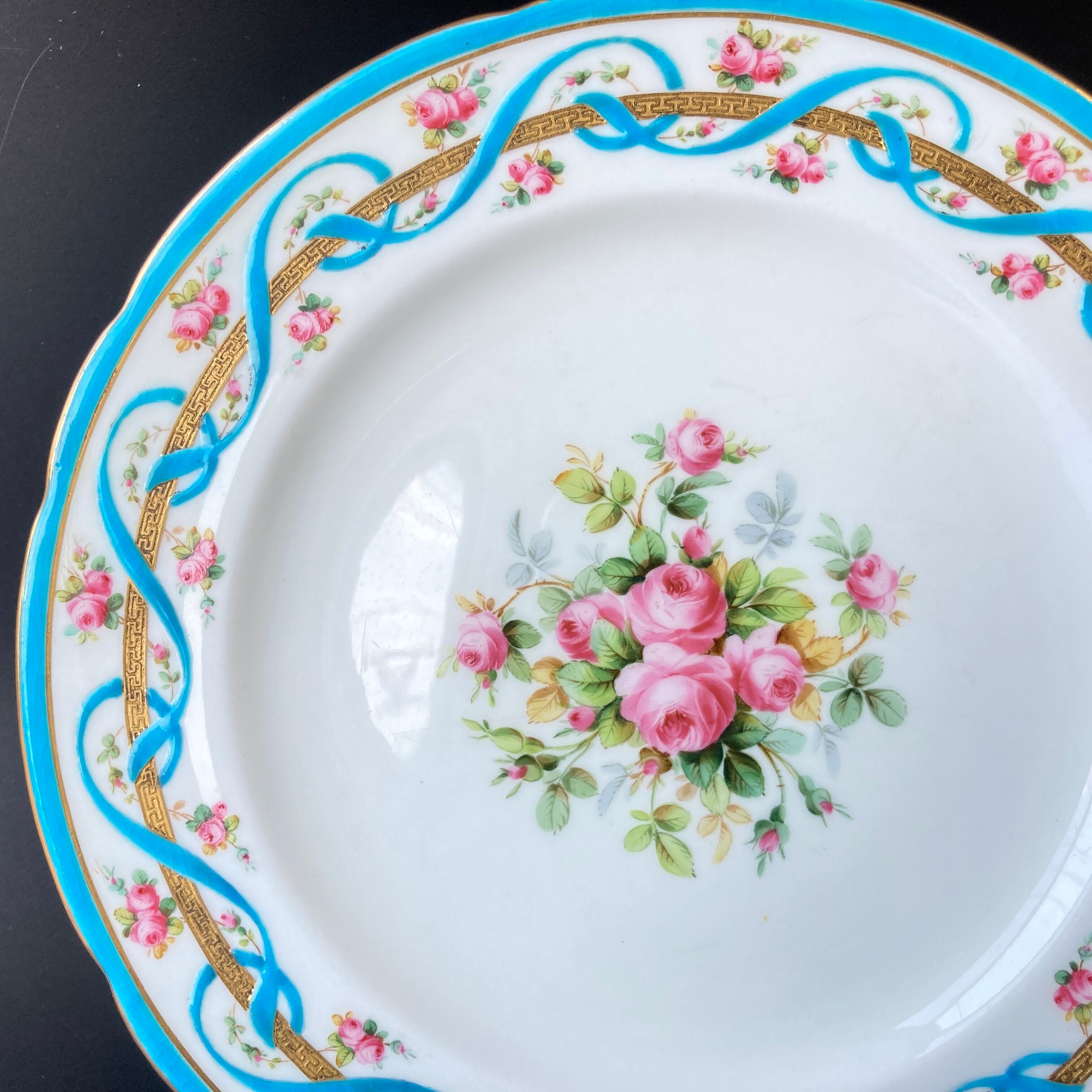 こちらの作品ではターコイズブルーによるリボン状の装飾がお皿の周囲に施されています。