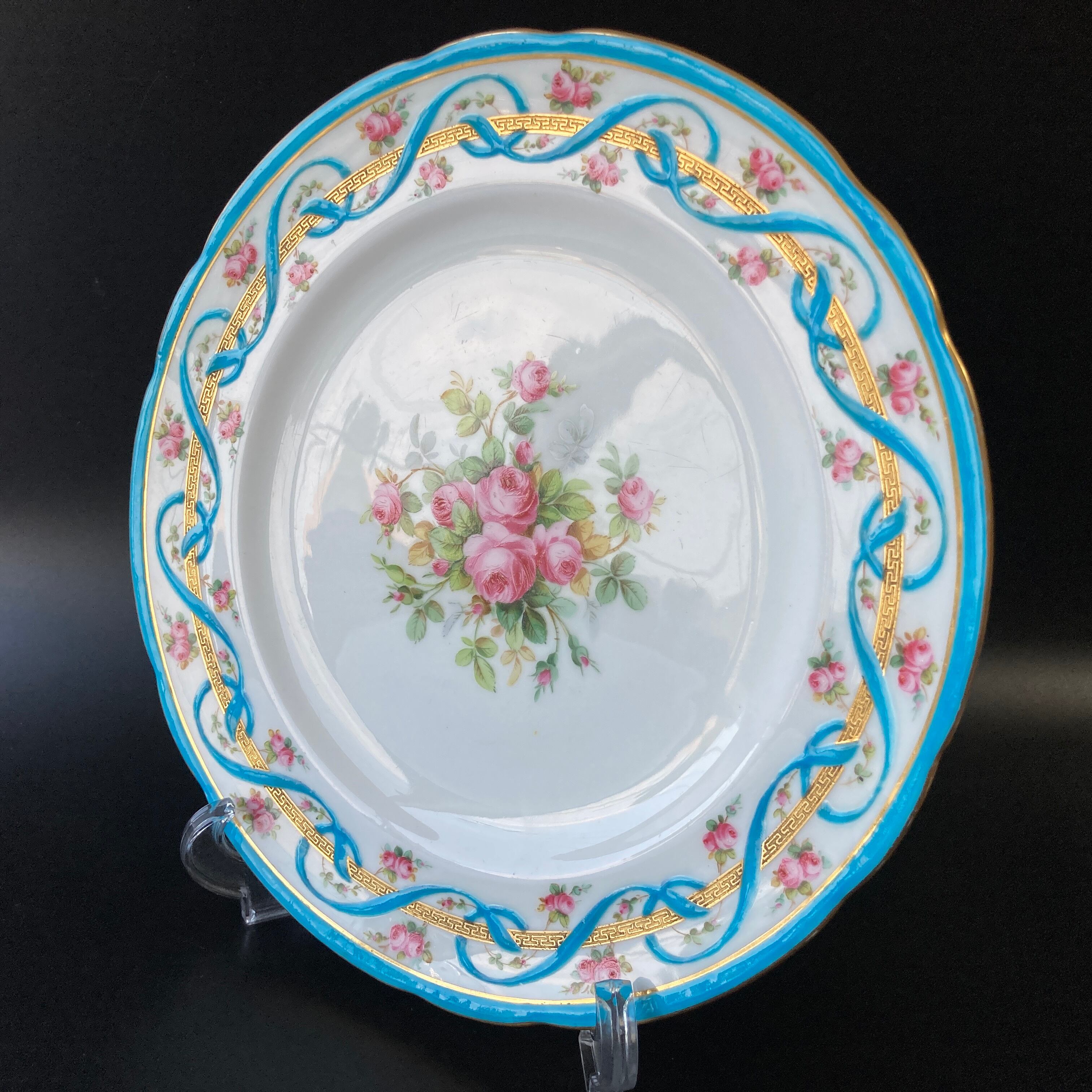 ミントン ターコイズブルー ローズガーランド リボン 薔薇絵図飾皿 エナメル金彩 プレート 大皿