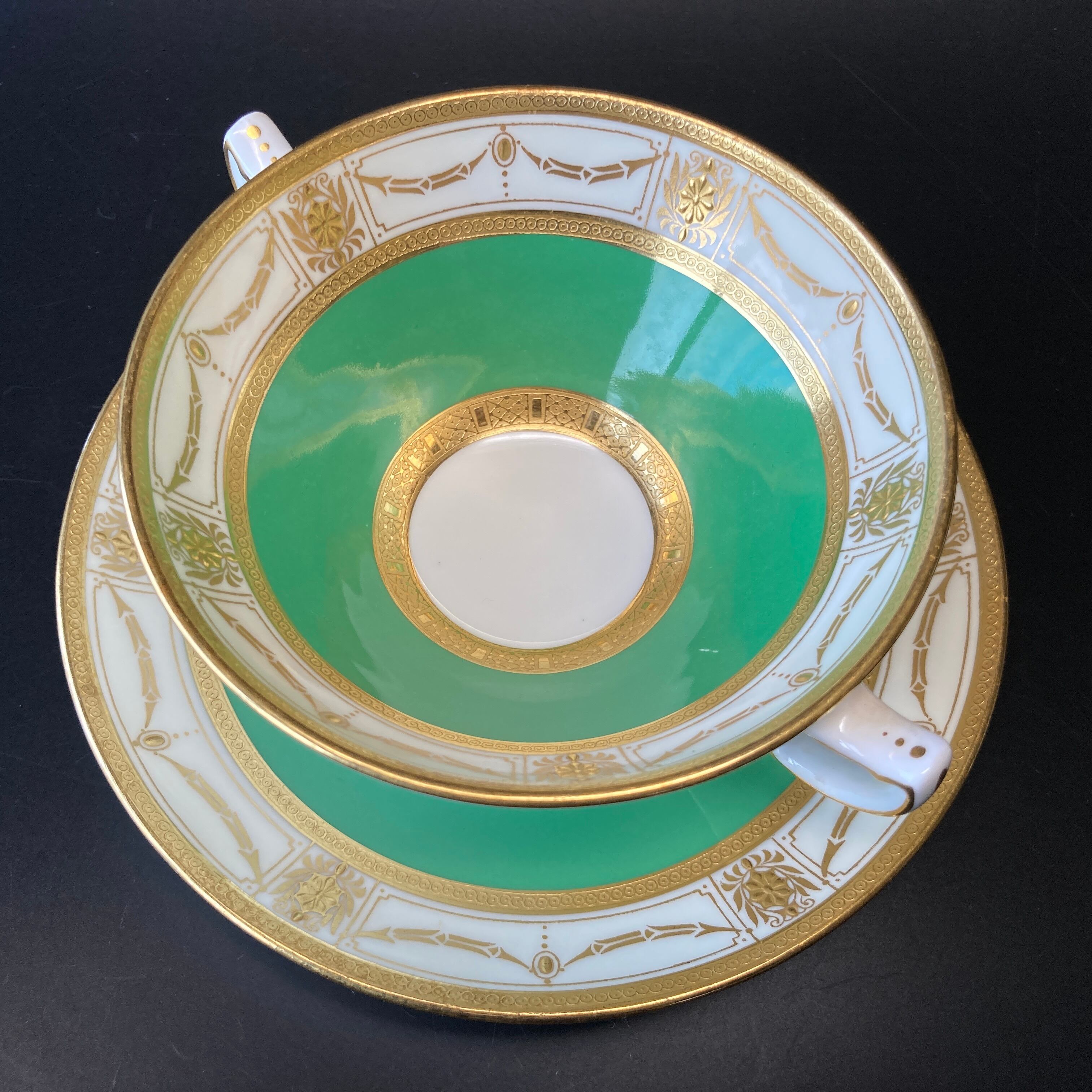 ミントンのお家芸である金彩がカップとソーサーの全周に施され、部分的に金を盛り上げて立体的に表現する金盛も用いられています。