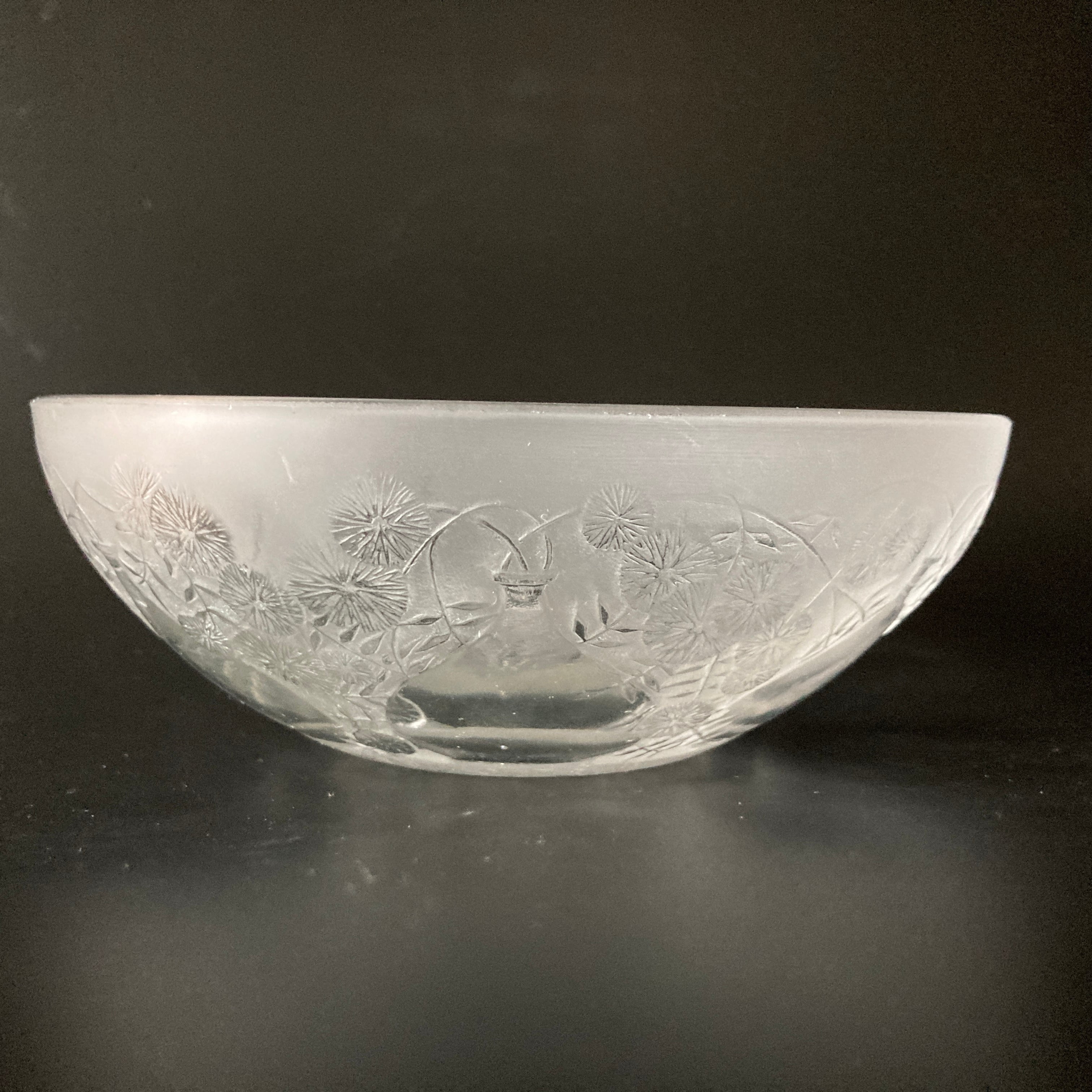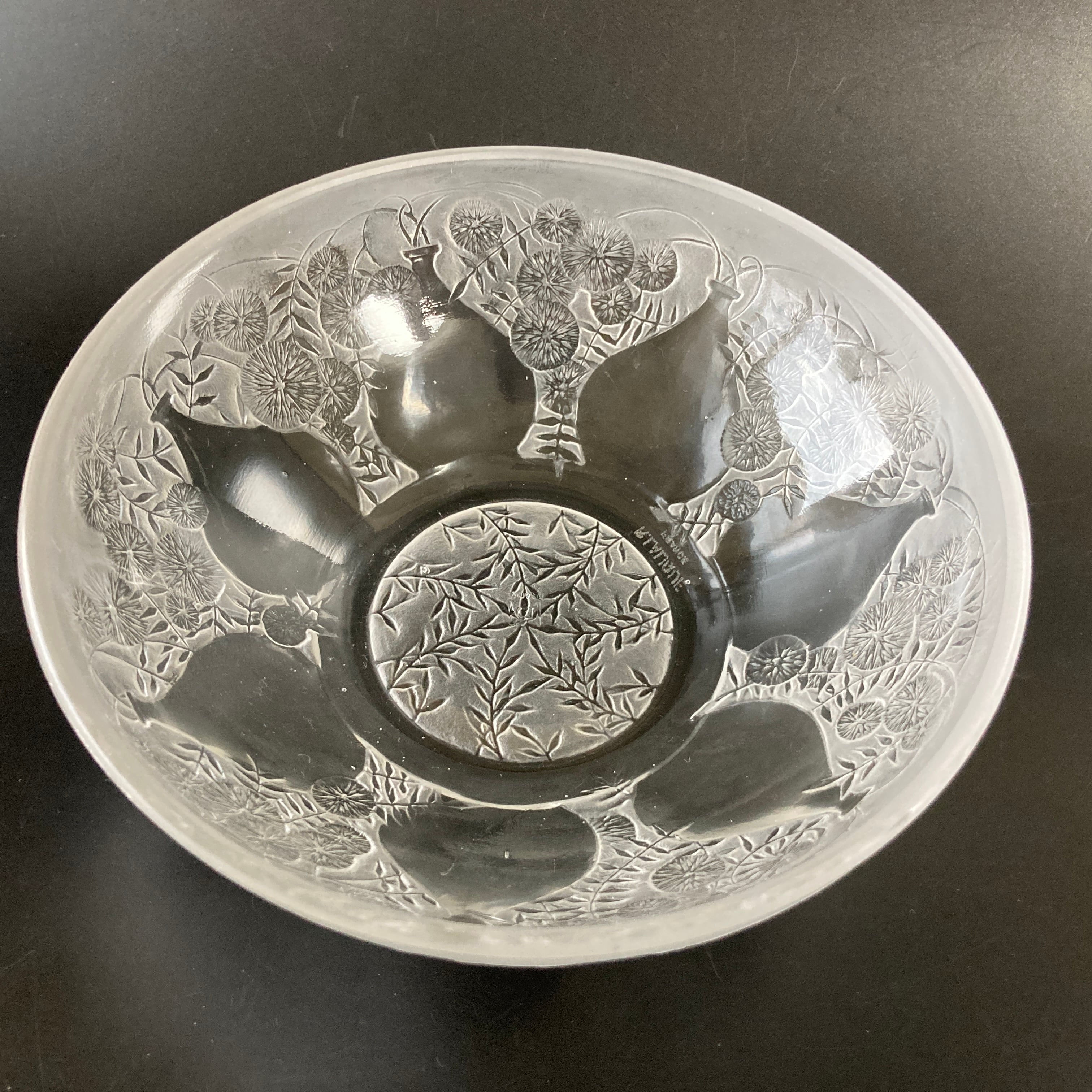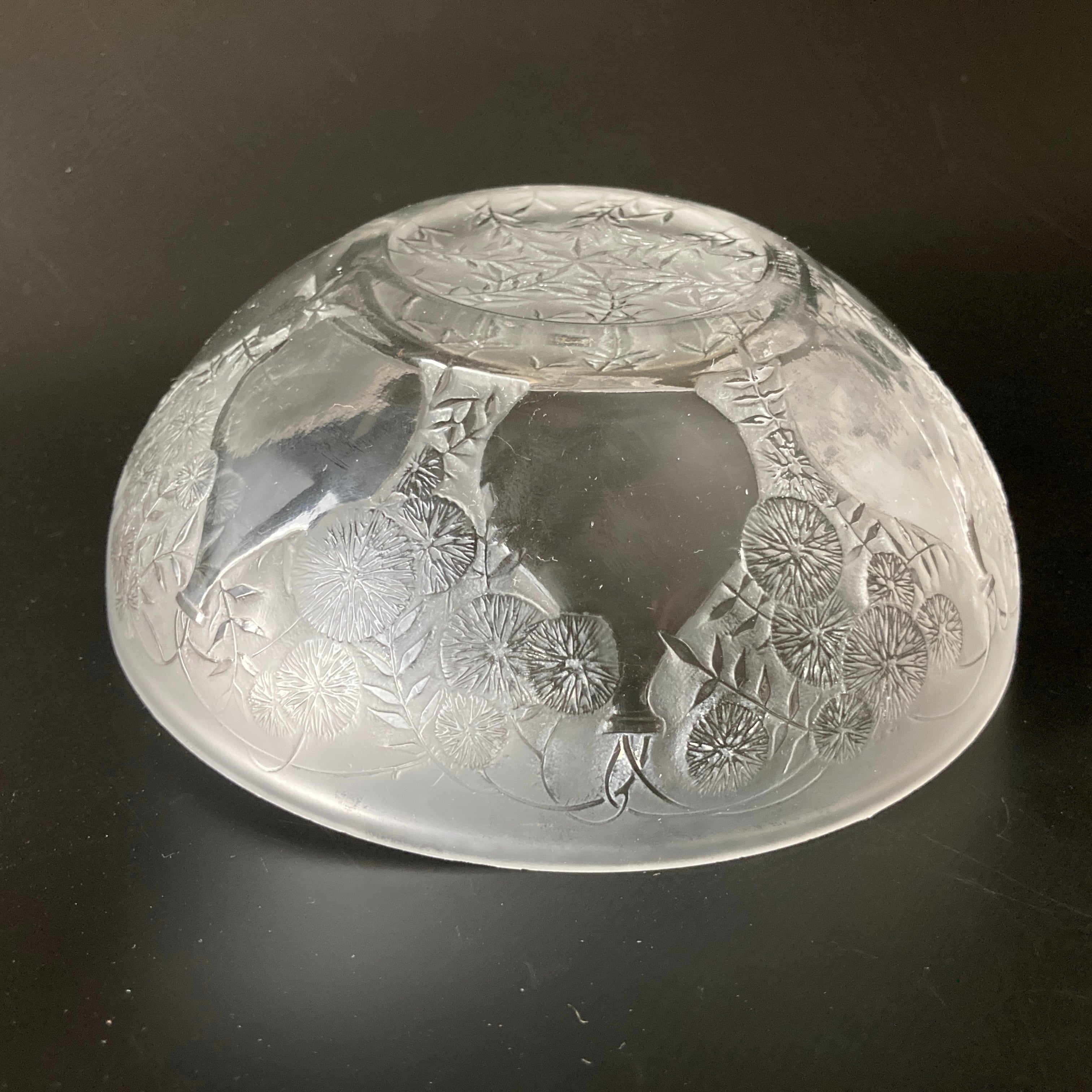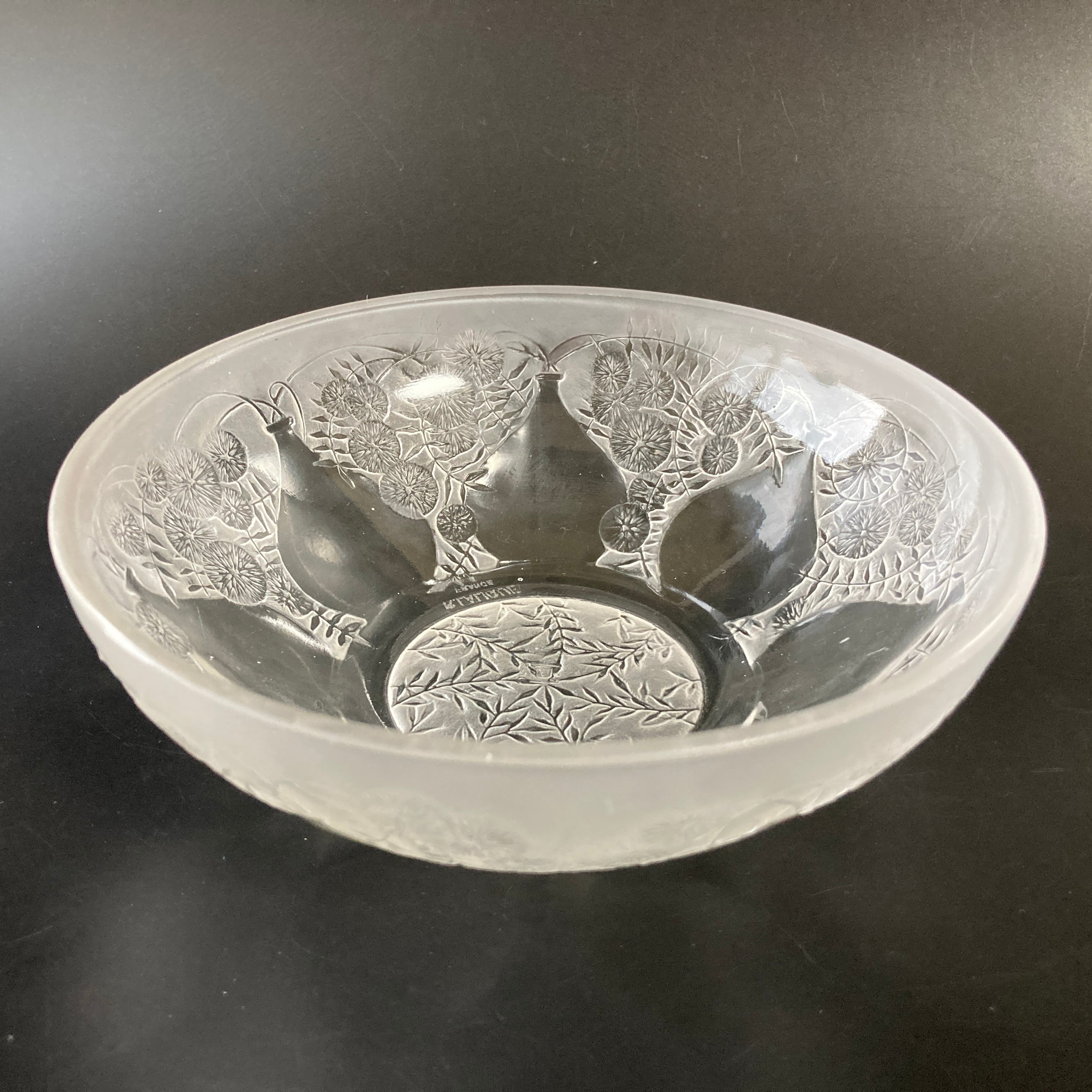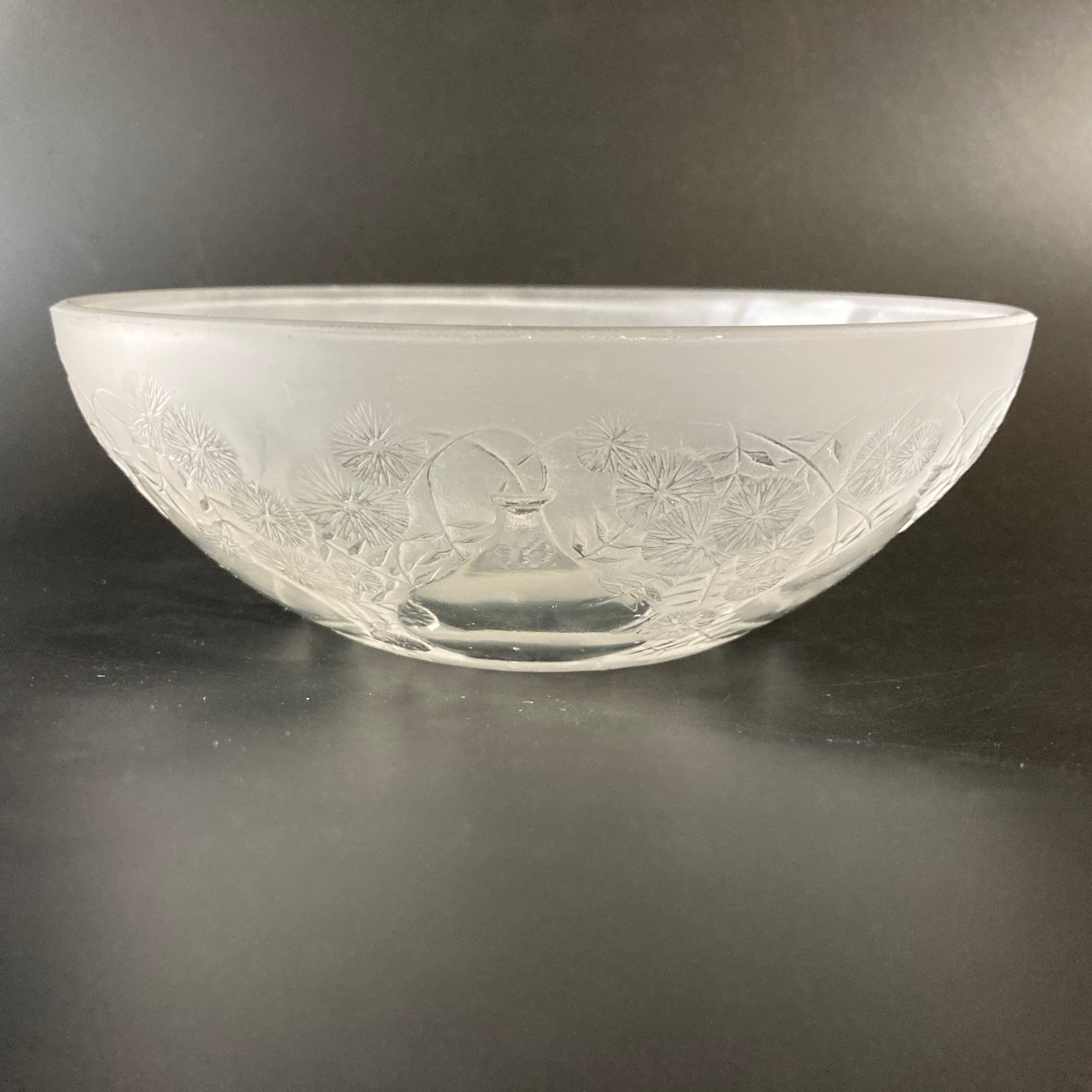 本品はルネ・ラリック作品で特徴的な美しいフロスト硝子による作品となり、より一層紋様が浮かび上がる素晴らしい作品となります。