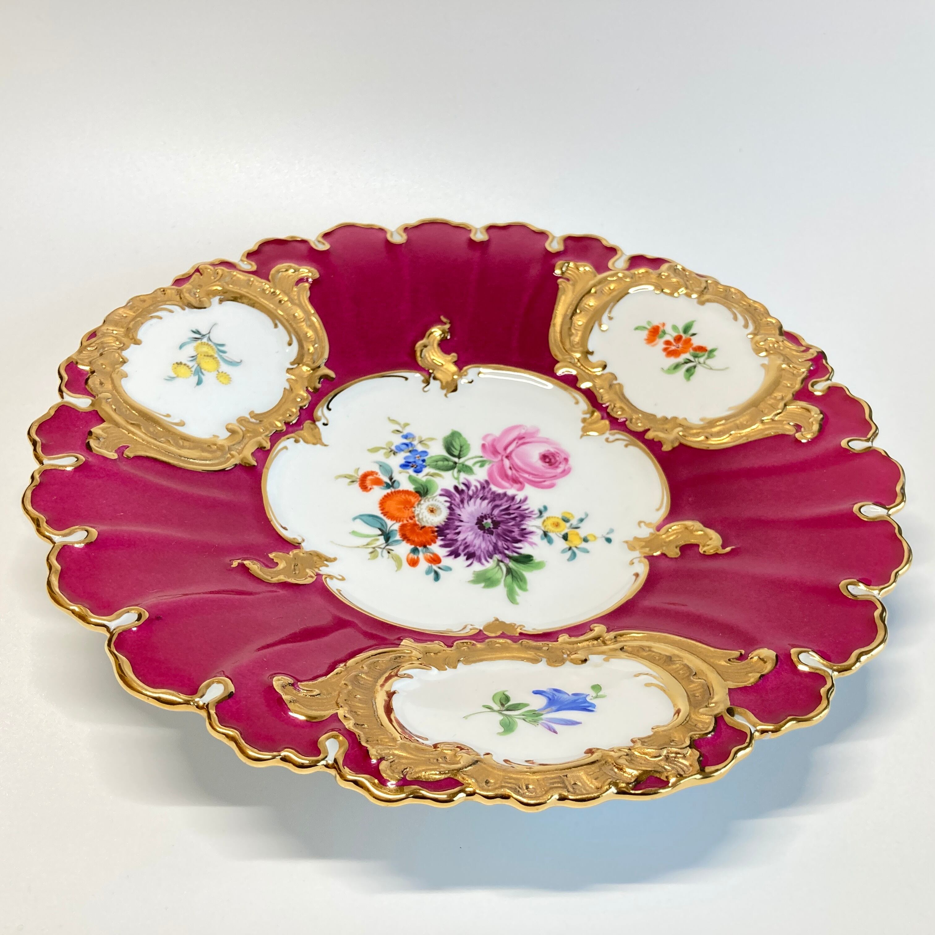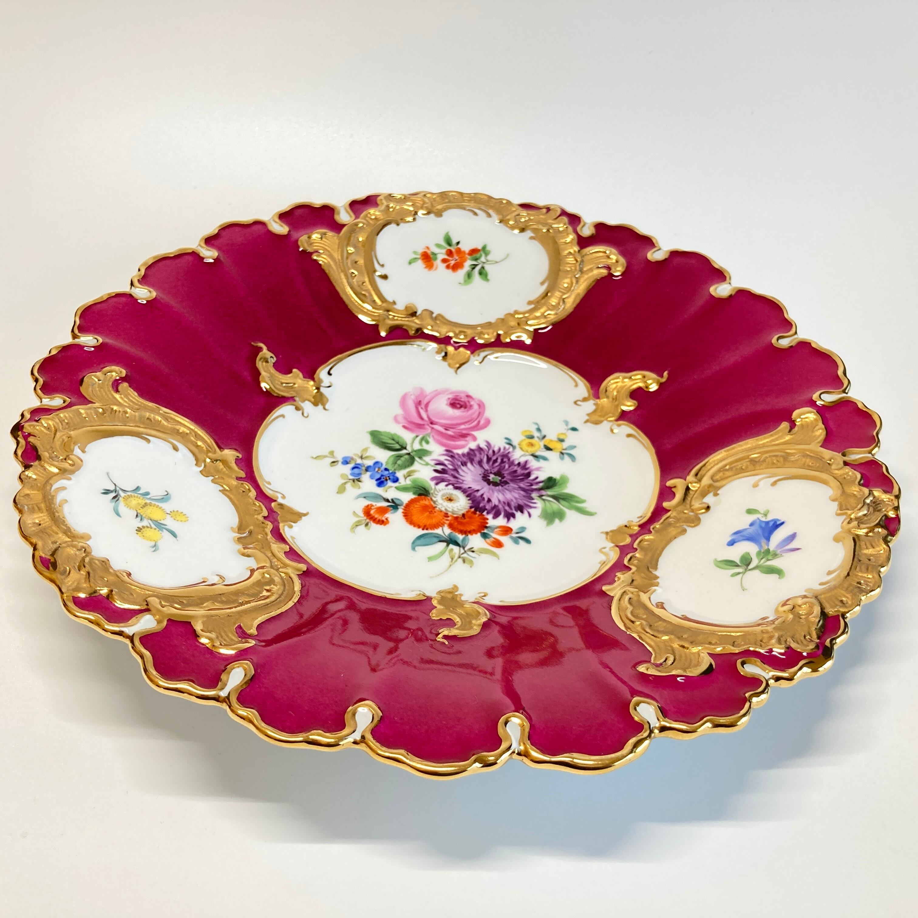 特注 マイセン Bフォーム 6つ花 金彩 グランツ ゴールド フラワーブーケ 飾り皿 大皿 プレート 24cm ワインレッド