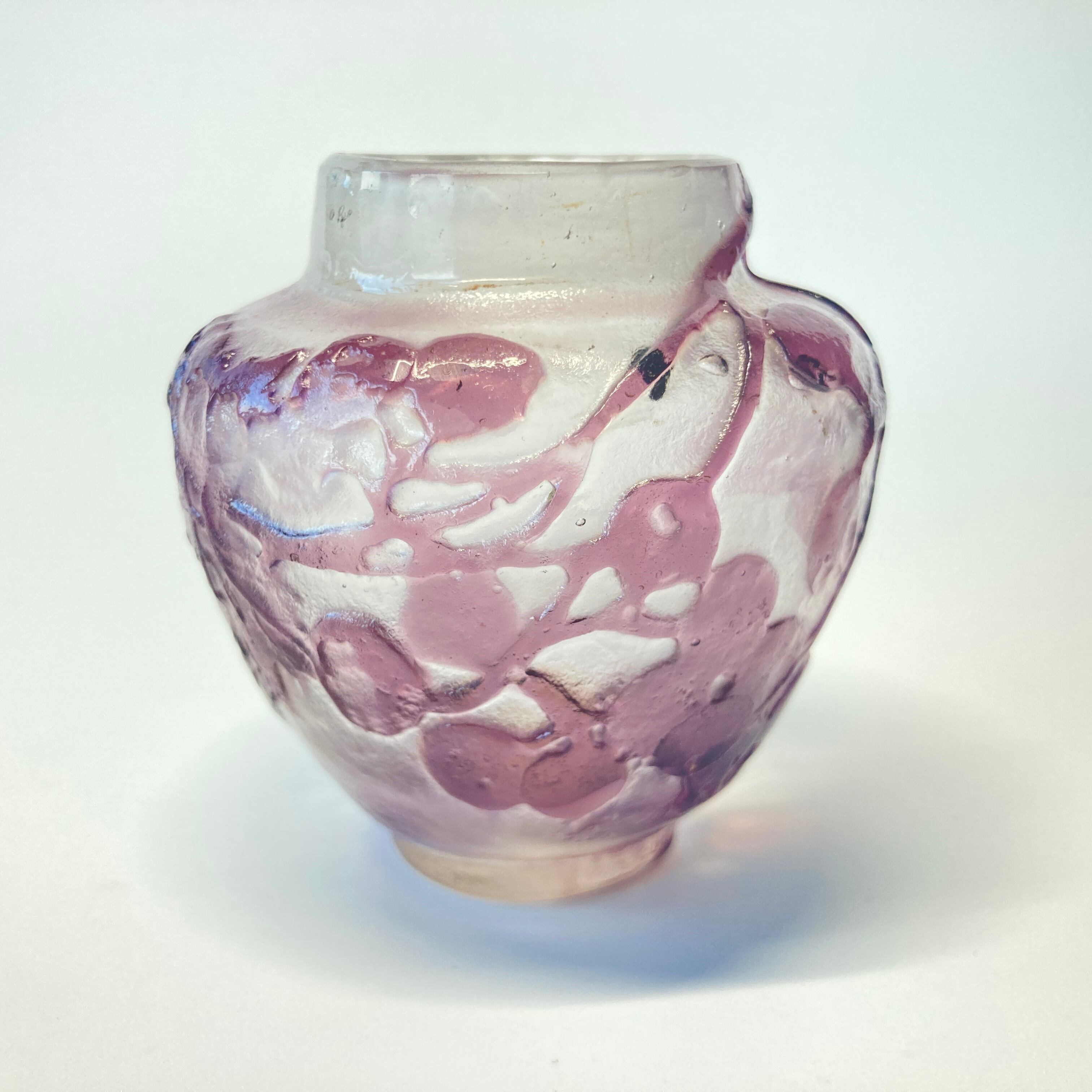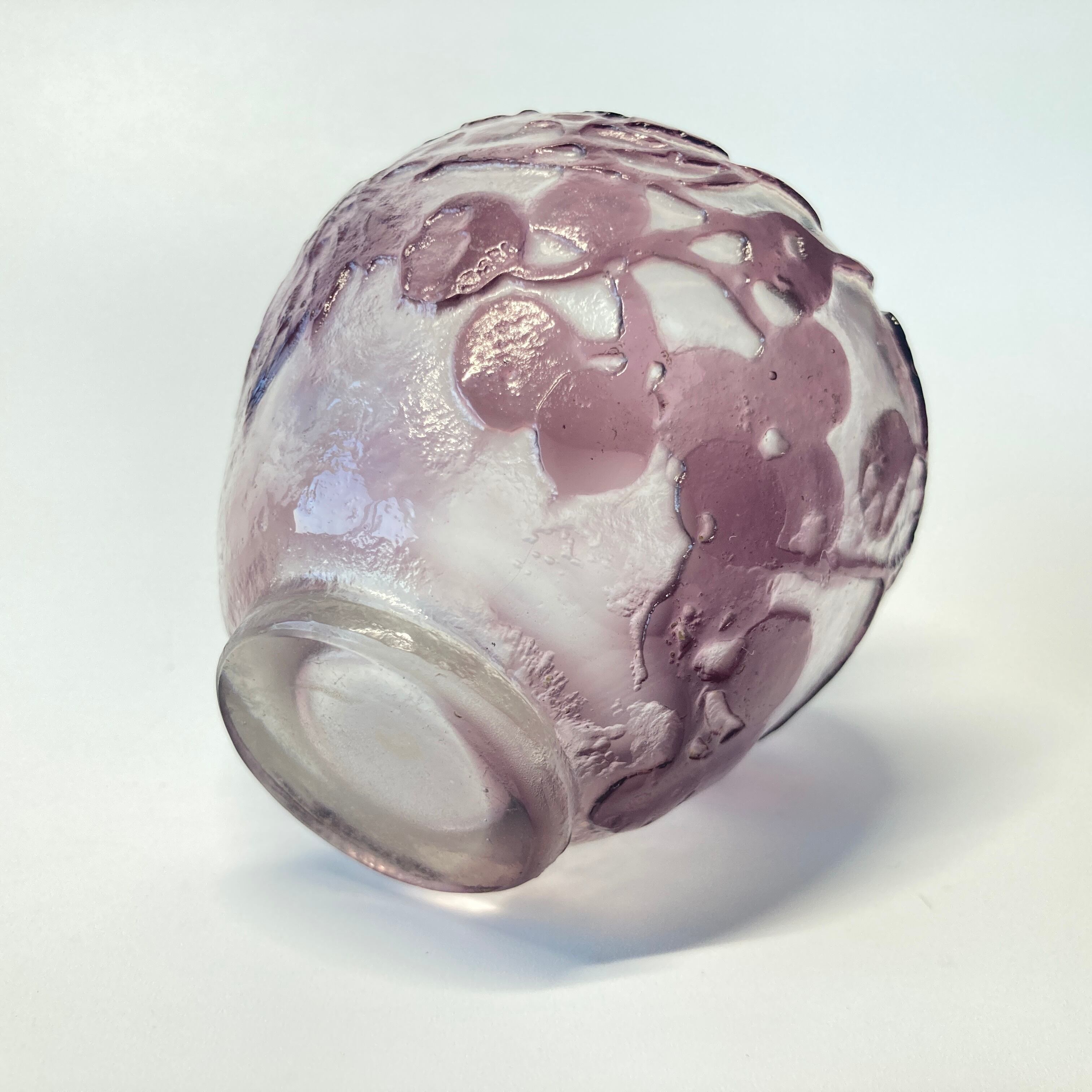 白濁のガラスに紫色の色硝子を重ね、酸化腐蝕彫りによるエッチングとアシッドによって葡萄のレリーフが花器全体に彫刻されています。