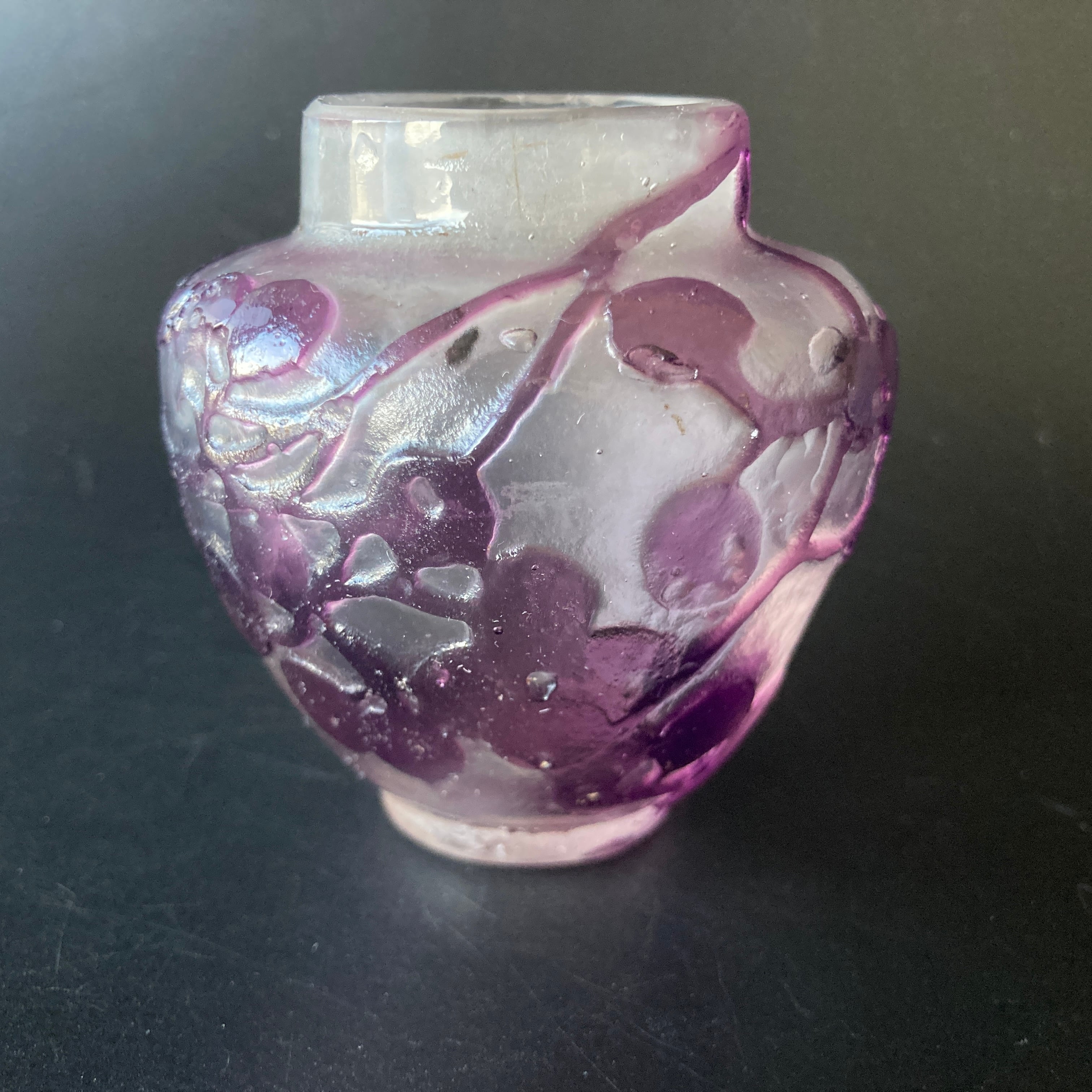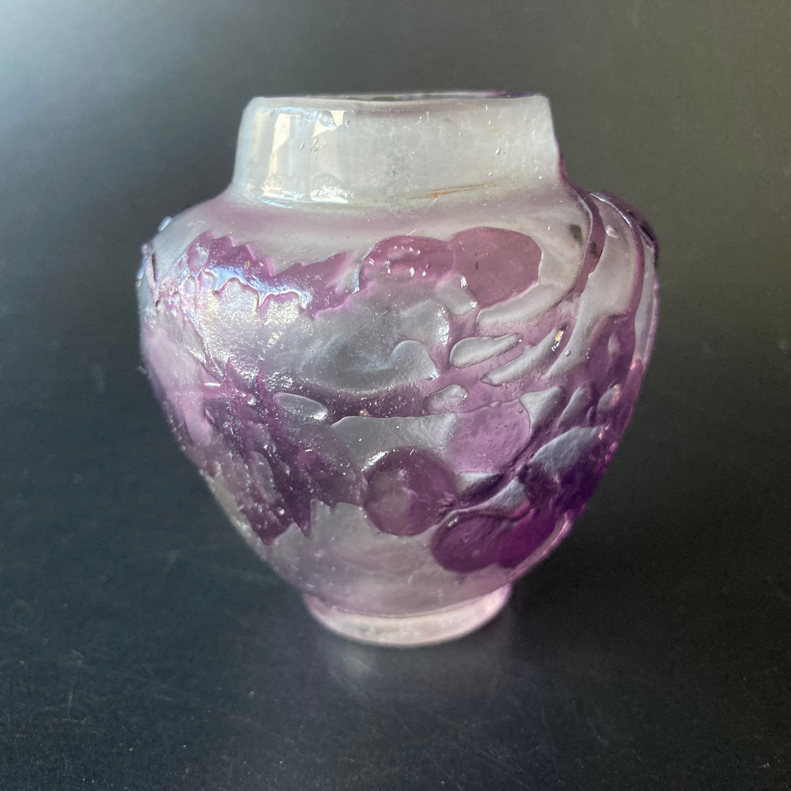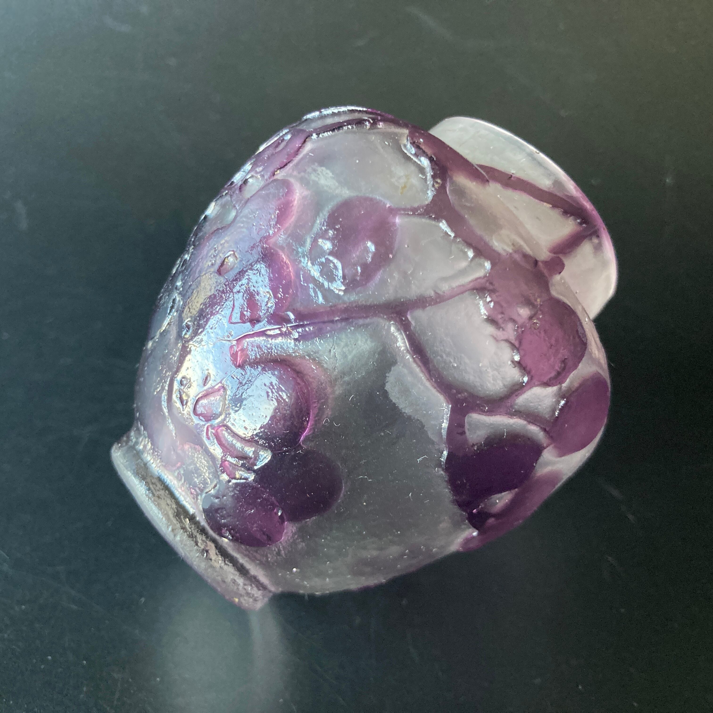 こちらはアールヌーヴォーを代表するガラス工芸家エミール・ガレ作、葡萄紋が施された小さな花瓶です。