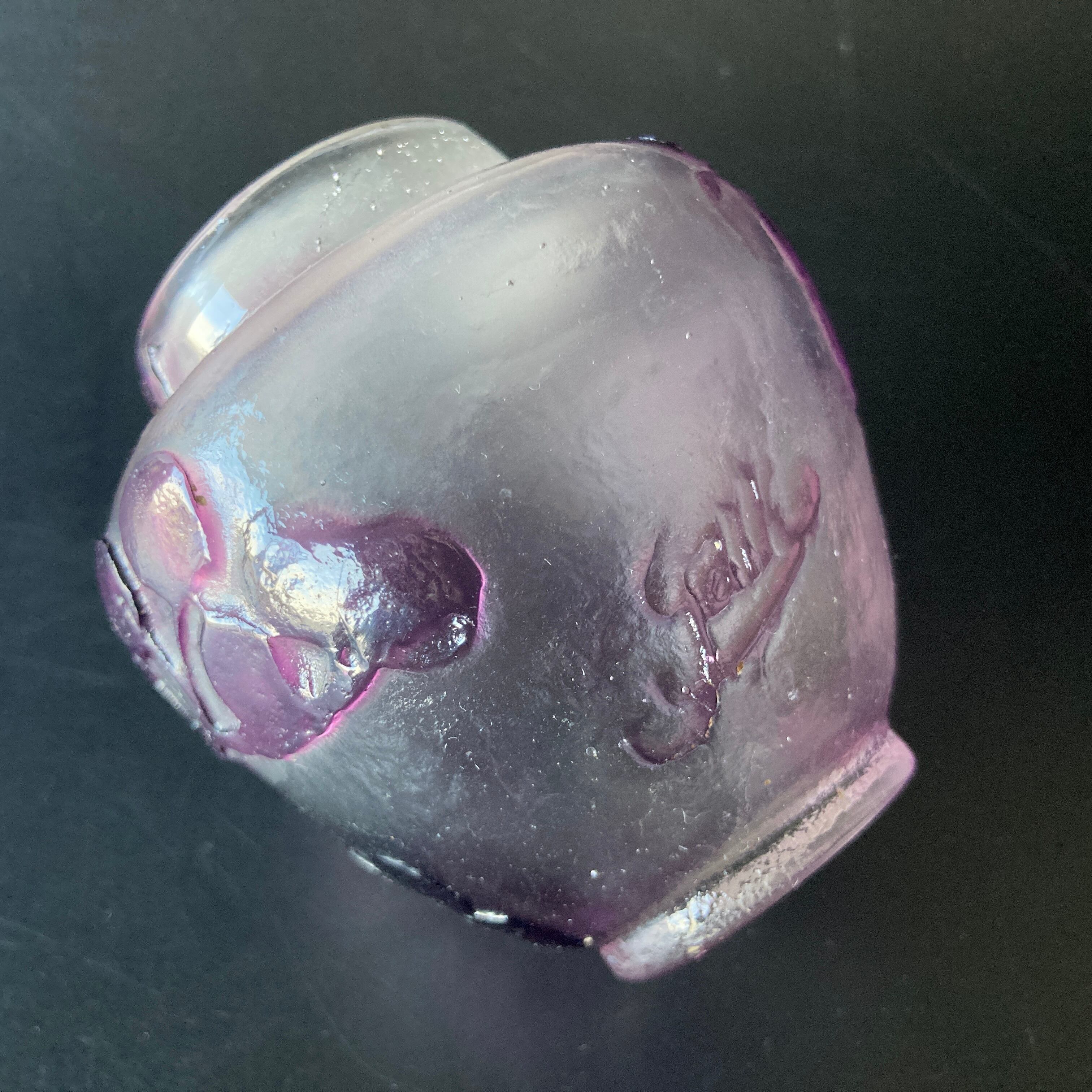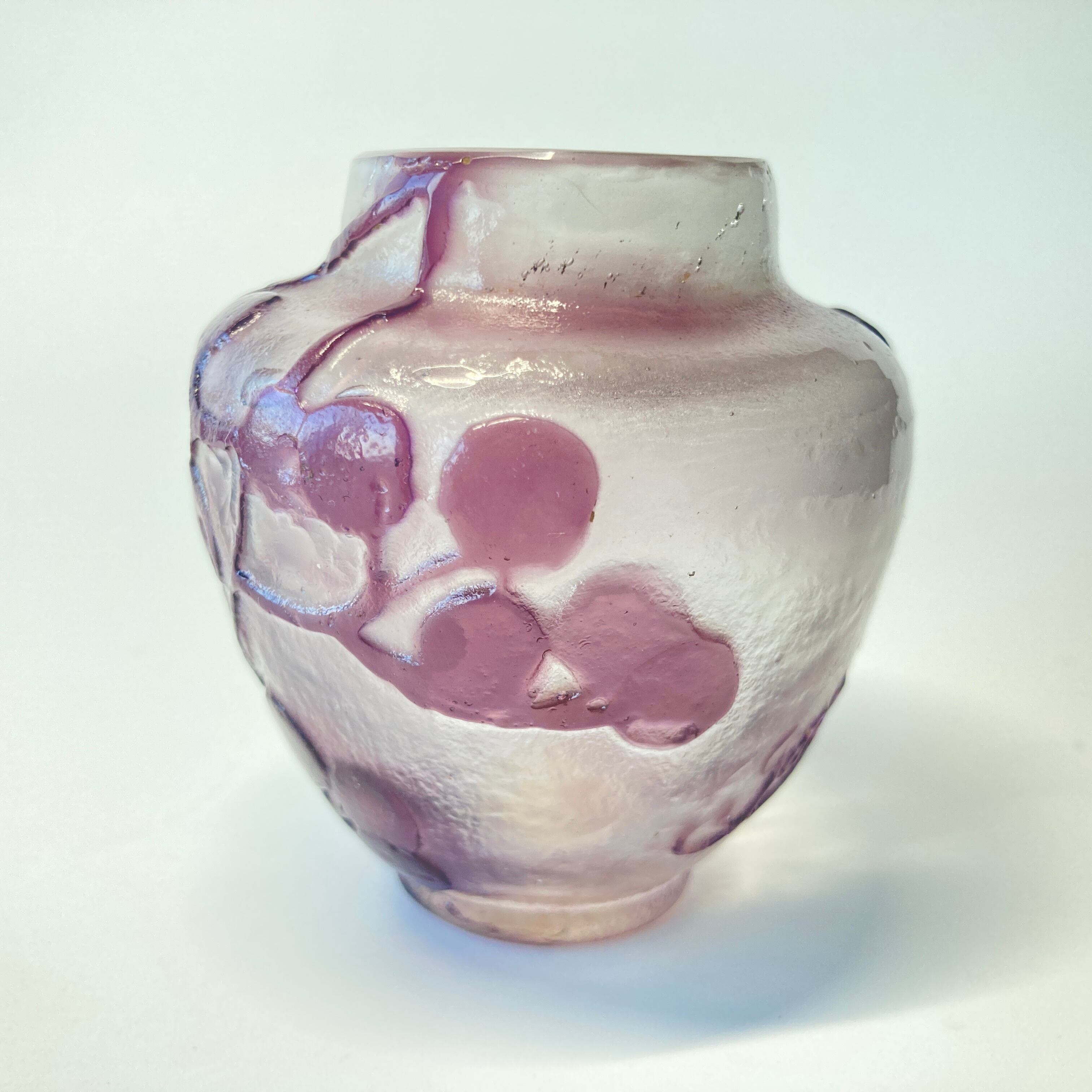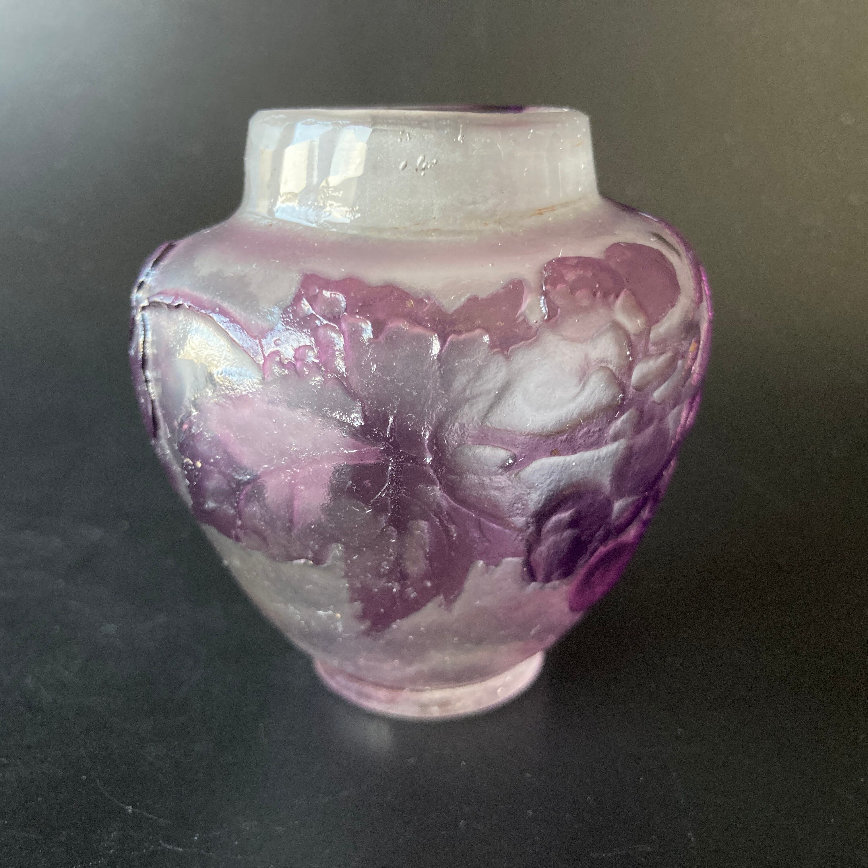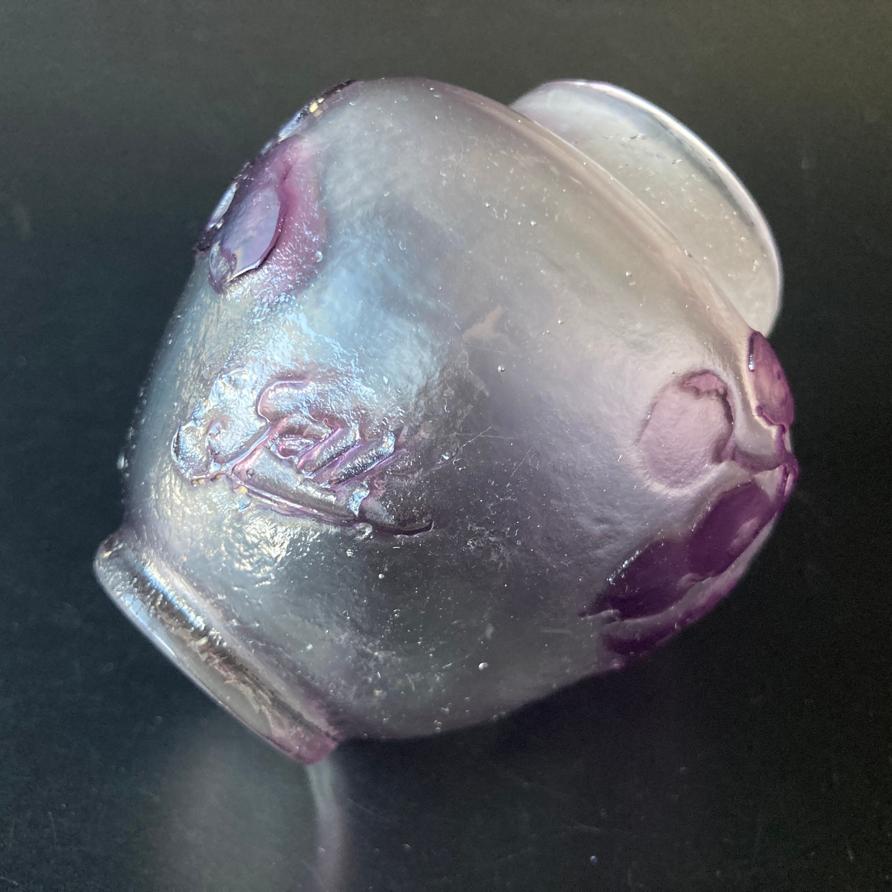 こちらはアールヌーヴォーを代表するガラス工芸家エミール・ガレ作、葡萄紋が施された小さな花瓶です。